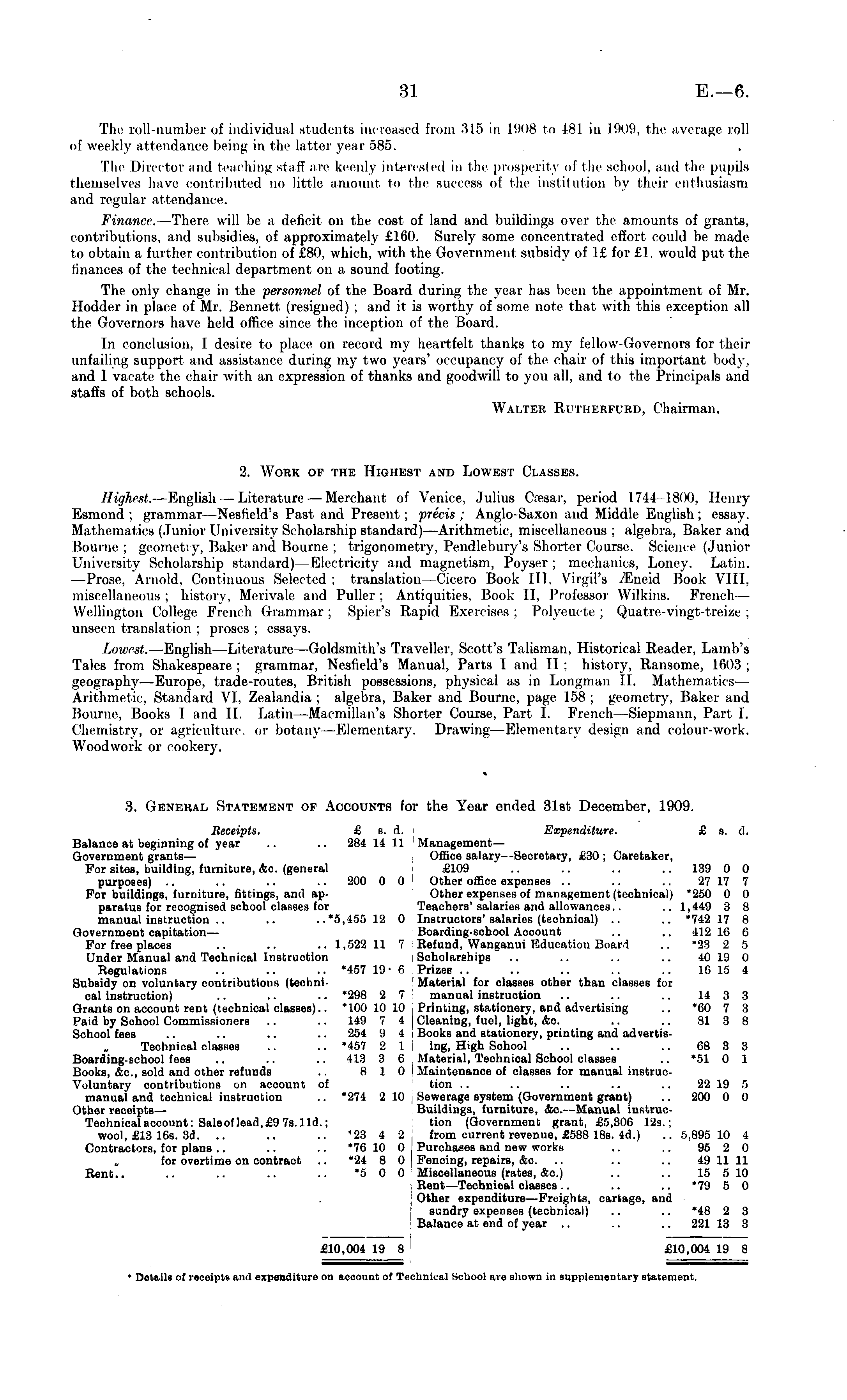The roll-number of individual students increased from 315 in 1908 to 481 in limn, the average roll of weekly attendance being in the latter year 585. The Director and teaching staff are keenly interested in the prosperity of the school, and the pupils themselves have contributed no little amount to the success of the institution by their enthusiasm and regular attendance. Finance. —There will be a deficit on the cost of land and buildings over the amounts of grants, contributions, and subsidies, of approximately £160. Surely some concentrated effort could be made to obtain a further contribution of £80, which, with the Government subsidy of 1£ for £1. would put the finances of the technical department on a sound footing. The only change in the personnel of the Board during the year has been the appointment of Mr. Hodder in place of Mr. Bennett (resigned) ; and it is worthy of some note that with this exception all the Governors have held office since the inception of the Board. In conclusion, I desire to place on record my heartfelt thanks to my fellow-Governors for their unfailing support and assistance during my two years' occupancy of the chair of this important body, and I vacate the chair with an expression of thanks and goodwill to you all, and to the Principals and staffs of both schools. Walter Rutherfurd, Chairman. 2. Work op the Highest and Lowest Classes. Highest. —English — Literature — Merchant of Venice. Julius Cnesar, period 1744-1800, Henry Esmond; gram mar -Nesh'eld's Past and Present; precis; Anglo-Saxon and Middle English; essay. Mathematics (Junior University Scholarship standard) —Arithmetic, miscellaneous ; algebra, Baker and Bourne; geometry, Baker and Bourne; trigonometry, Pendlebury's Shorter Course. Science (Junior University Scholarship standard) —Electricity and magnetism, Poyser ; mechanics, Loney. Latin. —Prose, Arnold, Continuous Selected ; translation—Cicero Book III. Virgil's iEneid Book VIII, miscellaneous ; history, Merivale and Puller ; Antiquities, Book II, Professor Wilkins. French— Wellington College French Grammar ; Spier's Rapid Exercises ; Polyeucte ; Quatre-vingt-treine ; unseen translation ; proses ; essays. Lowest. —English—Literature —Goldsmith's Traveller, Scott's Talisman, Historical Reader, Lamb's Tales from Shakespeare ; grammar, Nesfield's Manual, Parts I and II ; history, Ransome, 1603 ; geography —Europe, trade-routes, British possessions, physical as in Longman II. Mathematics Arithmetic, Standard VI, Zealandia ; algebra, Baker and Bourne, page 158; geometry, Baker and Bourne, Books I and II. Latin —Macmillan's Shorter Course, Part I. French—Siepmann, Part I. Chemistry, or agriculture, or botany —Elementary. Drawing —Elementary design and colour-work. Woodwork or cookery. 3. General Statement of Accounts for the Year ended 31st December, 1909. Receipts. £ s. d. i Expenditure. £ s. d. Balance at beginning of year .. .. 284 14 11 ; ManagementGovernment grants— Office salary—Secretary, £30 ; Caretaker, For sites, building, furniture, &c. (general £109 .. .. .. .. 139 0 0 purposes) .. .. .. .. 200 0 0 ( Other office expenses .. .. .. 27 17 7 For buildings, furniture, fittings, and ftp- Other expenses of management (technical) *250 0 0 paratus for recognised school classes for Teachers' salaries and allowances.. .. 1,449 3 8 manual instruction .. .. ..'5,455 12 0 Instructors'salaries (technioal) .. .. '742 17 8 Government capitation— Boarding-school Account .. .. 412 16 6 For free places .. .. .. 1,522 11 7 Kefund, Wanganui Education Board .. "23 2 5 Under Manual and Technical Instruction Scholarships .. .. .. .. 40 19 0 Eegulations .. .. .. "457 19- 6 Prizes .. .. .. .. .. 16 15 4 Subsidy on voluntary contributions (techni- Material for classes other than classes for cal instruction) .. .. .. *298 2 7 manual instruction .. .. .. 14 3 3 Grants on account rent (technical classes).. '100 10 10 Printing, stationery, and advertising .. *60 7 3 Paid by School Commissioners .. .. 149 7 4 | Cleaning, fuel, light, &o. .. .. 81 3 8 School fees .. .. .. .. 254 9 4 Books and stationery, printing and advertisTechnical classes .. .. '457 2 I ; ing, High Sohool ' .. .. .. 68 3 3 Boarding-school fees .. .. .. 413 3 6 Material, Teohnical School classes .. '51 0 1 Books, &c, sold and other refunds .. 8 1 0 i Maintenance of classes for manual instrueVoluntary contributions on account of tion .. .. .. .. .. 22 19 5 manual and technical instruction .. '274 2 10 Sewerage system (Government grant) .. 200 0 0 Other receipts— Buildings, furniture, &c.—Manual instrucTechnical account: Saleoflead, £9 7s. lid.; tion (Government grant, £5,30G 129.; wool, £13 16s. 3d. .. .. .. '23 4 2, from current revenue, £588 18s. 4d.) .. ft,895 10 4 Contractors, for plane .. .. .. *76 10 0 j Purchases and new works .. .. 95 2 0 for overtime on contraot .. *24 8 0 j Fencing, repairs, &o. .. .. .. 49 11 11 Rent.. .. .. .. .. '5 0 0 Miscellaneous (rates, &c.) .. .. 15 5 10 Rent—Technioal classes .. .. .. '79 5 0 Other expenditure—Freights, cartage, and sundry expenses (teebnical) .. .. *48 2 3 Balance at end of year .. .. .. 221 13 3 £10,004 19 8 £10,004 19 8 • Details of receipts and expenditure on account of Technical School are shown in supplementary statement.
