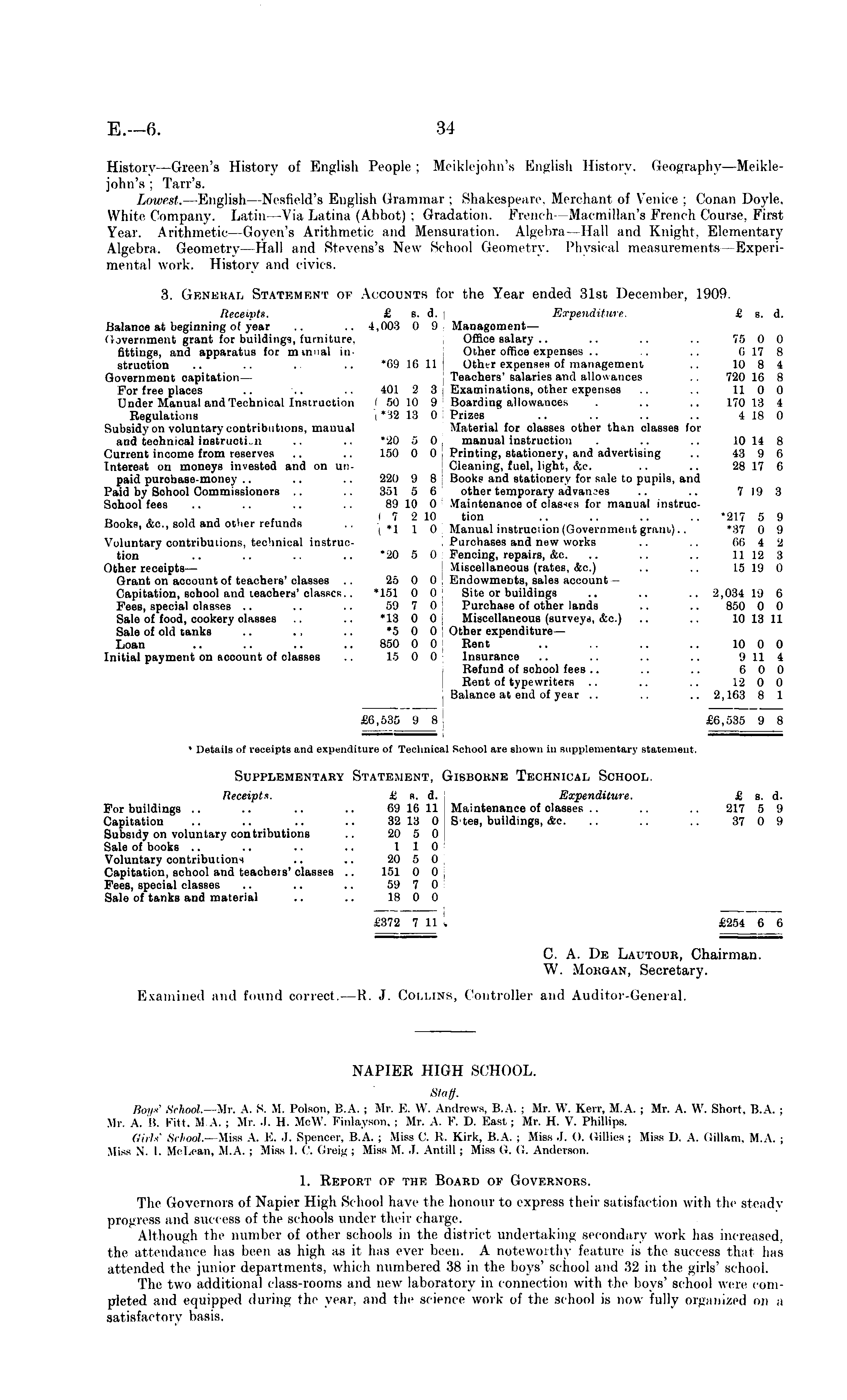 History —Green's History of English People ; Meiklejohn's English History. Geography—Meiklejohn's ; Tarr's. Lowest. —English —Nesfield's English Grammar ; Shakespeare, Merchant of Venice ; Conan Doyle. White Company. Latin —Via Latina (Abbot) ; Gradation. French Macmillan's French Course, Kirst Year. Arithmetic- — Goyen's Arithmetic and Mensuration. Algebra Hall and Knight, Elementary Algebra. Geometry Hull imd Stevens's New School Geometry. Physical measurements Experimental work. History and civics. 3. General Statement ok Accounts for the Year ended 31st December, 1909. Receipts. £ s. d. | Expenditure.. £ s. d. Balance at beginning of year .. .. 4,003 0 9 Managoment— (iovernment grant for buildings, furniture. Office salary .. .. .. .. 75 0 0 fittings, and apparatus for minnal in- Other office expenses .. .. .. 0 17 8 struction .. .. . .. *C9 16 11 | Other expenseH of management .. 10 8 4 Government capitation— Teachers' salaries and allowances .. 720 16 8 For free places .. .. .. 401 2 3 i Examinations, other expenses .. .. 11 0 0 Under Manual and Technical Instruction I 50 10 9 Boardiug allowances . .. .. 170 18 4 Regulations 1*32 13 0 Prizes ' .. .. .. .. 4 18 0 Subsidy on voluntary contributions, manual Material for classes other than classes for and technical instruction .. .. *20 5 0 manual instruction . .. .. 10 14 8 Current income from reserves .. .. 150 0 0 , Printing, stationery, and advertising .. 43 9 6 Interest on moneys invested and on liri- Cleaning, fuel, light, &e. .. .. 28 17 6 paid purchase-money .. .. .. 220 9 8 Books and stationery for sale to pupils, and Paid by Sohool Commissioners .. .. 351 5 6 other temporary advances .. .. 7 19 3 Sohool fees .. .. .. .. 89 10 0 Maintenance of classes for manual instrucBooks.&c, sold and other refunds .. Manual inetruc.Von (Government gram).." '87 0 9 Voluntary contributions, technical instrun- Purchases and new works .. .. 66 4 2 tion .. .. .. .. "20 5 0 Fencing, repairs, &c. .. .. .. 11 12 3 Other receipts— Miscellaneous (rates, &c.) .. .. 15 19 0 Grant on account of teachers'classes .. 25 0 0 ; Endowments, sales account - Capitation, school and teachers'classes.. *151 0 0: Site or buildings .. .. .. 2,034 19 6 Fees, special classes .. .. .. 59 7 0 Purchase of other lands .. .. 850 0 0 Sale of food, cookery olasses .. .. *13 0 0 Miscellaneous (surveys, &c.) .. .. 10 13 11 Sale of old tanks .. ., .. *5 0 0 Other expenditureLoan .. .. .. .. 850 0 0 Kent .. .. .. .. 10 0 0 Initial payment on account of classes .. 15 0 0 Insurance .. .. .. .. 9 114 Refund of school fees .. .. .. 6 0 0 Rent of typewriters .. .. .. 12 0 0 Balance at end of year .. .. .. 2,163 8 1 £6,535 9 8 £6,535 9 8 • Details of receipts and expenditure of Technical School are shown in supplementary statement. Supplementary Statement, Gisbokne Technical School. Receipts. £ r. d. i Expenditure. £ s. d. For buildings .. .. .. .. 69 16 11 Maintenance of classes .. .. .. 217 5 9 Capitation .. .. .. .. 32 13 0 S>tee, buildings, &c. .. .. .. 37 0 9 Subsidy on voluntary contributions .. 20 5 0 Sale of books .. .. .. .. 110 Voluntary contributions .. .. 20 5 0 Capitation, school and teachers' classes .. 151 0 0 Fees, special classes .. .. .. 59 7 0 Sale of tanks and material .. .. 18 0 0 £372 7 11 , £254 6 6 C. A. De Lautour, Chairman. W. Morgan, Secretary. Examined and found correct. —K. J. Collins, Controller and Auditor-General.
