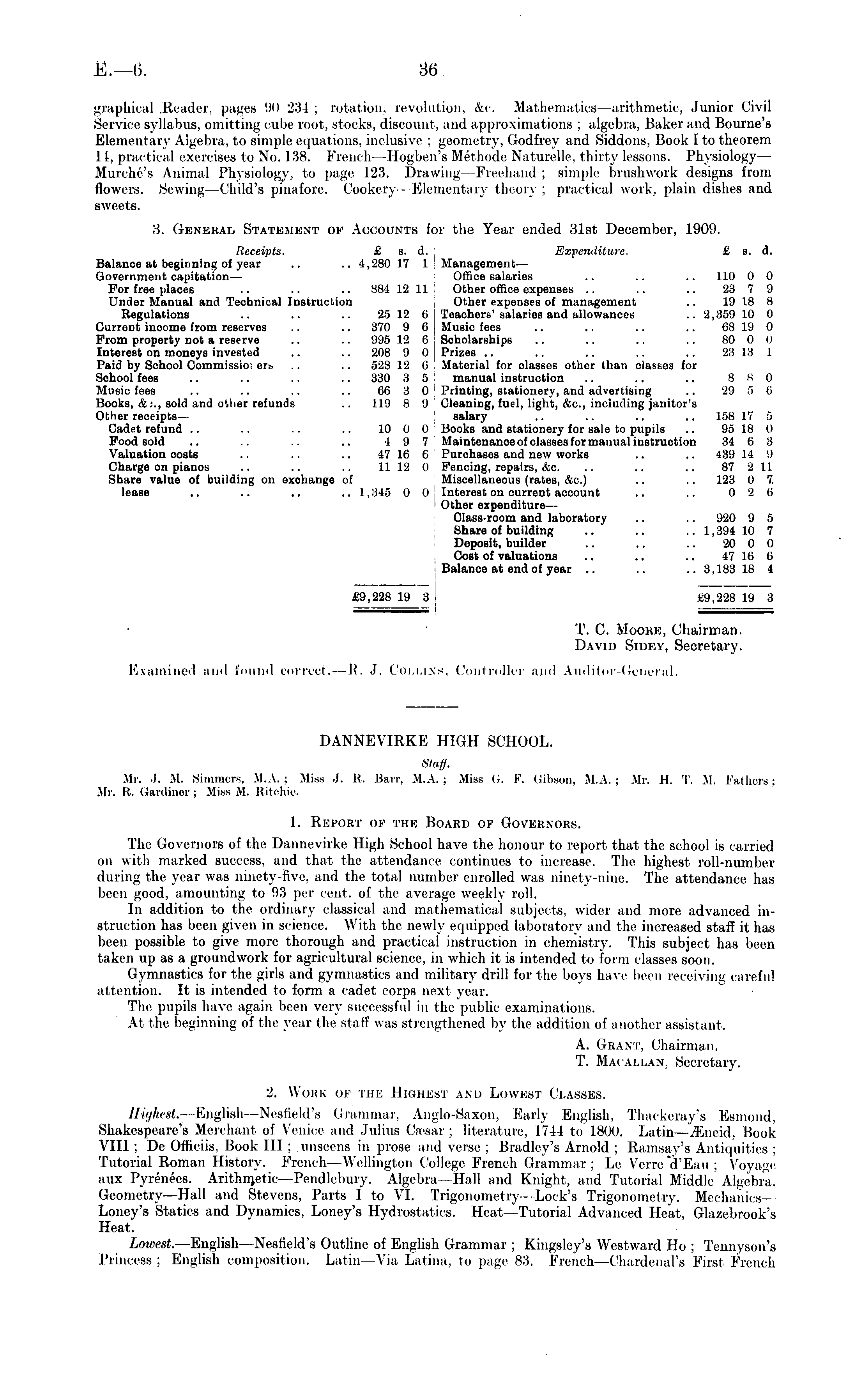 graphical .Reader, pages 'JO 234 ; rotation, revolution, &c. Mathematics—arithmetic, Junior Civil Service syllabus, omitting cube root, stocks, discount, and approximations ; algebra, Baker and Bourne's Elementary Algebra, to simple equations, inclusive ; geometry, Godfrey and Siddons, Book I to theorem 14, practical exercises to No. 138. French — Hogben's Methode Naturelle, thirty lessons. Physiology — Murche's Animal Physiology, to page 123. Drawing— Freehand ; simple brushwork designs from flowers. Sewing- -Child's pinafore. Cookery—Elementary theory ; practical work, plain dishes and sweets. 3. Gknkkal Statement of Accounts for the Year ended 31st December, 1909. Receipts. £ s. d. Expenditure. £ a. d. Balance at beginning of year .. .. 4,280 17 1 Management— Government capitation— Office salaries .. .. .. 110 0 0 For free places .. .. .. 884 12 11 Other office expenses .. .. .. 23 7 9 Under Manual and Technical Instruction Other expenses of management .. 19 18 8 Regulations .. .. .. 25 12 6 Teachers'salaries and allowances .. 2,359 10 0 Current income from reserves .. .. 370 9 6 Music fees .. .. .. .. 68 19 0 From property not a reserve .. .. 995 12 6 [ Scholarships .. .. .. .. 80 0 0 Interest on moneyB invested .. .. 208 9 0 Prizes .. .. .. .. .. 23 13 1 Paid by School Commission ers .. .. 528 12 G ! Material for elasses other than classes for Sohool fees .. .. .. .. 330 3 5 ! manual instruction .. .. .. 8 8 0 Music fees .. .. .. .. 66 3 0 Printing, stationery, and advertising .. 29 5 t> Books, &)., sold and other refunds .. 119 8 9 Cleaning, fuel, light, &c, including janitor's Otlier receipts— salary .. .. .. .. 158 17 0 Cadet refund .. .. .. .. 10 0 0 Books and stationery for sale to pupils .. 95 18 0 Food sold .. .. .. .. 4 9 7 Maintenance of classes for manual instruction 34 6 3 Valuation costs .. .. .. 47 16 6 Purchases and new works .. .. 439 14 9 Charge on pianos .. .. .. 11 12 0 Fencing, repairs, &o. .. .. .. 87 2 11 Share value of building on exchange of Miscellaneous (rates, &c.) .. .. 123 0 7. lease .. .. .. .. 1,345 0 o! Interest on current account .. .. 0 2 6 1 Other expenditure— Classroom and laboratory .. .. 920 9 5 Share of building .. .. .. 1,394 10 7 Deposit, builder .. .. .. 20 0 0 Cost of valuations .. .. .. 47 16 6 Balance at end of year .. .. .. 3,183 18 4 £9,228 19 3 £9,228 19 3 T. C. Mooke, Chairman. David Sidey, Secretary. Examined aud found correct. —R. J. Collins, Controller and Auditor-General.