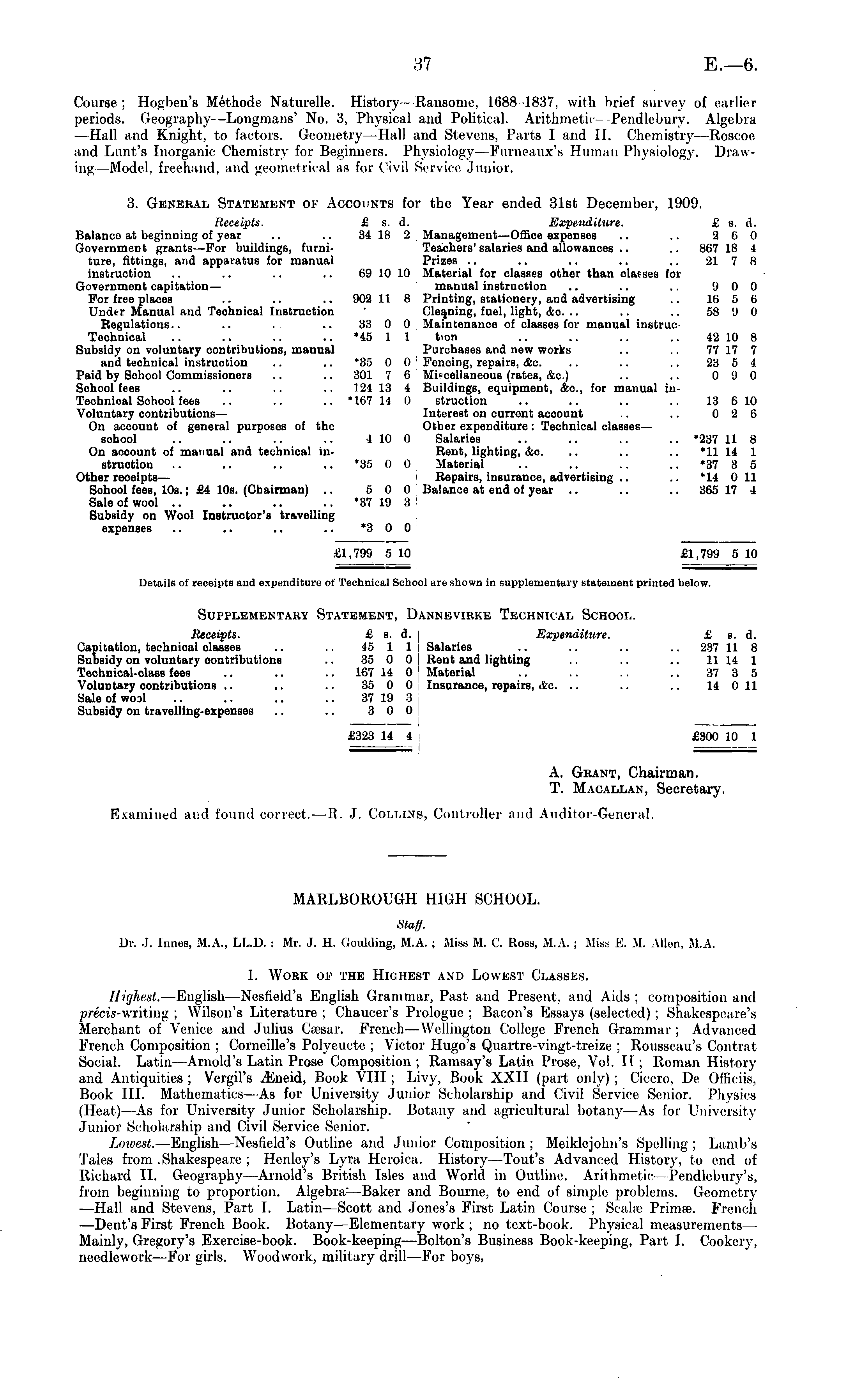 Course ; Hogben's Methode Naturelle. History—Raiisome, 1688-1837, with brief survey of earlier periods. Geography—Longmans' No. 3, Physical and Political. Arithmetic— Pendlebury. Algebra —Hall and Knight, to factors. Geometry —Hall and Stevens, Parts I and II. Chemistry—Eoscoe and Liuit's Inorganic Chemistry for Beginners. Physiology- Furneaux's Human Physiology. Drawing—Model, freehand, and geometrical as for Civil Service Junior. 3. Gknbral Statement of Accounts for the Year ended 31st December, 1909. Receipts. & s. d. Expenditure. £ e. d. Balance at beginning of year .. .. 34 18 2 Management—Office expenses .. .. 2 6 0 Government grants—For buildings, furni- Teachers'salaries and allowances .. .. 867 18 1 ture, fittings, and apparatus for manual Prizes .. .. .. .. .. 21 7 8 instruction .. .. .. .. 69 10 10 Material for classes other than classes for Government capitation— manual instruction .. .. .. 9 0 0 For free places .. .. .. 902 11 8 Printing, stationery, and advertising .. 16 5 6 Under Manual and Teohnical Instruction Cleaning, fuel, light, &c. .. .. .. 58 'J 0 Regulations.. .. . .. 33 0 0 Maintenance of classes for manual instrucTechnical .. .. .. .. '45 1 1 tion .. .. .. .. 42 10 8 Subsidy on voluntary contributions, manual Purchases and new works .. .. 77 17 7 and technical instruction .. .. *35 0 0 ; Fencing, repairs, &c. .. .. .. 23 5 4 Paid by Sohool Commissioners .. .. 301 7 6 Miscellaneous (rates, &c.) .. .. 0 9 0 School fees .. .. .. .. 124 13 4 Buildings, equipment, &c, for manual inTechnical School feea .. .. .. *167 14 0 struction .. .. .. .. 13 6 10 Voluntary contributions— Interest on current account .. .. 0 2 (3 On account of general purposes of the Other expenditure: Technical classesschool .. .. .. .. 4 10 0 Salaries .. .. .. .. *237 11 8 On account of manual and technical in- Rent, lighting, &o. .. .. .. *11 14 1 struotion .. .. .. .. '35 0 0 Material .. .. .. *37 3 5 Other reoeipts— Repairs, insurance, advertising .. .. *14 0 11 Sohool fees, 10s.; £4 10s. (Chairman) .. 5 0 0 Balance at end of year .. .. .. 365 17 4 Sale of wool .. .. .. '37 19 3 Subsidy on Wool Instructor's travelling expenses .. .. .. .. *3 0 0 £1,799 5 10 £1,799 5 10 Details of receipts and expenditure of Technical School are shown in supplementary statement printed below. Supplementary Statement, Dannevirkb Technical School. Receipts. £ s. d. Expenditure. £ s. d. Capitation, technical classes .. .. 45 1 1 Salaries .. .. .. .. 237 11 8 Subsidy on voluntary contributions .. 35 0 0 Rent and lighting .. .. .. 11 14 1 Teohnical-class fees .. .. .. 167 14 0 Material .. .. .. .. 37 3 5 Voluntary contributions .. .. .. 35 0 0 Insurance, repairs, &c. .. .. .. 14 0 11 Sale of wool .. .. .. .. 37 19 3 Subsidy on travelling-expenses .. .. 3 0 0 £323 14 4 £300 10 1