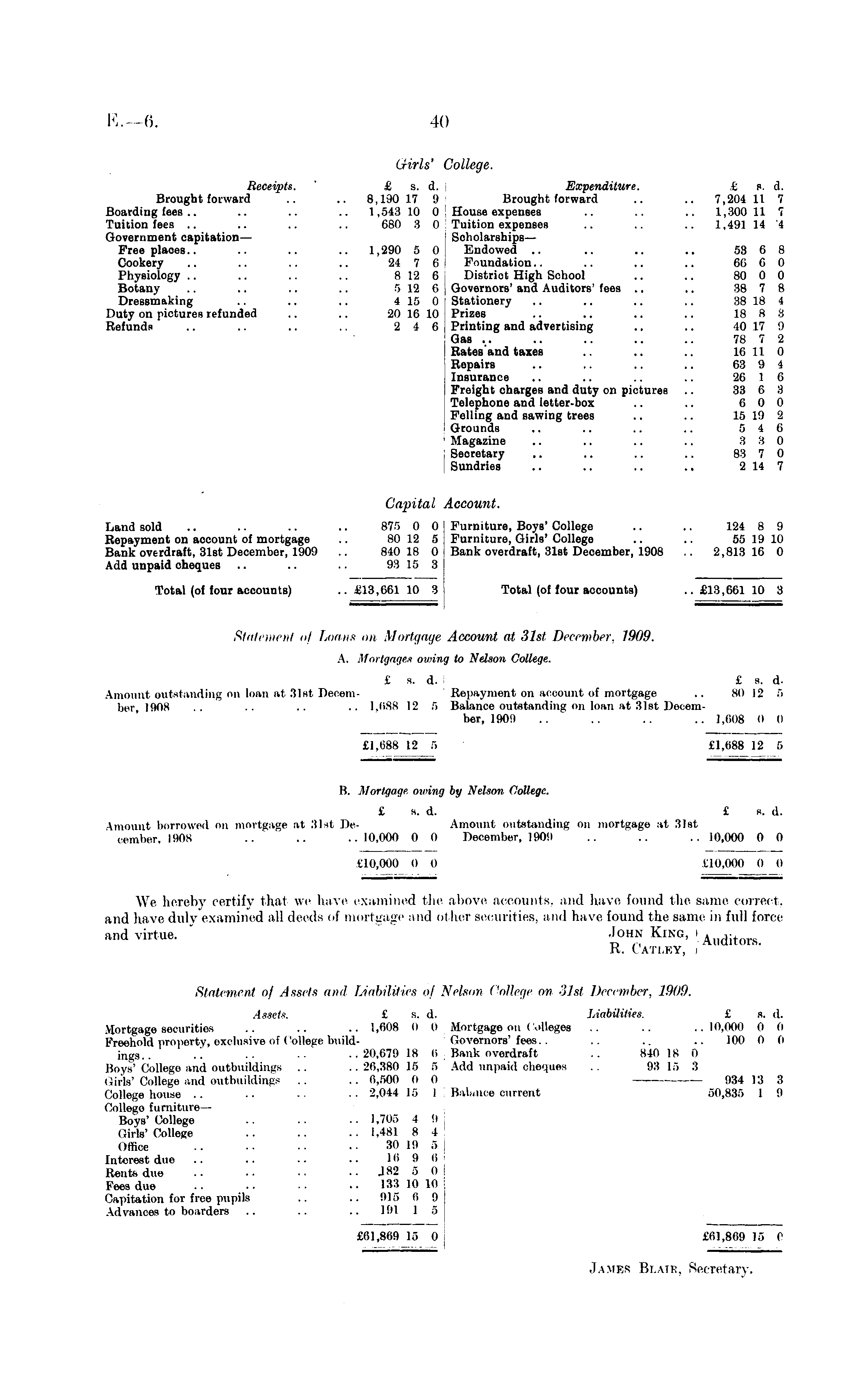 (jirls' College. Receipts. £ s. d. Expenditure. t c d. Brought forward .. .. 8,190 17 0 Brought forward .. .. 7,204 11 7 Boarding fees .. .. .. .. 1,543 10 0 House expenses .. .. .. 1,300 11 7 Tuition fees .. .. .. .. 680 8 0 Tuition expenses .. .. .. 1,491 14 4 Government capitation— Scholarships— Freeplaoes.. .. .. .. 1,290 5 0 Endowed .. .. .. .. 58 6 8 Cookery .. .. .. .. 24 7 6 Foundation.. .. .. .. 66 6 0 Physiology .. .. .. .. 8 12 6 , District High School .. .. 80 0 0 Botany .. .. .. .. 512 6 Governors' and Auditors' fees .. .. 38 7 8 Dressmaking .. .. .. 415 0 I Stationery .. .. .. .. 38 18 4 Duty on pictures refunded .. .. 20 16 10 Prizes .. .. .. .. 18 8 3 Refunds .. .. .. .. 2 4 6 Printing and advertising .. .. 40 17 9 Gas .. .. .. .. .. 78 7 2 Rates and taxes .. .. .. 16 11 0 Repairs .. .. .. .. 63 9 4 Insurance .. .. .. .. 26 1 6 Freight charges and duty on pictures .. 33 6 3 Telephone and letter-box .. .. 6 0 0 Felling and sawing trees .. .. 15 19 2 Grounds .. .. .. .. 5 4 6 1 Magazine .. .. .. .. 3 3 0 Secretary .. .. .. .. 83 7 0 Sundries .. .. .. .. 2 14 7 Capital Account. Land sold .. .. .. .. 875 0 0 Furniture, Boys' College .. .. 124 8 9 Repayment on account of mortgage .. 80 12 5 Furniture, Girls' College .. .. 55 19 10 Bank overdraft, 31st December, 1909 .. 840 18 0 Bank overdraft, 31st December, 1908 .. 2,813 16 0 Add unpaid cheques .. .. .. 93 15 3 Total (of four accounts) ..£13,66110 3 Total (of four accounts) ..£13,66110 8 Statement i>l Leans mi Mortgage Account at 31st December, 1909. A. Mortgages owing to Nelson College. c c. a. I £ a. d. Amount outstanding on loan at 31et Deoem- Repayment on account of mortgage .. 80 12 fl bur ]iK)B .. .. .. .. 1,688 12 6 Balance outstanding on loan at 31st December, 190S1 .. .. .. .. 1,608 0 0 £1,688 12 f> ■ £1,688 12 5 B. Mortgage, owing by Nelson College. £ s. d. £ R. d. Amount borrowed on mortgage .it ."! Ist De- Amount outstanding on mortgage :it 31st oember, I9OS .. .. ..10,000 0 0 December, 190! I .. .. .. 10,000 0 0 £10,000 (I 0 £10,000 0 0 Wβ hereby certify thai we have examined the above accounts, and have found the same correct, and have duly examined all deeds of mortgage and oi her securities, and have found the same in full force and virtue. ' John King, i. AuditorgK. Catlbt, i Statement of Assets and Liabilities of Nelson College on 31st December, I'M)'.). Assets. £ s. d. Liabilities. £ s. il. Mortgage securities .. .. .. 1,608 0 0 Mortgage nit Colleges .. .. ..10,000 0 (I Freehold property, exclusive of College build- ( luvernors' fees.. .. .. .. 100 0 0 i ngs .. .. .. . ..20,679 18 <> Bank overdraft .. 840 18 0 Boys' Collego a.nd outbuildings .. ..26,380 15 5 Add unpaid cheques .. 93 16 .'i (iirls' College «.nd outhuildings .. .. 6,500 0 0 934 1:1 3 College house .. .. ■• •■ 2,044 16 ] Balance ourrent 50,835 1 !l Collego furnitureBoys' College .. .. •■ 1,705 4 9 I (Jirls' College .. .. .. 1.481 8 4 Office .. .- •• •■ 30 lit .-> Interest due .. .. .. .. 16 9 6 Rents due JB2 5 0 Fees due . • • • ■ • • • 133 10 10 Capitation for free pupils .. .. 015 6 9 Advances to boarders .. .. .. 101 1 6 £61,869 15 0 £61,869 15 0 Jambs Bi.atr, Secretary.