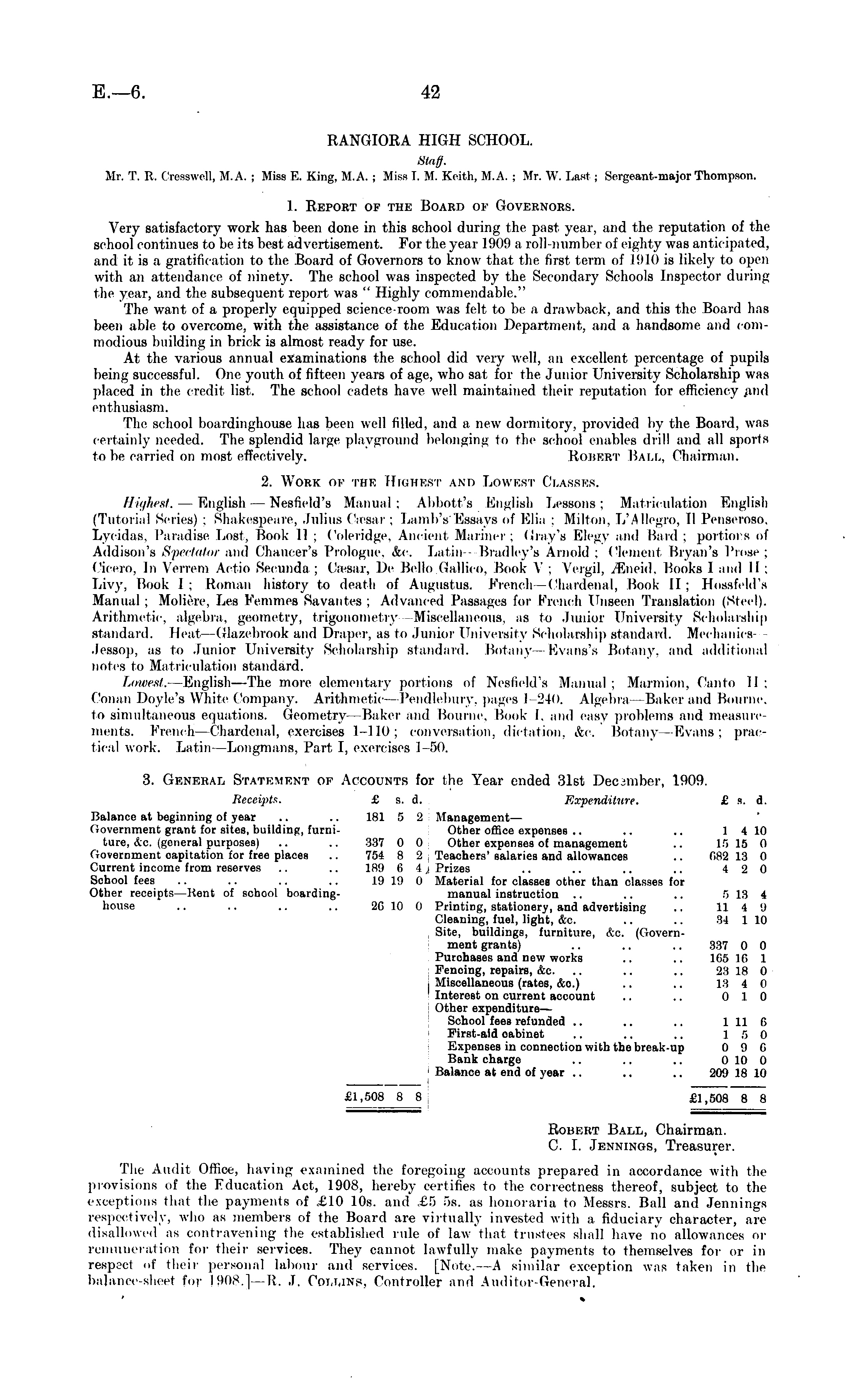 RANCxIORA HIGH SCHOOL. Staff. Mr. T. R. C'resswell, M.A. ; Miss E. King, M.A. ; Miss I. M. Keith, M.A. : Mr. W. Last ; Sergeant-major Thompson. 1. Report op the Board of Governors. Very satisfactory work has been done in this school during the past year, and the reputation of the school continues to be its besi advertisement. For the year 1909 a roll-number of eighty was anticipated, and it is a gratification to the Board of Governors to know thai the first term of 1910 is likely to open with an attendance of ninety. The school was inspected by the Secondary Schools Inspector dining tbe year, and the subsequent report was " Highly commendable." The want of a properly equipped science-room was felt to be a drawback, and this the Board has been able to overcome, with the assistance of the Education Department, and a handsome and commodious building in brick is almost ready for use. At the various annual examinations the school did very well, an excellent percentage of pupils being successful. One youth of fifteen years of age, who sat for the Junior University Scholarship was placed in the credit list. The school cadets have well maintained their reputation for efficiency and enthusiasm. The school boardinghouse has been well filled, and a new dormitory, provided by the Board, was certainly needed. The splendid large playground belonging to the school enables drill and all sports to be carried on most effectively. Robert Ball, Chairman. 2. Work of the Highest and Lowest Classes. Highest. — English — Nesfield's Manual : Abbott's English Lessons ; Matriculation English (Tutorial Series) : Shakespeare. Julius Caesar : Lamb's' Essays of Eliu : .Milton. L'Allegro, II Penseroso, Lycidas, Paradise Lost. Hook II ; Coleridge, Ancient Mariner: Gray's Elegy and Bard : portiors of Addison's Spectator and Chaucer's Prologue, &c. Latin Bradley's Arnold; Clement Bryan's Prose; Cicero. In Verrein Aetio Seeunda : C;esar. De liello Gallico, Book V ; Vergil, .Kneid. Books I and II : Livy, Book I: Roman history to death of Augustus. French Chardenal, Book II: Hoesfeld's Manual : Moliere. Les I'Vnmies Savanles : Advanced Passages for French Unseen Translation (Steel). Arithmetic, algebra, geometry, trigonometry Miscellaneous, as to Junior University Scholarship standard. Ileal Glazebrook and Draper, as to Junior University Scholarship standard. Mechanics Jessop, as to Junior University Scholarship standard. Botany Evans's Botany, and additional notes to Mai riculai ion standard. Lowe**.—English —The more elementary portions of Nesfield's Manual; Marmion, Canto II: Coiiaii Doyle's White-Company. Arithmetic Pendlebury, pages I 240. Algebra Baker and Bourne. to simultaneous equations. Geometry Baker and Bourne, Book Land easy problems and measure menis. French Chardenal. exercises 1—110; conversation, dictation, <fee. Botany Evans; practical work. Latin Longmans. Part f, exercises 1-50. 3. General Statement of Accounts for the Year ended 31st Decimber, 1909. Receipt!:. £ s. d. Expenditure. £ a. d. Balance at beginning of year .. .. 181 5 '2 Management— Government grant for sites, building, furni- Other office expenses .. .. .. 1 4 10 ture, &o. (general purposes) .. .. 337 0 0 Other expenses of management .. IS 15 0 Government oapitation for free places .. 754 8 2 Teachers' ealaries and allowances .. OR2 13 0 Current income from reserves .. .. 189 6 4 > Prizes .. .. .. .. 4 2 0 School fees .. .. .. .. 19 19 0 Material for classes other than classes for Other receipts—Kent of school boarding- manual instruction .. .. .. 5 13 4 house .. .. .. .. 2G 10 0 Printing, stationery, and advertising .. 114 9 Cleaning, fuel, light, &c. .. .. 34 1 10 Site, buildings, furniture, etc. (Government grants) .. .. .. 337 0 0 Purchases and new works .. .. 105 10 1 Fencing, repairs, &c. .. .. .. 23 18 0 • Miscellaneous (rates, &o.) .. .. 13 4 0 Interest on current account .. .. 0 10 Other expenditure— School fees refunded .. .. .. 1 11 0 First-aid cabinet .. .. .. 15 0 Expenses in connection with the break-up 0 9 0 Bank charge .. .. .. 0 10 0 Balance at end of year .. .. .. 209 18 10 £1,508 8 8 £1,508 8 8 Robert Ball, Chairman. C. I. Jennings, Treasurer. The Audit Office, having examined the foregoing accounts prepared in accordance with the provisions of the Education Act, 1908, hereby certifies t<> Hie correctness thereof, subject to the exceptions that the payments of £10 10s. and £5 -"is. as honoraria to Messrs. Ball and Jennings respectively, who as members of the Board are virtually invested with a fiduciary character, are disallowed as contravening the established rule of law that trustees shall have no allowances or remuneration for their services. They cannot lawfully make payments to themselves for or in respect of their personal labour and services. [Note. —A similar exception was taken in the balance-sheet for 1908.] I!. J. Cou.ink, Controller and Auditor-General,