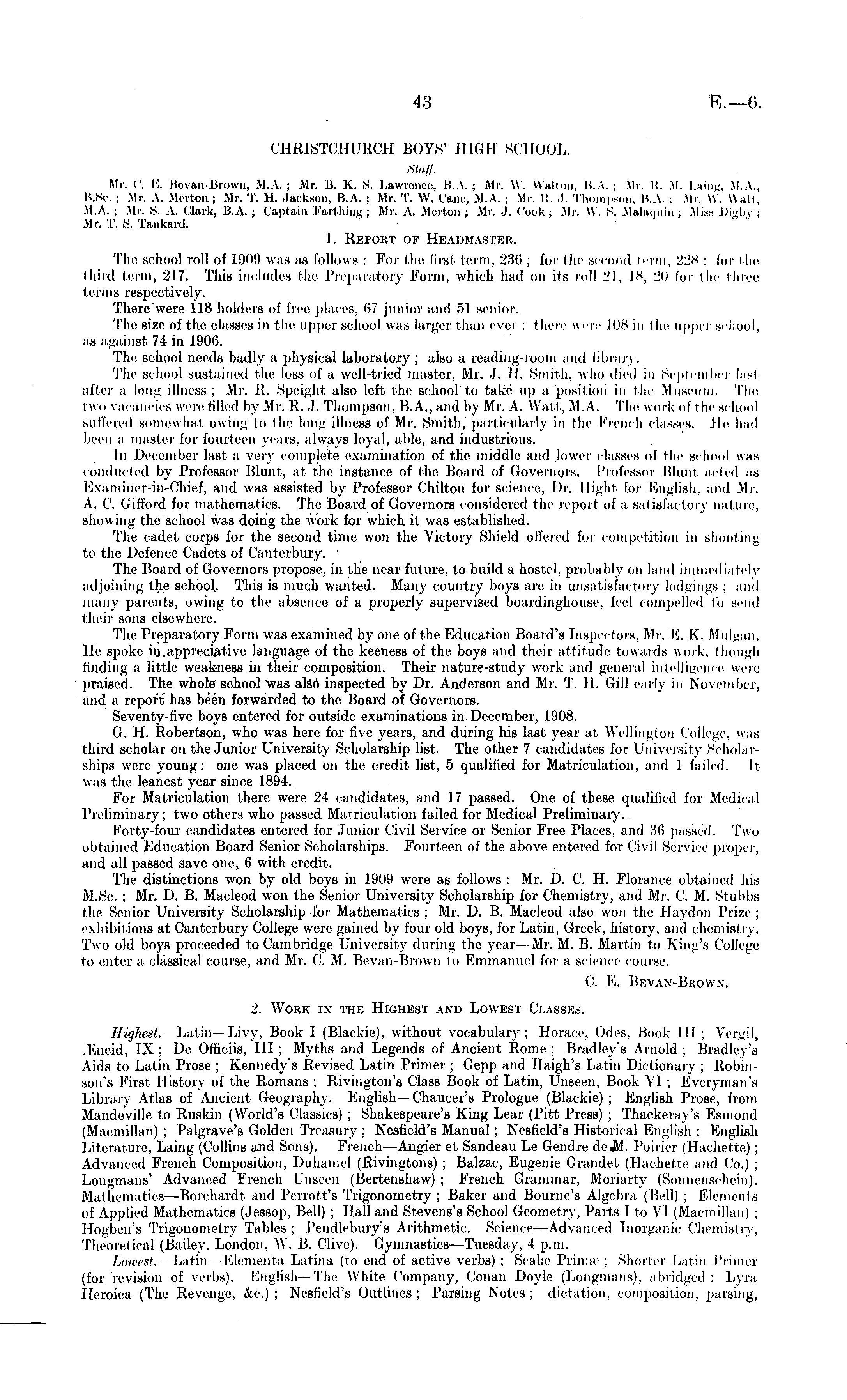 CHRISTCHURCH BOYS' HIGH SCHOOL. Staff. Mi. (. K. Bevan-Brown, M.A. j Mr. I!. £S. Lawrence, 8.A.; Mr. W. Walton, 8.A.; Mr. R. M. Laing, M.A., B.Sc. ; Mr. A. Merton ; Mr. I. 11. Jackson, B.A. : Mr. '!'. W. Cain-. M.A. ; Mr. R. J. Thompson, B.A. ; Mr. W. Watt, .MA. : Mr. 8. A. Clark, 8.A.; Captain Farthing ; Mr. A. Merton ; Mr. J. Cook; Mr. W. S. Malaquiu ; Mia Digby ; Mr. T. 8. Tankard. 1. Report of Headmaster. The school roll of 1909 was as follows : For the first term, 236 : Eor the second term, 228 ; for the third term, 217. Tliis includes the Preparatory Form, which bad on its roll 21, 18, 20 for the three terms respectively. There were IJB holders of free places, i>7 junior and 51 senior. The size of the classes in the upper school was larger than ever : there were 108 in the upper school, as against 74 in 1906. The school needs badly a physical laboratory ; also a reading-room and library. The school sustained the loss of a well-tried master, Mr. J. 11. Smith, who died in September last after a long illness; Mr. It. Speight also Left the school to lake up a positioii in the .Museum. The two vacancies were tilled by Mr. l>. .1. Thompson, l>. A., and l>\ Mr. A. Watt, MA. The work of the school suffered somewhat owing to the long illness of Mr. Smith, particularly in the French classes, lie had been a master for fourteen years, always loyal, able, arid industrious. In December last a very complete examination of the middle and lower classes of the school was conducted by Professor Blunt, at the instance of the Board of Governors. Professor Blunt acted as Examiner-in-Chief, and was assisted by Professor Chiltoc for science, Dr. High! for English, and Mr. A. ('. Gifford for mathematics. The Board of Governors considered the report of a satisfactory nature, showing the school was doing the work for which it was established. The cadet corps for the second time won the Victory Shield offered for competition in shooting to the Defence Cadets of Canterbury. The Board of Governors propose, in the near future, to build a hostel, probably od land immediately adjoining the school.. This is much wanted. Many country boys are in unsatisfactory lodgings : and many parents, owing to the absence of a properly supervised boardinghouse. feel compelled to send their sons elsewhere. The Preparatory Form was examined by one of the Education Board's Inspectors, Mr. E. K. Mulgan. Me spoke in.appreciative language of the keeness of the boys and their attitude towards work, though finding a little weakness in their composition. Their nature-study work and general intelligence were praised. The whole school "was als6 inspected by Dr. Anderson and Mr. T. 11. (!ill early in November, and a report has been forwarded to the Board of Governors. Seventy-five boys entered for outside examinations in December, 1908. G. H. Robertson, who was here for five years, and during his last year at Wellington College, was third scholar on the Junior University Scholarship list. The other 7 candidates for University Scholarships were young: one was placed on the credit list, 5 qualified for Matriculation, and ] failed. It was the leanest year since 1894. For Matriculation there were 24 candidates, and 17 passed. One of these qualified for .Medical Preliminary; two others who passed Matriculation failed for Medical Preliminary. Forty-four candidates entered for Junior Civil Service or Senior Free Places, and 36 passed. Two obtained Education Board Senior Scholarships. Fourteen of the above entered for Civil Service proper, and all passed save one, 6 with credit. The distinctions won by old boys in 1909 were as follows: Mr. D. C. H. Florence obtained his M.Sc. ; Mr. D. B. Macleod won the Senior University Scholarship for Chemistry, and Mr. C. M. Stubbs the Senior University Scholarship for Mathematics ; Mr. D. B. Macleod also won the Haydon Prize ; exhibitions at Canterbury College were gained by four old boys, for Latin, Greek, history, and chemistry. Two old boys proceeded to Cambridge University during the year—Mr. M. B. Martin to King's College to enter a classical course, and Mr. C. M. Bevan-Brown to Emmanuel for a science course. C. E. Bevax-Broux. 2. Work in the Highest and Lowest Classes. Ilii/hest. — Latin—Livy, Book 1 (Blackie), without vocabulary; Horace. Odes, Book [II; Vergil, .Kneid, IX; Dc Officiis, III; Myths and Legends of Ancient Rome; Bradley's Arnold ; Bradley's Aids to Latin Prose ; Kennedy's Revised Latin Primer ; Gepp and Haigh's Latin Dictionary ; Robin son's First History of the Romans : Rivington's Class Book of Latin, Unseen, Book VI; Everyman's Library Atlas of Ancient Geography. English—Chaucer's Prologue (Blackie); English Prose, from Mandeville to Ruskin (World's Classics) ; Shakespeare's King Lear (Pitt Press) ; Thackeray's Esmond (Macmillan); Palgrave's Golden Treasury ; Nesfield's Manual; Nesfield's Historical English : English Literature, Laing (Collins and Sons). French —Angier et Sandeau Le Gendre dejtf. Poirier (Hachette) : Advanced French Composition, Duhamel (Rivingtons) ; Balzac, Eugenic Grandel (Hachette and Go.) : Longmans' Advanced French Unseen (Bertenshaw) ; French Grammar, Moriarty (Sonnenschein). Mathematics —Borchardt and Perrott's Trigonometry ; Baker and Bourne's Algebra (Bell) : Elements of Applied Mathematics (.Jessop, Bell) ; Hall and Stevens's School Geometry, Parts I to V! (Macmillan) ; Hogben's Trigonometry Tallies: Pendlebury's Arithmetic. Science- Advanced Inorganic Chemistry, Theoretical (Bailey, London, W. B. Clive). Gymnastics—Tuesday, 4 p.m. Lowest. Latin Elements Latina (to end of active verbs); Scalee Primes; Shorter Latin Primer (for revision of verbs). English—The White Company, Conan Doyle (Longmans), abridged : Lyra Heroiea (The Revenge, &c.) ; Nesfield's Outlines; Parsing Notes; dictation, composition, parsing,
