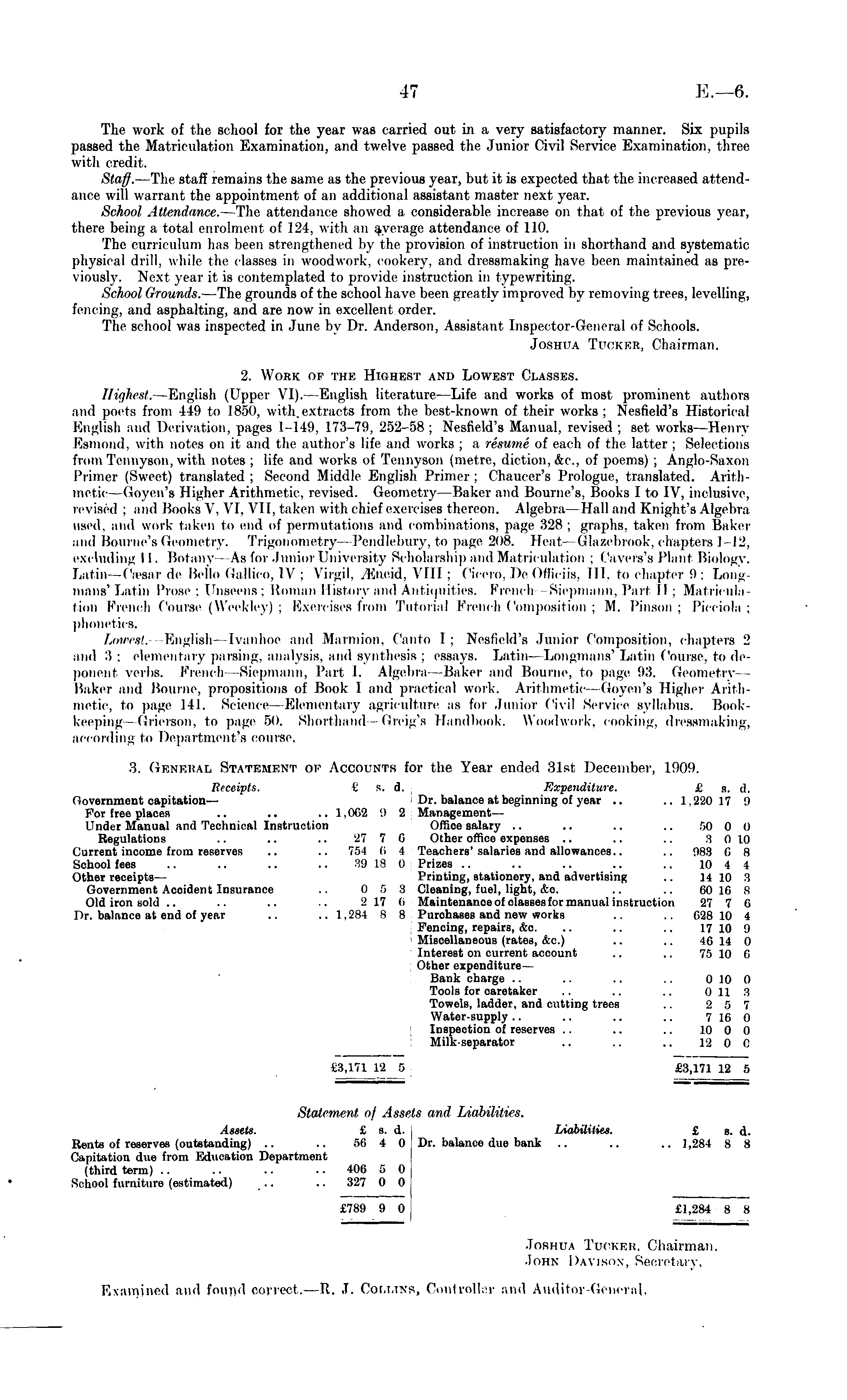 Tlie work of the school for the year was carried out in a very satisfactory manner. Six pupils passed the Matriculation Examination, and twelve passed the Junior Civil Service Examination, three with credit. Staff. —The staff remains the same as the previous year, but it is expected that the increased attendance will warrant the appointment of an additional assistant master next year. School Attendance. —The attendance showed a considerable increase on that of the previous year, there being a total enrolment of 124, with an average attendance of 110. The curriculum has been strengthened by the provision of instruction in shorthand and systematic physical drill, while the classes in woodwork, cookery, and dressmaking have been maintained as previously. Nexi year it is contemplated to provide instruction in typewriting. School Grounds. —The grounds of the school have been greatly improved by removing trees, levelling, fencing, and asphalting, and are now in excellent order. The school was inspect eel in June by Dr. Anderson. Assistant Inspector-General of Schools. Joshua Tucker, Chairman. 2. Work of the Highest and Lowest Classes. Highest. —English (Upper VI). English literature —Life and works of most prominent authors and poets from 111) to 1850, with.extracts from the best-known of their works; Nesfield's Historical English and Derivation, pages 1-149, 173-79, 252-58 ; Nesfield's Manual, revised ; set works — Henry Esmond, with notes on it and the author's life and works ; a resume of each of the latter ; Selections from Tennyson, with notes ; life and works of Tennyson (metre, diction, &c, of poems) ; Anglo-Saxon Primer (Sweet) translated; Second Middle English Primer; Chaucer's Prologue, translated. Arithmetic Goyen's Higher Arithmetic, revised. Geometry—Raker and Bourne's. Books Ito IV. inclusive. revised ; and Books V, VI, VII, taken with chief exercises thereon. Algebra Hall and Knight's Algebra used, and work taken to end of permutations and combinations, page -i2N : graphs, taken from Baker and Bourne's Geometry. Trigonometry Pendlebury, to page 208. Heat Glazebrook, chapters I 12, excluding 1 1. Botany As for Junior University Scholarship and Matriculation ; Cavers's Plant Biology. Latin Caesar de Beflo Gallico, IV; Virgil, VIII; Cicero, De Officiis, 111, to chapter 9 ; Lout; mans' Latin I , ruse : I'nseens; Roman History and Antiquities. French Siepmann, Pari II: Matriculation French Course (Weekley); Exercises from Tutorial French Composition ; M. Pinson ; Picciola ; phonetics. Lowest. English [vanhoe and Marmion, Canto I : Nesfield's Junior Composition, chapters 2 and .'S: elementary parsing, analysis, and synthesis ; essays. Latin Longmans' Latin Course, to deponeni verbs. French Siepmann. I'art I. Algebra Baker and Bourne, bo page !••'!. Geometry Baker and Bourne, propositions of Book I and practical work. Arithmetic Goyen's Higher Arithmetic, to page 111. Science Elementary agriculture as for Junior Civil Service syllabus. Book keeping Grierson, to page 50, Shorthand Greig's Handbook. Woodwork, cooking, dressmaking, according to Department's course. 3. Geneisal Statement of Accounts for the Year ended 31st December, 1909. Receipts. t s. d. Expenditure. £ s. d. Government capitation— Dr. balance at beginning of year .. ..1.220 17 9 For free places .. .. .. 1.0G2 '.) 2 Management— Under Manual and Technical Instruction Offioe salary .. .. .. .. 50 0 0 Regulations .. .. .. 27 7 C Other office expenses .. .. .. 3 010 Current income from reserves .. .. 754 (i 4 Teachers'salaries and allowances.. .. 083 f> 8 School fees .. .. .. .. 39 18 0 Prizes .. .. .. .. .. 10 4 4 Other receipts— Printing, stationery, and advertising .. 14 10 3 Government Acoident Insurance .. 0 5 8 Cleaning, fuel, light, &o. .. .. 60 16 S Old iron sold .. .. .. .. 2 17 (i Maintenance of classes for manual instruction 27 7 6 Dr. balance at end of year .. .. 1,284 8 8 Purchaees and new works .. .. 628 10 4 Fencing, repairs, &c. .. .. .. 17 10 9 Miscellaneous (rates, &c.) .. .. 46 14 0 Interest on current account .. .. 75 10 6 Other expenditureBank charge .. .. .. .. 0 10 0 Tools for caretaker .. .. .. 011 3 Towels, ladder, and cutting trees .. 2 5 7 Water-supply .. .. .. .. 7 16 0 Inspection of reserves .. .. .. 10 0 0 Milk-separator .. .. .. 12 0 0 £3,171 12 5 £3,171 12 5 Statement of Assets and Liabilities. Assets. £ s. d. Liabilities. £ s. d. Rents of reserves (outstanding) .. .. 56 4 0 Dr. balance due bank .. .. .. 1,284 8 8 Capitation due from Education Department (third term) .. .. .. .. 406 5 0 School furniture (estimated) .. .. 327 0 0 £789 9 0 £1,284 8 8 Joshua Tucker, Chairman. John Davison, Secretary, Examined and found correct. — TJ. J. Collins, Controller and Auditor-General,