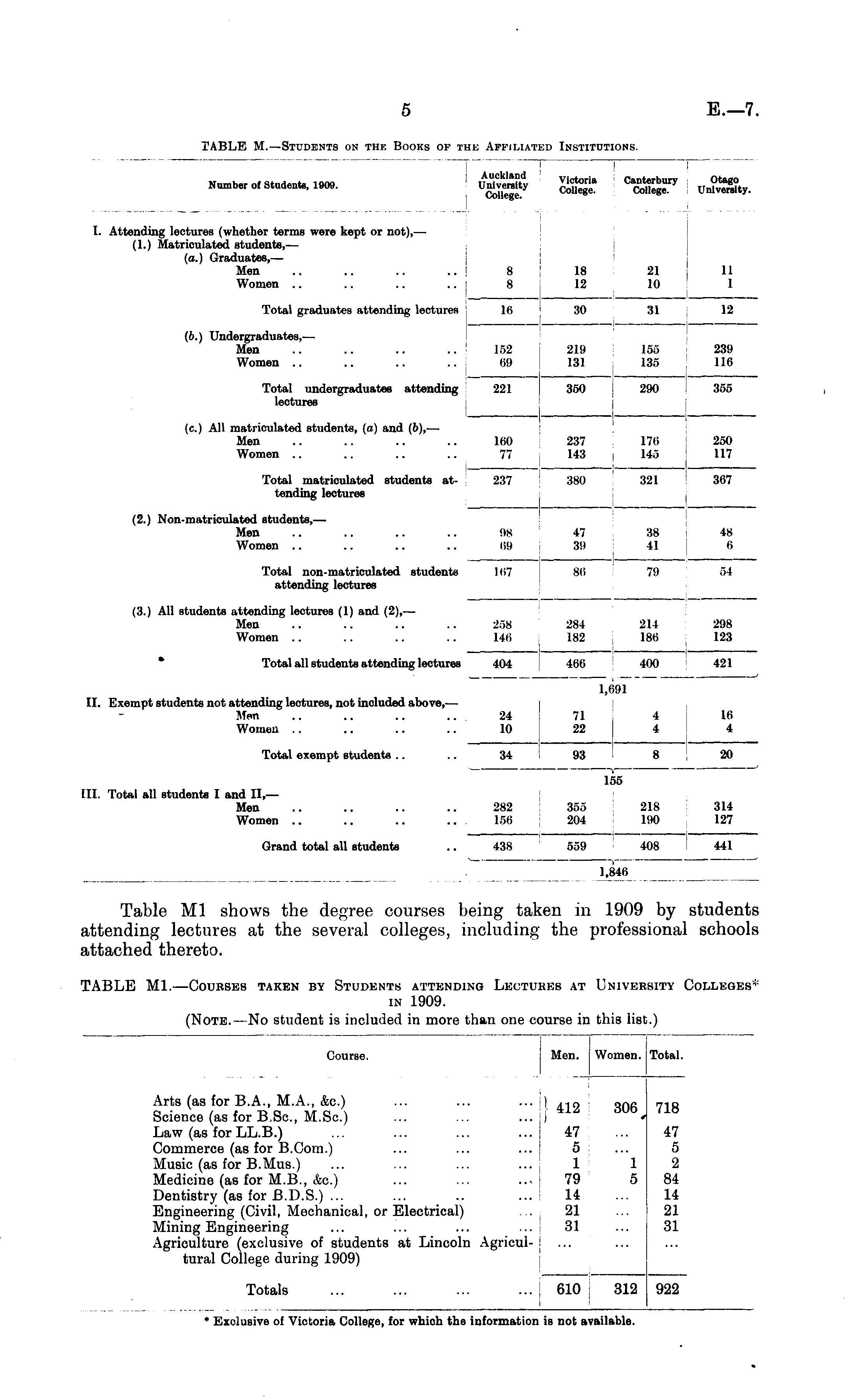 TABLE M1.—Courses taken by Students attending Lectures at University Colleges* in 1909.