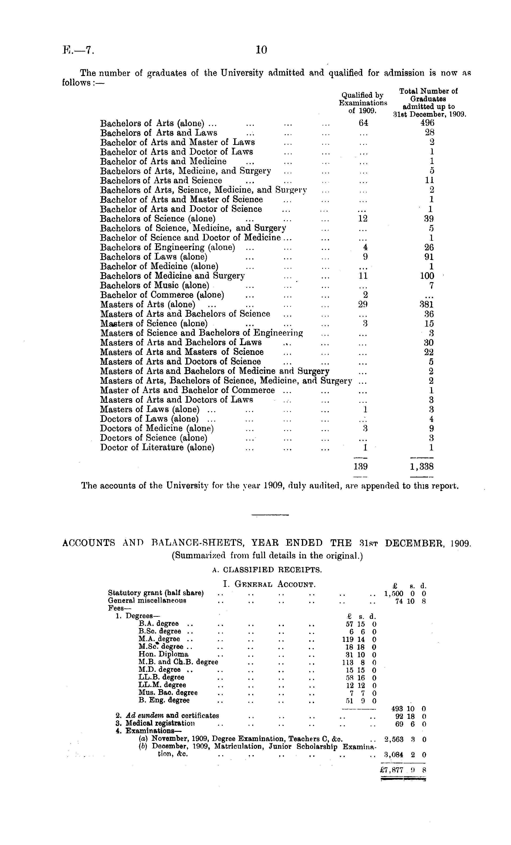 The number of graduates of the University admitted and qualified for admission is now as follows ;— n ,£ j i Total Number of Qualified by Graduates Examinations admiUed up to 01 i»uj. 3U( . December) 1909 Bachelors of Arts (alone) ... ... ... ... 64 496 Bachelors of Arts and Laws ... ... ... ... 28 Bachelor of Arts and Master of Laws ... ... ... 2 Bachelor of Arts and Doctor of Laws ... ... ... 1 Bachelor of Arts and Medicine ... ... ... ... 1 Bachelors of Arts, Medicine, and Surgery ... ... ... 5 Bachelors of Arts and Science ... ... ... ... 11 Bachelors of Arts, Science, Medicine, and Surgery ... ... 2 Bachelor of Arts and Master of Science ... ... ... 1 Bachelor of Arts and Doctor of Science ... ... ... 1 Bachelors of Science (alone) ... ... ... 12 39 Bachelors of Science, Medicine, and Surgery ... ... 5 Bachelor of Science and Doctor of Medicine... ... ... 1 Bachelors of Engineering (alone) ... ... ... 4 26 Bachelors of Laws (alone) ... ... ... \) 91 Bachelor of Medicine (alone) ... ... ... ... 1 Bachelors of Medicine and Surgery ... ... 11 100 Bachelors of Music (alone) ... ... ' ... ... 7 Bachelor of Commerce (alone) ... ... ... 2 Masters of Arts (alone) ... ... ... ... 29 381 Masters of Arts and Bachelors of Science ... ... ... 36 Masters of Science (alone) ... ... ... 3 15 Masters of Science and Bachelors of Engineering ... ... 3 Masters of Arts and Bachelors of Laws ... ... ... 30 Masters of Arts and Masters of Science ... ... ... 22 Masters of Arts and Doctors of Science ... ... ... 5 Masters of Arts and Bachelors of Medicine and Surgery ... 2 Masters of Arts, Bachelors of Science, Medicine, and Surgery ... 2 Master of Arts and Bachelor of Commerce ... ... ... 1 Masters of Arts and Doctors of Laws ... ... ... 3 Masters of Laws (alone) ... ... ... ... 1 3 Doctors of Laws (alone) ... ... ... ... ..'. 4 Doctors of Medicine (alone) ... ... ... 3 9 Doctors of Science (alone) ... ... ... ... 3 Doctor of Literature (alone) ... ... ... 1 1 139 1,338 The accounts of the University for the year 1909, duly audited, are appended to this report. ACCOUNTS AND BALANCE-SHEETS, YEAR ENDED THE 31st DECEMBER, 1909. (Summarized from full details in the original.) A. CLASSIFIED RECEIPTS. I. General Account. £ s . <j. Statutory grant (half share) .. .. .. .. .. .. 1,500 0 0 General miscellaneous .. .. .. .. .. .. 74 10 8 Pees— 1. Degrees— t s. d. B.A. degree .. .. .. .. .. 57 15 0 B.Sc. degree .. .. .. .. .. 660 .. .. .. .. .. 119 14 0 M.Sc? degree .. .. .. .. .. 18 18 0 Hon. Diploma .. .. .. .. :il 10 0 M.B. and Ch.B. degree .. .. .. 113 8 0 M.D. degree .. .. .. .. .. 15 15 0 LL.B. degree .. .. .. .. .IS 16 0 LL.M. degree .. .. .. .. 12 12 0 Mus. Bao. degree .. .. .. .. 7 7 0 B. Eng. degree .. .. .. .. 519 0 493 10 0 2. Ad eundem and certificates .. .. .. .. .. 92 18 0 3. Medical registration .. .. .. .. .. .. 69 6 0 4. Examinations— (a) November, 1909, Degree Examination, Teachers C, &c. .. 2,563 8 0 (6) Deoember, 1909, Matriculation, Junior Scholarship Examination, (fee. .. ~ ~ ~ .. .. 3,084 2 0 £7,877 9 8