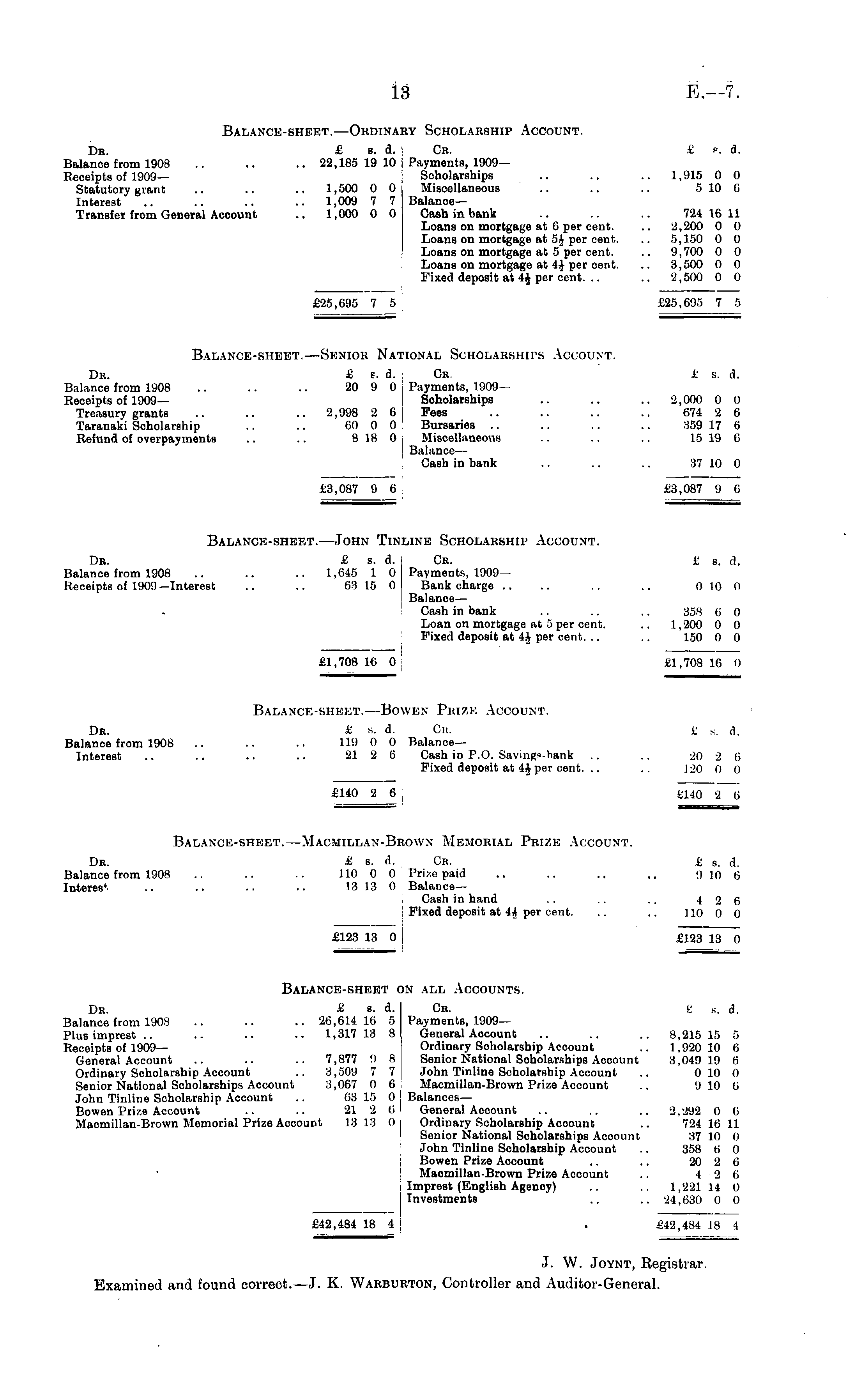Balance-sheet.—Ordinary Scholarship Account. Db. £ s. d. Cr. £ *. d. Balance from 1908 .. .. ..22,185 19 10 Payments, 1909— Receipts of 1909— Scholarships .. .. .. 1,915 0 0 Statutory grant .. .. .. 1,500 0 0 Miscellaneous .. .. .. 510 6 Interest .. .. .. .. 1,009 7 7 BalanceTransfer from General Account .. 1,000 0 0 Cash in bank .. .. 724 16 11 Loans on mortgage at 6 per cent. .. 2,200 0 0 Loans on mortgage at 5J per cent. .. 5,150 0 0 Loans on mortgage at 5 per cent. .. 9,700 0 0 Loans on mortgage at 4J per cent. .. 3,500 0 0 Fixed deposit at 4$ per cent. .. .. 2,500 0 0 £25,695 7 5 £25,695 7 5 Balance-sheet. —Senior National Scholarships Account. Dr. £ s. d. Cr. £ s. d. Balance from 1908 .. .. .. 20 9 0 Payments, 1909Receipts of 1909— Scholarships .. .. .. 2,000 0 0 Treasury grants .. .. .. 2,998 2 6 Pees .. .. .. .. 674 2 6 Taranaki Scholarship .. .. 60 0 0 Bursaries .. .. .. .. 359 17 6 Refund of overpayments .. .. 8 18 0 Miscellaneous .. .. .. 15 19 6 Balance — Cash in bank .. .. .. 37 10 0 £3,087 9 6 ,087 9 6 Balance-sheet. —John Tinline Scholarship Account. Dr. £ s. d. Cr. $ a. d. Balance from 1908 .. .. .. 1,645 1 0 Payments, 1909— Receipts of 1909—Interest .. .. 63 15 0 Bank charge .. .. .. .. 010 O Balanoe— Cash in bank .. .. .. 358 6 0 Loan on mortgage at 5 per cent. .. 1,200 0 0 Fixed deposit at 4i per cent. .. .. 150 0 0 ~ £1,708 16 0 'J 1,708 16 0 Balance-sheet. —Bowen Prize Account. Dr. £ s. d. Ob. g s. d. Balanoe from 1908 .. .. .. 119 0 0 BalanceInterest .. .. .. .. 21 2 6 Cash in P.O. Saving«-hank .. .. 20 2 6 Fixed deposit at 4£ per cent. .. .. 120 0 0 £140 2 6 tl4o 2 6 Balance-sheet.—Macmillan-Brown Memorial Prize Account. Dr. £ s. d. Cr. t s . ,1. Balance from 1908 .. .. .. 110 0 0 Prize paid .. .. .. .. 9 10 6 Interes*- .. .. .. .. 13 13 0 BalanceCash in hand .. .. .. 4 2 6 Fixed deposit at 4A per cent. .. .. 110 0 0 £123 13 0 £123 13 0 Balance-sheet on all Accounts. Dr. £ s. d. Cb. t s . d. Balance from 1908 .. .. .. 26,614 16 5 Payments, 1909— Plus imprest .. .. .. .. 1,317 13 8 General Account .. .. .. 8,215 15 5 Receipts of 1909— Ordinary Scholarship Account .. 1,920 10 6 General Account .. .. .. 7,877 9 8 Senior National Scholarships Account 3,049 19 6 Ordinary Scholarship Account .. 3,509 7 7 John Tinline Scholarship Account .. 010 0 Senior National Scholarships Account 3,067 0 6 Macmillan-Brown Prize Account .. 9 10 6 John Tinline Scholarship Account .. 63 15 0 Balances— Bowen Prize Account .. .. 21 2 6 General Account .. .. .. 2,292 0 6 Macmillan-Brown Memorial Prize Account 13 13 O Ordinary Scholarship Account .. 724 16 11 Senior National Scholarships Account 37 10 0 John Tinline Scholarship Account .. 358 6 0 Bowen Prize Account .. .. 20 2 6 Maomillan-Brown Prize Account .. 4 2 6 Imprest (English Agenoy) .. .. 1,221 14 0 Investments .. .. 24,630 0 0 £42,484 18 4 . £42,484 18 i J. W. Joynt, Registrar. Examined and found correct.—J. K. Warburton, Controller and Auditor-General.