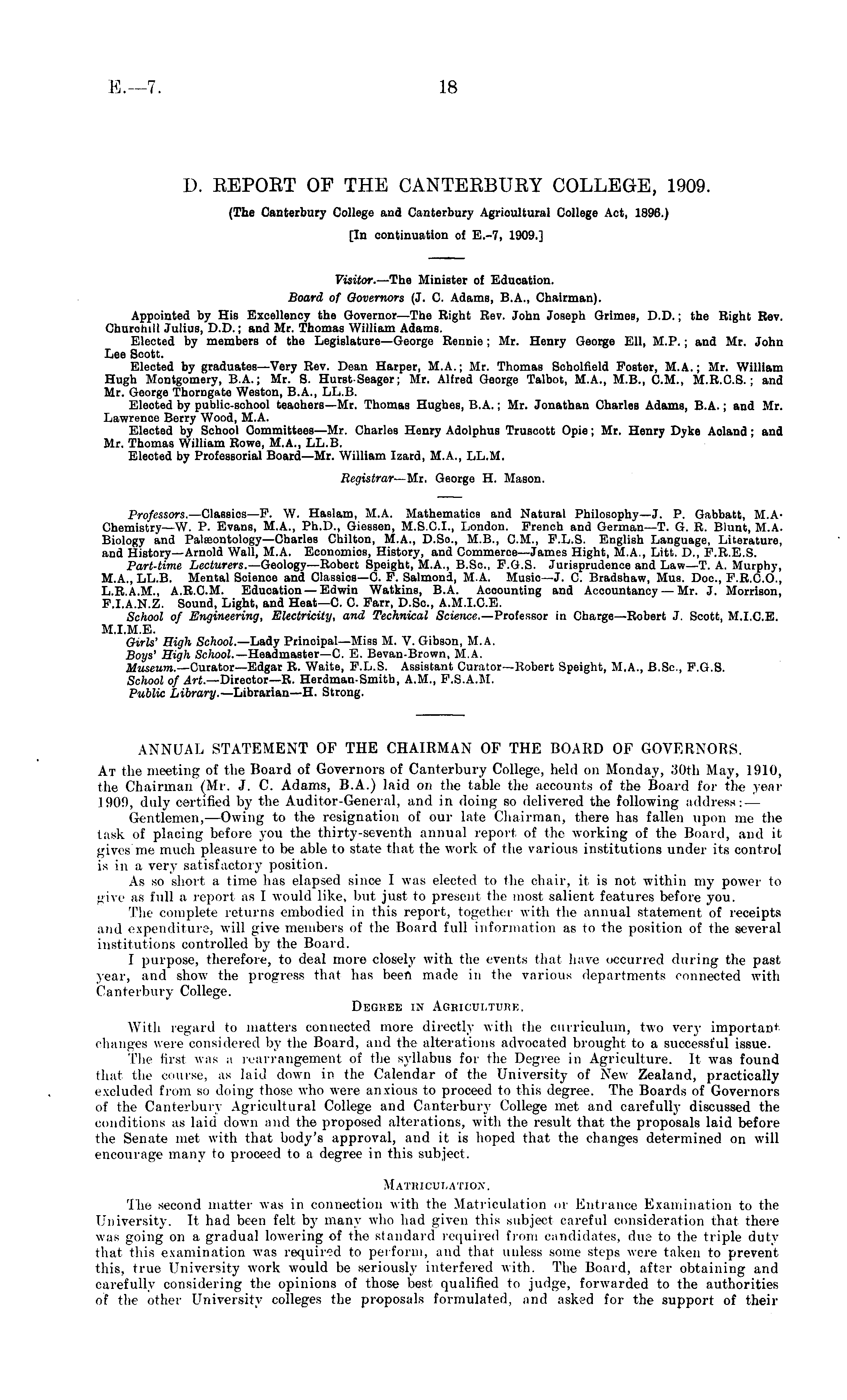 D. REPORT OF THE CANTERBURY COLLEGE, 1909. (The Canterbury College and Canterbury Agricultural College Act, 1896.) [In continuation of E.-7, 1909.] Visitor. —The Minister of Eduoation. Board of Governors (J. C. Adams, 8.A., Chairman). Appointed by His Excellency the Governor—The Right Rev. John Joseph Grimes, D.D.; the Right Rev. Churchill Julius, D.D.; and Mr. Thomas William Adams. Elected by members of the Legislature—George Rennie; Mr. Henry George Ell, M.P.; and Mr. John Lee Scott. Elected by graduates—Very Rev. Dean Harper, M.A.; Mr. Thomas Scholfield Foster, M.A.; Mr. William Hugh Montgomery, 8.A.; Mr. S. HurstSeager; Mr. Alfred George Talbot, M.A., M.8., CM., M.R.C.S. ; and Mr. George Thorngate Weston, 8.A., LL.B. Eleoted by public-school teaohers—Mr. Thomas Hughes, 8.A.; Mr. Jonathan Charles Adams, 8.A.; and Mr. Lawrence Berry Wood, M.A. Elected by School Committees—Mr. Charles Henry Adolphus Truscott Opie; Mr. Henry Dyke Aoland ; and Mr. Thomas William Rowe, M.A., LL.B. Elected by Professorial Board—Mr. William Izard, M.A., LL.M. Registrar —Mr. George H. Mason. Professors. —Clasßios—F. W. Haslam, M.A. Mathematics and Natural Philosophy—J. P. Gabbatt, M.AChemistry—W. P. Evans, M.A., Ph.D., Giessen, M.S.CI., London. French and German—T. G. R. Blunt, M.A. Biology and Palaeontology—Charles Chilton, M.A., D.Sc, M.8., CM., F.L.S. English Language, Literature, and History—Arnold Wall, M.A. Economics, History, and Commerce—James Hight, M.A., Litt. D., F.R.E.S. Part-time Lecturers. —Geology—Robert Speight, M.A., B.Sc, F.G.S. Jurisprudence and Law—T. A. Murphy, M.A., LL.B. Mental Science and Classios—C F. Salmond, M.A. Music—J. C Bradshaw, Mus. Doc, F.R.C.0., L.R.A.M., A.R.CM. Education — Edwin Watkins, B.A. Accounting and Accountancy — Mr. J. Morrison, F.I.A.N.Z. Sound, Light, and Heat—C. C Farr, D.Sc, A.M.I.C.E. School of Engineering, Electricity, and Technical Science. —Professor in Charge—Robert J. Scott, M.I.C.E. M.I.M.E. Girls' High School.— Lady Prinoipal—Miss M. V. Gibson, M.A. Boys' High School. —Headmaster —C. E. Bevan-Brown, M.A. Museum. —Curator —Edgar R. Waite, F.L.S. Assistant Curator—Robert Speight, M.A., B.Sc, F.G.S. School of Art.— Director—R. Herdman-Smith, A.M., F.S.A.M. Public Library.— Librarian—H. Strong. ANNUAL STATEMENT OF THE CHAIRMAN OF THE BOARD OF GOVERNORS. At the meeting of the Board of Governors of Canterbury College, held on Monday, 30th May, 1910, the Chairman (Mr. J. C. Adams, 8.A.) laid on the table the accounts of the Board for the year 1909, duly certified by the Auditor-General, and in doing bo delivered the following address: — Gentlemen, —Owing to the resignation of our late Chairman, there has fallen upon me the task of placing before you the thirty-seventh annual report of the working of the Board, and it gives me much pleasure to be able to state that the work of the various institutions under its control is in a very satisfactory position. As so short a time has elapsed since I was elected to the chair, it is not within my power to give as full a report as I would like, but just to present the most salient features before you. The complete returns embodied in this report, together with the annual statement of receipts and expenditure, will give members of the Hoard full information as to the position of the several institutions controlled by the Board. I purpose, therefore, to deal more closely with the events that have occurred during the past year, and show the progress that has been made in the various departments connected with Canterbury College. Degree in Agriculture. With regard to matters connected more directly with the curriculum, two very important changes were considered by the Board, and the alterations advocated brought to a successful issue. The lirst was a rearrangement of the syllabus for the Degree in Agriculture. It was found thai the course, as laid down in the Calendar of the University of New Zealand, practically excluded from so doing those who were anxious to proceed to this degree. The Boards of Governors of the Canterbury Agricultural College and Canterbury College met and carefully discussed the conditions as laid down and the proposed alterations, with the result that the proposals laid before the Senate met with that body's approval, and it is hoped that the changes determined on will encourage many to proceed to a degree in this subject. M LTRICUL ITION. Ihe second matter was in connection with the Matriculation or Entrance Examination to the University. It had been felt by many who had given this subject careful consideration that there was going on a gradual lowering of the standard required from candidates, due to the triple duty that this examination was required to perform, and that unless some steps were taken to prevent this, true University work would be seriously interfered with. The Board, after obtaining and carefully considering the opinions of those best qualified to judge, forwarded to the authorities of the other University colleges the proposals formulated, and asked for the support of their