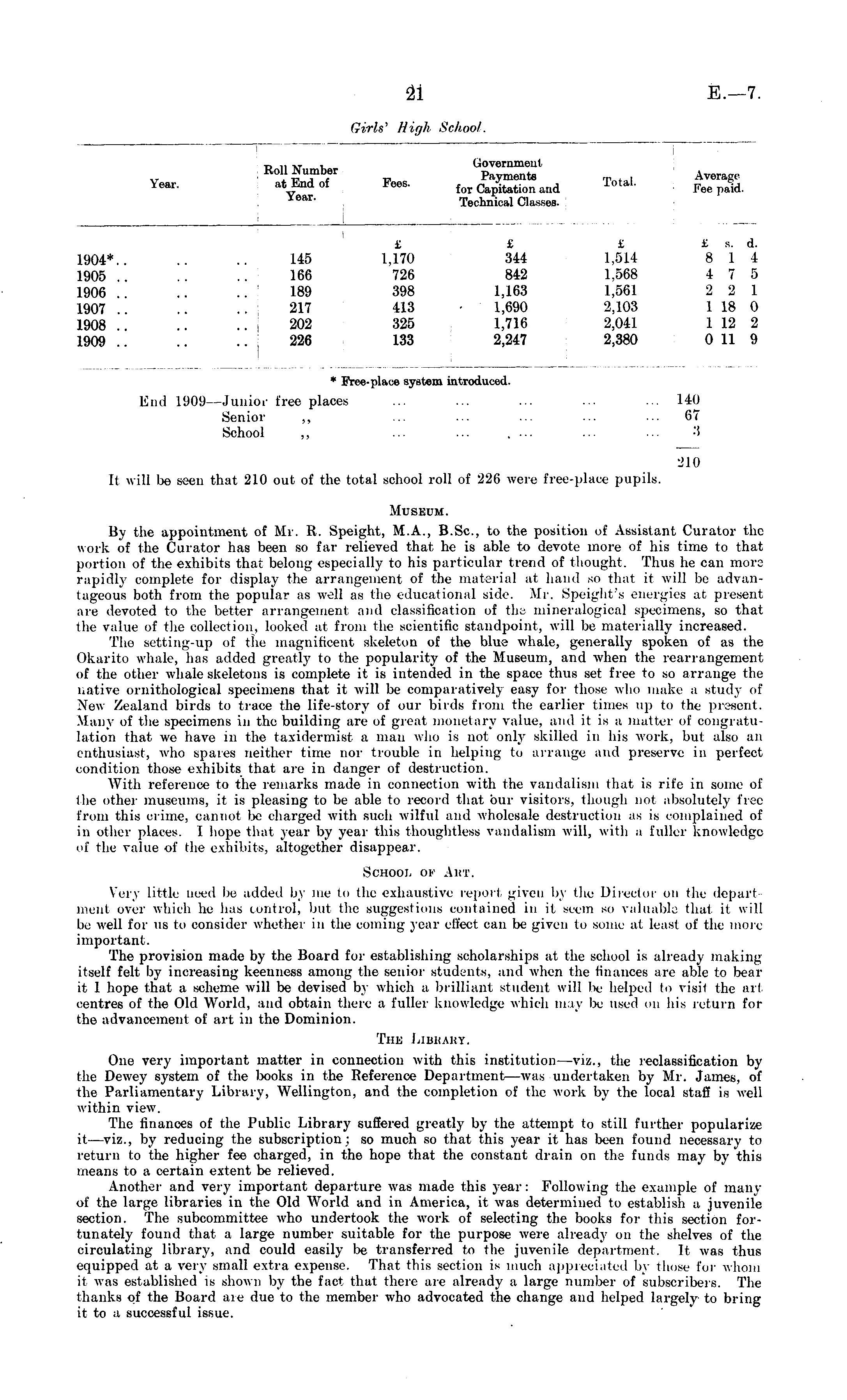 End 1909—Junior free places ... ... ... ... ... 140 Senior ,, ... ... ■■■ ... •■• 67 School ,, ... ... .... ■ ■ •■■ 3 210 li will be seen that 210 out of the total school roll of 22(> were free-place pupils. Museum. By the appointment of Mr. R. Speight, M.A., B.Sc, to the position of Assistant Curator the work of the Curator has been so far relieved that he is able to devote more of his time to that portion of the exhibits that belong especially to his particular trend of thought. Thus he can mors rapidly complete for display the arrangement of the mat, rial at hand so thai it will be advantageous both from the popular as well as the educational side. Mr. Speight's energies at present are devoted to the better arrangement and classification of tha mineralogical specimens, so that the value of the collection, looked at from the scientific standpoint, will be materially increased. The setting-up of the magnificent skeleton of the blue whale, generally spoken of as the Okarito whale, has added greatly to the popularity of the Museum, and "when the rearrangement of the other whale skeletons is complete it is intended in the space thus set free to so arrange the native ornithological specimens that it will he comparatively easy for those who make a study of New Zealand birds to trace the life-story of our birds from the earlier limes up to the present. Many of the specimens in the building are id' great monetary value, and it is a matter of congratulation that wo have in the taxidermist a man who is not only skilled in his work, but also tut enthusiast, who spares neither time nor trouble in helping to arrange and preserve in perfect condition those exhibits that are in danger of destruction. With reference to the remarks made in connection with the vandalism that is rife in some of the other museums, it is pleasing to he able to record that bur visitors, though not absolutely free from this crime, cannot l>c charged with such wilful and wholesale destruction as is complained of in other places. I hope that year by year this thoughtless vandalism "ill, with a fuller knowledge of the value of the exhibits, altogether disappear. School of Art. Very little need be added by me to the exhaustive report given by (he Director on the depart ment over which he has control, but the suggestions contained in it seem so valuable that it will be "ell for us to consider whether in the coming year effect can be given to some at least of the more important. The provision made by the Board for establishing scholarships at the school is already making itself felt by increasing keenness among the senior students, and when the finances are able to bear it I hope that a scheme will be devised by which a brilliant student will be helped to visit the ail centres of the Old World, and obtain there a fuller knowledge which may be used mi his return for the advancement of art in the Dominion. The Library. One very important matter in connection with this institution—viz., the reclassification by the Dewey system of the books in the Reference Department—was undertaken by Mr. James, of the Parliamentary Library, Wellington, and the completion of the work by the local staff is well within view. The finances of the Public Library suffered greatly by the attempt to still further popularize it—viz., by reducing the subscription; so much so that this year it has been found necessary to return to the higher fee charged, in the hope that the constant drain on the funds may by this means to a certain extent be relieved. Another and very important departure was made this year: Following the example of many of the large libraries in the Old World and in America, it was determined to establish a juvenile section. The subcommittee who undertook the work of selecting the books for this section fortunately found that a large number suitable for the purpose were already on the shelves of the circulating library, and could easily be transferred to the juvenile department. It was thus equipped at a very small extra expense. That this section is much appreciated by those for whom it was established is shown by the fact that then are already a large number of subscribers. The thanks of the Board ate due to the member who advocated the change and helped largely to bring it to a successful issue.