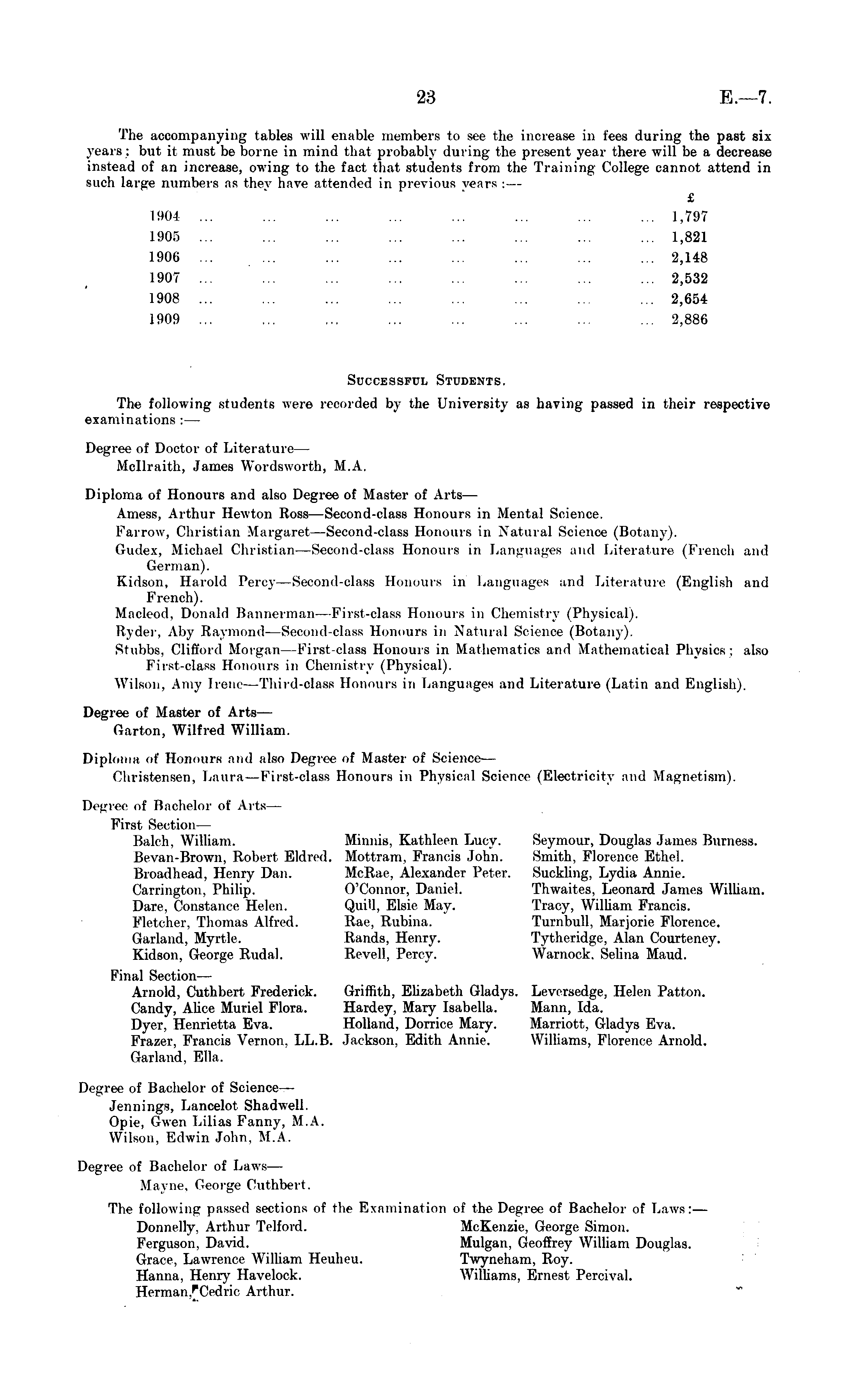 The accompanying tables will enable members to see the increase in fees during the past six years: but it must be borne in mind that probably during the present year there will be a decrease instead of an increase, owing to the fact that students from the Training College cannot attend in such large numbers as they have attended in previous years : — £ 1904 ... ... ... ... ... ... ... ... 1,797 1905 ... ... ... ... ... ... ... ... 1,821 1906 ... ... ... ... ... ... ... ... 2,148 1907 ... ... ... ... ... ... ... ... 2,532 1908 ... ... ... ... ... ... ... ... 2,654 1909 ... ... ... ... ... ... ... ... 2,886 Successful Students. The following students were recorded by the University as having passed in their respective examinations :— Degree of Doctor of Literature — Mcllraith, James Wordsworth, M.A. Diploma of Honours and also Degree of Master of Arts— Amess, Arthur Hewton Ross—Second-class Honours in Mental Science. Farrow, Christian Margaret—Second-class Honours in Natural Science (Botany). Gudex, Michael Christian —Second-class Honours in Languages and Literature (French and German). Kidson, Harold Percy—Second-class Honours in Languages and Literature (English and French). Macleod, Donald Bannerman —First-class Honours in Chemistry (Physical). Ryder, Aby Raymond —Second-class Honours in Natural Science (Botany). Stubbs, Clifford Morgan —First-class Honours in Mathematics and Mathematical Physics; also First-class Honours in Chemistry (Physical). Wilson, Amy Irene—Third-class Honours in Languages and Literature (Latin and English). Degree of Master of Arts— Garton, Wilfred William. Diploma of Honours and also Degree of Master of Science — Christensen, Laura- First-class Honours in Physical Science (Electricity and Magnetism). Degree of Bachelor of Arts— First Section— Balch, William. Minnis, Kathleen Lucy. Seymour, Douglas James Burness. Bevan-Brown, Robert Eldred. Mottram, Francis John. Smith, Florence Ethel. Broadhead, Henry Dan. Mcßae, Alexander Peter. Suckling, Lydia Annie. Carrington, Philip. O'Connor, Daniel. Thwaites, Leonard James William. Dare, Constance Helen. Quill, Elsie May. Tracy, William Francis. Fletcher, Thomas Alfred. Rae, Rubina. Turnbull, Marjorie Florence. Garland, Myrtle. Rands, Henry. Tytheridge, Alan Courteney. Kidson, George Rudal. Revell, Percy. Warnock. Selina Maud. Final Section — Arnold, Cuthbert Frederick. Griffith, Elizabeth Gladys. Leversedge, Helen Patton. Candy, Alice Muriel Flora. Hardey, Mary Isabella. Mann, Ida. Dyer, Henrietta Eva. Holland, Dorrice Mary. Marriott, Gladys Eva. Frazer, Francis Vernon, LL.B. Jackson, Edith Annie. Williams, Florence Arnold. Garland, Ella. Degree of Bachelor of Science—• Jennings, Lancelot Shadwell. Opie, Gwen Lilias Fanny, M.A. Wilson, Edwin John, M.A. Degree of Bachelor of Laws — Mayne, George Cuthbert. The following passed sections of the Examination of the Degree of Bachelor of Laws:— Donnelly, Arthur Telford. McKenzie, George Simon. Ferguson, David. Mulgan, Geoffrey William Douglas. Grace, Lawrence William Heuheu. Twyneham, Roy. Hanna, Henry Havelock. Williams, Ernest Percival. Herman, r Cedric Arthur.