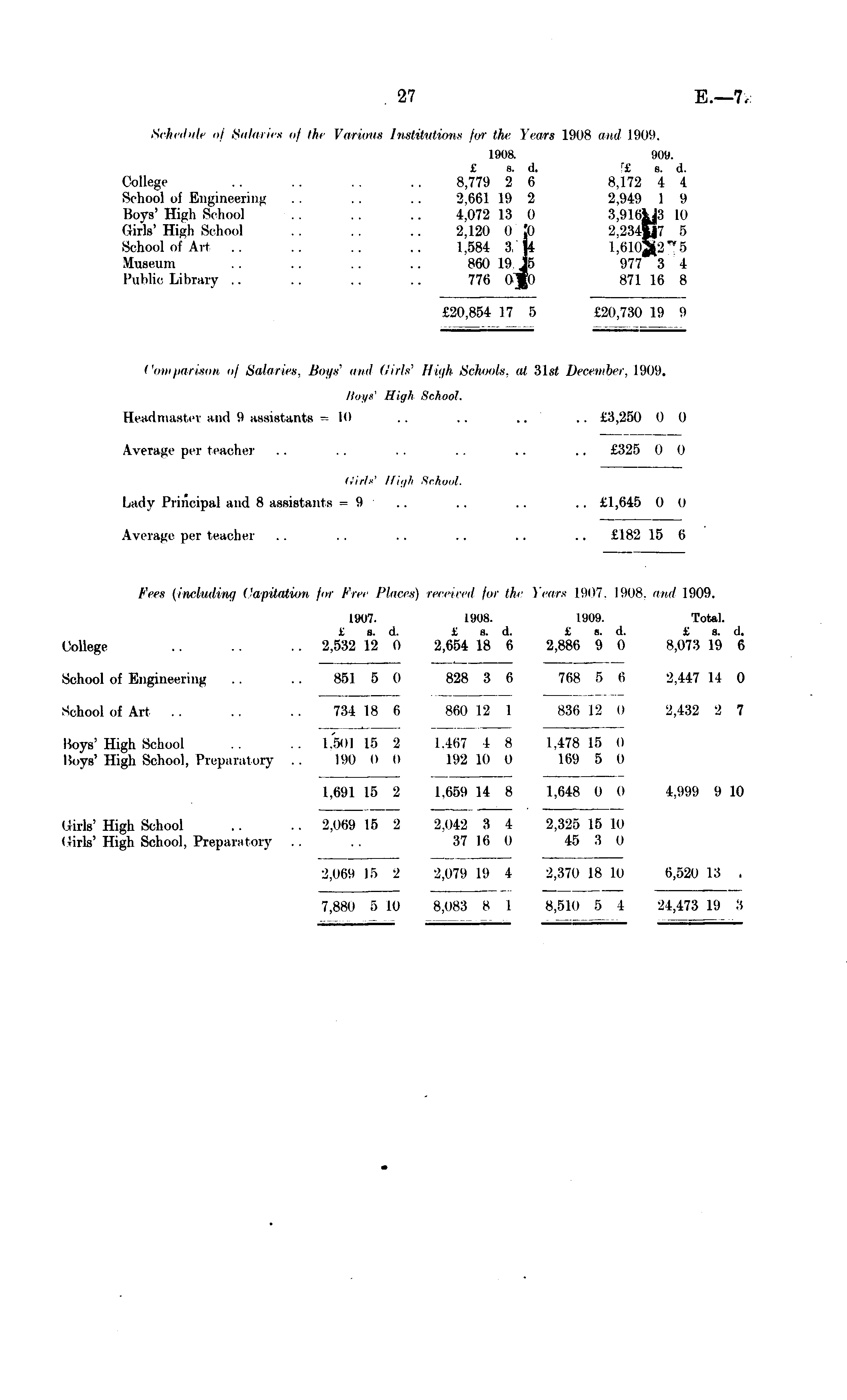 Sehcilnli of Salaries of tin Various Institutions for the Years 1908 and 1909. 190 a 909. £ s. d. r £ s. d. College .. .. .. 8,779 2 6 8,172 4 4 School of Engineering .. .. .. 2,661 19 2 2,949 1 9 Boys' High School .. 4.072 13 0 3,916i|3 10 Girls' High School .. .. .. 2,120 OSO 2,234p7 5 School of Art .. .. .. 1.584 3, |4 1,610§2 Museum .. .. .. 860 19 J5 977 3 4 Public library .. .. .. .. 776 o]go 871 16 8 £20,854 17 5 £20,730 19 9 Comparison of Salomes, Boys' and Girls' High Schools, at 31st December. 1909. Boys' High School. Headmaster and 9 assistants = 10 .. .. .. .. £3,250 0 0 Average per teacher .. .. .. .. .. .. £325 0 0 Girls' High School. Lady Principal and 8 assistants = 9 .. .. .. .. £1,645 0 0 Average, per teacher .. .. .. .. .. .. £182 15 6 Fees (including Capitation for Free Places) received for the Years 1907. 1908. mid 1909. 1907. 1908. 1909. Total. £ s. d. £ s. d. t s. d. £ s. d. College .. .. .. 2,532 12 0 2,654 18 6 2,886 9 0 8,073 19 6 School of Engineering .. .. 851 5 0 828 3 6 768 5 6 2,447 14 0 School of Art .. .. .. 734 18 6 860 12 1 836 12 0 2,432 2 7 Hoys' High School .. .. 1,50115 2 1,467 1 8 1,478 15 0 Boys' High Sohool, Preparatory .. 190 0 0 192 10 0 169 5 0 1,691 15 2 1.659 14 8 1,648 0 0 4,999 9 10 Girls' High School .. .. 2,069 15 2 2.042 3 4 2,325 15 10 Girls' High Sohool, Preparatory .. .. 37 16 0 45 3 0 2,069 15 2 -'.079 19 4 2,370 18 10 6,520 13 . 7,880 5 10 8.083 8 1 8,510 5 4 24,473 19 3