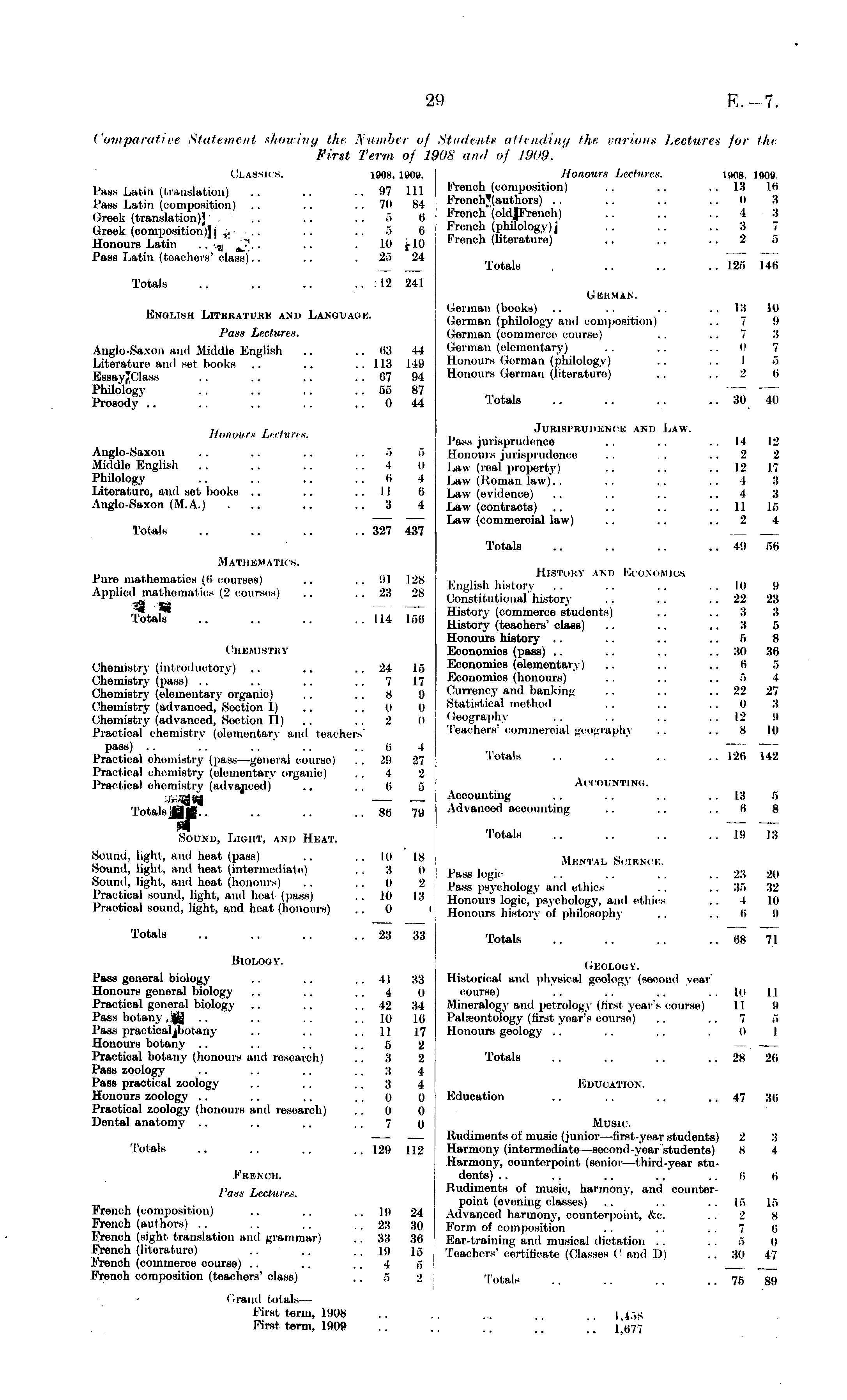 Honours Lectures. inns. 1009. French (composition) .. .. 13 10 B v renohJ(authors) .. .. .. .. 0 :i French (oldjFrench) .. .. ..4 3 Prcnch (philology)J .. .. ..3 7 French (literature) .. .. .. 2 5 Totals , .. .. .. 126 146 German. German (books) .. .. .. 13 10 German (philology and composition) .. 7 9 German (commerce course) .. .. 7 3 German (elementary) .. .. .. 0 7 Honours Gorman (philology) .. .. 1 6 Honours German (literature) .. .. 2 8 Totals .. .. .. .. 30 40 .lUKisi'iii.niAi 1: vmi Law. Pass jurisprudence .. .. ..II 12 Honours jurisprudence .. .. ..2 2 Law (real property) .. .. ..12 17 Law (Roman law).. .. .. .. 4 3 Law (evidence) .. .. .. ..4 3 Law (contracts) .. .. .. .. 11 Io Law (commercial law) .. .. .. 2 4 Totals .. .. .. .. 40 66 HisTiusv ami Economics English history .. .. .. in 9 Constitutional hist on .. .. 22 23 History (commerce students) .. 3 3 History (teachers' class) .. .. 3 5 Honours history .. .. .. 6 8 Economics (pass) .. .. 30 30 Economics (elementary) .. .. 0 ."1 Economics (honours) .. .. .. ."> 4 Currency and banking .. .. 22 27 Statistical method .. .. .. 0 3 (leography .. .. .. 12 9 Teachers" commercial geography .. .. 8 10 Totals .. .. .. .. 120 142 An en NTING. Accounting .. .. .. 13 6 Advanced accounting .. .. li 8 Totals .. .. .. ..19 13 Mental Soieni 1. Pass logic .. . . . . . . 23 20 Pass psychology and ethics .. .. 36 32 Honours logic psychology, and ethics .. 4 10 Honours history of philosophy .. .. 0 9 Totals .. .. .. .. 08 71 Geology. Historical and physical geology (second year' oourse) .. .. .. in 11 Mineralogy and petrology (first years course) 11 9 Palaeontology (first year's oourse) .. ..7 6 Honours geology .. .. .. . 0 I Totals .. .. .. .. 28 26 Education. Education .. .. .. ..47 36 Music. Rudiments of music (junior—first-year students) 2 3 Harmony (intermediate —second-year students) 8 4 Harmony, counterpoint (senior —third-year students) . . . . . . . . li n Rudiments of music, harmony, and counterpoint (evening classes) .. .. ..If, 16 Advanced harmony, counterpoint, ftc. .. 2 8 Form of composition .. .. ..7 0 Ear-training and musical dictation .. f> 11 Teachers'certificate (Classes C and I)) .. 30 47 totals .. .. .. . . 75 89 .. 1,458 .. 1.077