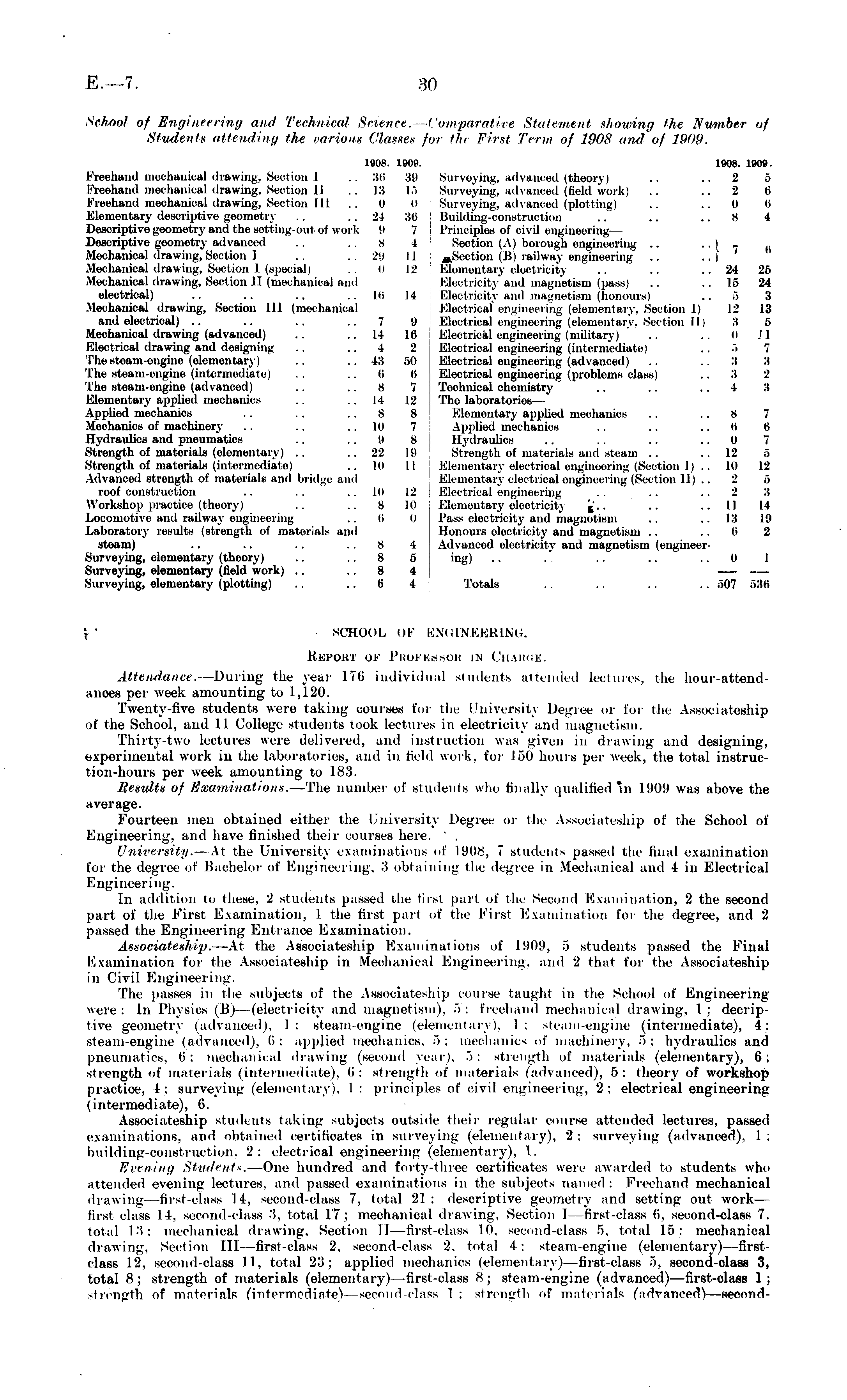 School of Engineering and Technical Senna. Comparativt Statement showing the Number of Students attending tin carious Classes for tin First Term of 1908 and of ]!><H). 1908. 1909. 1908. 1909. Freehand mechanical drawing. Section I .. 30 39 Surveying, advanoed (theory) .. ..2 5 Freehand mechanical drawing. Section II .. 13 15 Surveying, advanoed (field work) .. ..2 6 Freehand mechanical drawing. Section 111 .. 0 n Surveying, advanoed (plotting) .. .. 0 6 Elementary descriptive geometry .. .. 24 :iii Building-oonstruotion .. .. ..8 4 Descriptive geometry and the sett ing-ont of work 9 7 Principles of civil engineering— Descriptive geometry advanced ..8 I Section (A) borough engineering .. ..I - Mechanical drawing, Section 1 .. .. 29 II (R) railway engineering .. ..I ' .Mechanical drawing, Section 1 (special) .. v 12 Elementary electricity .. .. 24 26 Mechanical drawing, Section 11 (mechanical and Electricity and magnetism (pass) .. 15 24 electrical) .. .. .. hi 14 Electricity and magnetism (honours) .. ."i 3 Mechanical drawing, Section 1)1 (mechanical Electrical engineering (elementary, Section I) 12 13 and electrical) .. .. .. ..7 9 Electrical engineering (elementary, Section II) 3 5 Mechanical drawing (advanced) .. ..14 10 Electrical engineering (military) 0' 1 Electrical drawing and designing .. ..4 2 Electrical engineering (intermediate) .. ."i 7 The steam-engine (elementary) .. ..43 BO Electrical engineering (advanced) .. ..3 3 The steam-engine (intermediate) .. li 6 Electrical engineering (problems claßs) .. 3 2 The steam-engine (advanced) .. .. 8 7 Technical chemistry .. .. 4 3 Elementary applied mechanic- .. 14 12 | The laboratories — Applied mechanics .. .. .. 8 8 ' Elementary applied mechanics .. 8 7 Mechanics of machinery .. ..10 7 Applied mechanics .. .. ..6 0 Hydraulics and pneumatics .. .. 9 8 ! Hydraulics .. .. .. .. 0 7 Strength of materials (elementary) .. ..22 19 Strength of materials and steam .. ..12 6 Strength of materials (intermediate) .. 10 II Elementary electrical engineering (Section 1) .. 10 12 Advanced strength of materials and bridge and Elemental \ electrical engineering (Section II) .. 2 ."> roof construction .. .. ..In 12 Electrical engineering .. .. ..2 3 Workshop practice (theory) .. .. 8 Hi Elementary electricity j.. .. ..11 14 Locomotive and railway engineering .. li n Pass electricity and magnetism .. ..13 19 Laboratory results (strength of materials and Honours electricity and magnetism .. .. 0 2 steam) .. .. .. .. 8 4 i Advanced electricity and magnetism (engineerSurveying, elementary (theory) .. 8 ."i ing) .. .. .. ..01 Surveying, elementary (field work) .. 8 4 Surveying, elementary (plotting) .. 0 4 Totals .. .. 507 636 • SCHOOL Or ENGINEERING. Kbpobt of Pkofesboe in Charge. Attendance.—During the year 17(i individual students attended lectures, the hour-attend-ances per week amounting to 1.1 20. Twenty-five students wen: hiking courses for the Universitj Degree or for the Associateship of the School, and II College students took lectures in electricity and magnetism. Thirty-two lectures were delivered, and instruction was given in drawing and designing, experimental work in the laboratories, and in field work, for 150 hours per week, the total instruc-tion-hours pei- week amounting to 183. Results of Examinations. —The number of students who finally qualified in 11109 was above the average. Fourteen men obtained either the University Degree or the Associateship of the School of Engineering, and have finished their courses here. ' . University. At the University examinations of 1908, 7 students passed the final examination for the degree of Bachelor of Engineering, ■'! obtaining the degree iii Mechanical and 4 in Electrical Engineering. In addition to these. 2 students passed the firs! part of the Second Examination, 2 the second part of the First Examination, I the first pari of the First Examination for the degree, and 2 passed the Engineering Entrance Examination. Associateship. —Al the Associateship Examinations of 1909, 5 students passed the Final Examination for the Associateship in Mechanical Engineering, and 2 thai for the Associateship in Civil Engineering. The passes in the subjects of the Associateship course taughf iii the School of Engineering were: In Physics (l!i (electricity and magnetism), 5; freehand mechanical drawing, 1; decriptive geometry (advanoed), I ; steam-engine (elementary), 1 ; steam-engine (intermediate), 4: steam-engine (advanoed), 0 : applied mechanics, -"i: mechanics of machinery, 5; hydraulics and pneumatics, 6; mechanical drawing (second year), 5; strength of materials (elementary), 6; strength of materials (intermediate), 6; strength of materials (advanced), 5; theory of workshop practice, 4: surveying (elementary), 1 : principles of civil engineering, 2: electrical engineering (intermediate), 6. Associateship students taking subjects outside their regular course attended lectures, passed examinations, and obtained certificates in surveying (elementary), 2; surveying (advanced). I ; building-t struction, 2; electrioal engineering (elementary), 1. Evening Students. —One hundred and forty-three certificates were awarded to students who attended evening lectures, and passed examinations in the subjects named: Freehand mechanical drawing—first-class 14, second-class 7. total 21: descriptive geometry and setting out work— first class 11. second-class 3, total IT; mechanical drawing. Section I first-class 6, second-class 7. total I•'!: mechanical drawing. Section [I—first-olass 10, second-class 5, total 15: mechanical drawing. Section lll—first-class 2, second-class 2, total -I: steam-engine (elementary)—firstclass 12, second-class 11, total 23 j applied mechanics (elementary)—first-class 5, second-class 3, total 8; strength of materials (elementary) —first-class 8; steam-engine (advanced) —first-class 1; strength of materials (intermediate) second-class 1 ; strength of materials (adva
