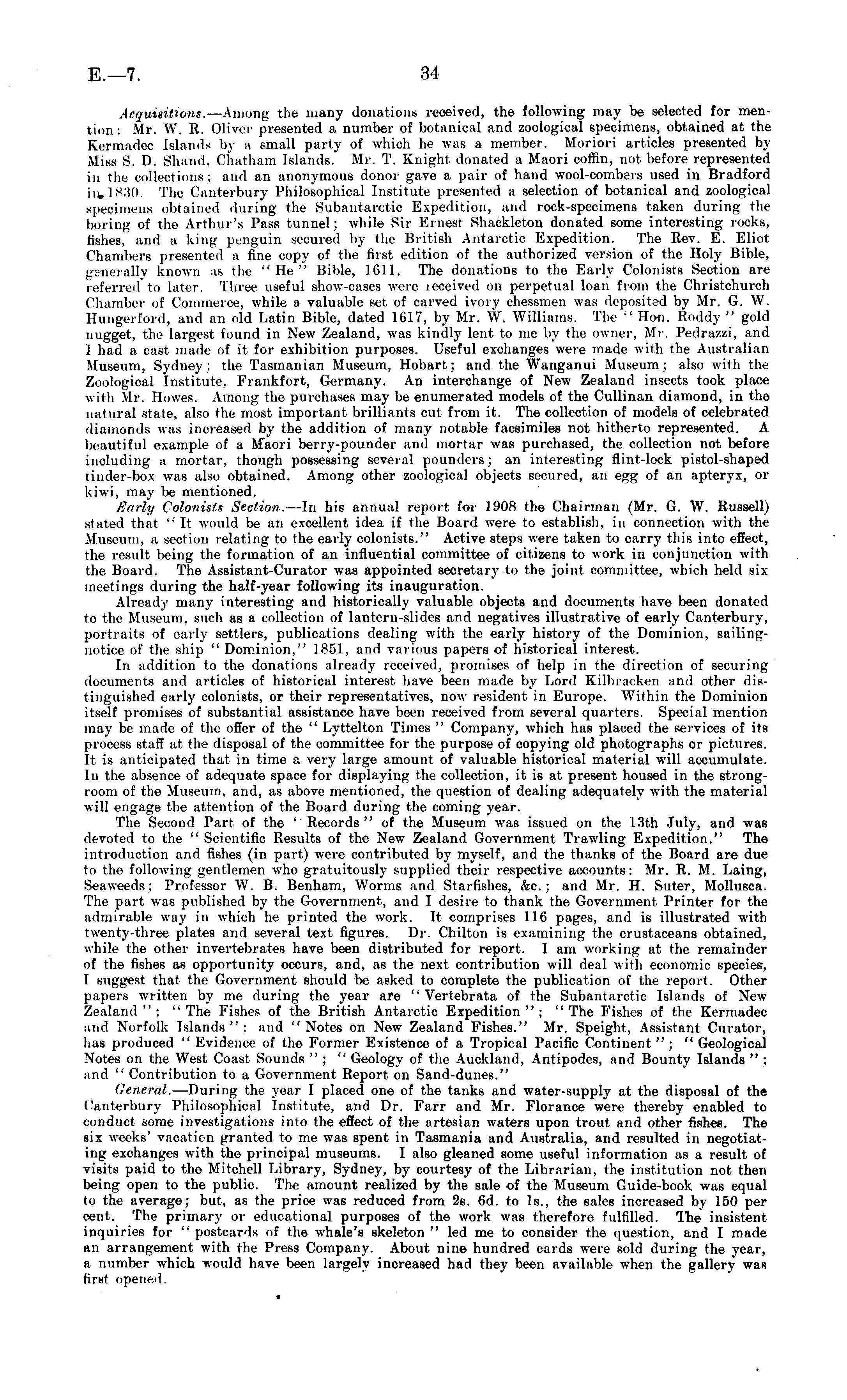 Acquisition*.—Among the many donations received, the following may be selected for mention: Mr. W. R. Oliver presented a number of botanical and zoological specimens, obtained at the Kermadec Islands by a small party of which he was a member. Moriori articles presented by Miss S. I). Shand, Chatham Islands. Mr. T. Knight donated a Maori coffin, not before represented in the collections: and an anonymous donor gave a pair of hand wool-combers used in Bradford in, 1830. The Canterbury Philosophical Institute presented a selection of botanical and zoological specimens obtained during the Subantarctic Expedition, and rock-specimens taken during the (wring of the Arthur's Pass tunnel; while Sir Erneet Shackleton donated some interesting rocks, fishes, and a king penguin secured by the British Antarctic Expedition. The Rev. E. Eliot Chambers presented a fine copy of the first edition of the authorized version of the Holy Bible, generally known as the "He" Bible, 1611. The donations to the Early Colonists Section are referred to later. Three useful show-cases were leceived on perpetual loan from the Christchurch Chamber of Commerce, while a valuable set of carved ivory chessmen was deposited by Mr. G. W. Hungerford, and an old Latin Bible, dated 1617, by Mr. W. Williams. The " Hon. Roddy " gold nugget, the largest found in New Zealand, was kindly lent to me by the owner, Mr. Pedrazzi, and 1 had a cast made of it for exhibition purposes. Useful exchanges were made with the Australian Museum, Sydney ; the Tasmanian Museum, Hobart; and the Wanganui Museum ; also with the Zoological Institute, Frankfort, Germany. An interchange of New Zealand insects took place with Mr. Howes. Among the purchases may be enumerated models of the Cullinan diamond, in the natural state, also the most important brilliants cut from it. The collection of models of celebrated diamonds was increased by the addition of many notable facsimiles not hitherto represented. A beautiful example of a Maori berry-pounder and mortar was purchased, the collection not before including a mortar, though possessing several pounders; an interesting flint-lock pistol-shaped tinder-box was also obtained. Among other zoological objects secured, an egg of an apteryx, or kiwi, may be mentioned. Early Colonists Section. —In his annual report for 1908 the Chairman (Mr. G. W. Russell) stated that ,; It would be an excellent idea if the Board were to establish, in connection with the Museum, a section relating to the early colonists." Active steps were taken to carry this into effect, the result being the formation of an influential committee of citizens to work in conjunction with the Board. The Assistant-Curator was appointed secretary to the joint committee, which held six meetings during the half-year following its inauguration. Already many interesting and historically valuable objects and documents have been donated to the Museum, such as a collection of lantern-slides and negatives illustrative of early Canterbury, portraits of early settlers, publications dealing with the early history of the Dominion, sailingnotice of the ship " Dominion," 1851, and various papers of historical interest. In addition to the donations already received, promises of help in the direction of securing documents and articles of historical interest have been made by Lord Kilbracken and other distinguished early colonists, or their representatives, now resident in Europe. Within the Dominion itself promises of substantial assistance have been received from several quarters. Special mention may be made of the offer of the " Lyttelton Times " Company, which has placed the services of its process staff at the disposal of the committee for the purpose of copying old photographs or pictures. It is anticipated that in time a very large amount of valuable historical material will accumulate. In the absence of adequate space for displaying the collection, it is at present housed in the strongroom of the Museum, and, as above mentioned, the question of dealing adequately with the material will engage the attention of the Board during the coming year. The Second Part of the 'Records" of the Museum was issued on the 13th July, and was devoted to the " Scientific Results of the New Zealand Government Trawling Expedition." The introduction and fishes (in part) were contributed by myself, and the thanks of the Board are due to the following gentlemen who gratuitously supplied their respective accounts: Mr. R. M. Laing, Seaweeds; Professor W. B. Benham, Worms and Starfishes, &c.; and Mr. H. Suter, Mollusca. The part was published by the Government, and I desire to thank the Government Printer for the admirable way in which he printed the work. It comprises 116 pages, and is illustrated with twenty-three plates and several text figures. Dr. Chilton is examining the crustaceans obtained, while the other invertebrates have been distributed for report. I am working at the remainder of the fishes as opportunity occurs, and, as the next contribution will deal with economic species, I suggest that the Government should be asked to complete the publication of the report. Other papers written by me during the year are " Vertebrata of the Subantarctic Islands of New Zealand"; "The Fishes of the British Antarctic Expedition"; "The Fishes of the Kermadec and Norfolk Islands": and "Notes on New Zealand Fishes." Mr. Speight, Assistant Curator, has produced " Evidence of the Former Existence of a Tropical Pacific Continent " ; " Geological Notes on the West Coast Sounds " ; " Geology of the Auckland, Antipodes, and Bounty Islands " : and " Contribution to a Government Report on Sand-dunes." General. —During the year I placed one of the tanks and water-supply at the disposal of the Canterbury Philosophical Institute, and Dr. Farr and Mr. Florance were thereby enabled to conduct some investigations into the effect of the artesian waters upon trout and other fishes. The six weeks' vacation g