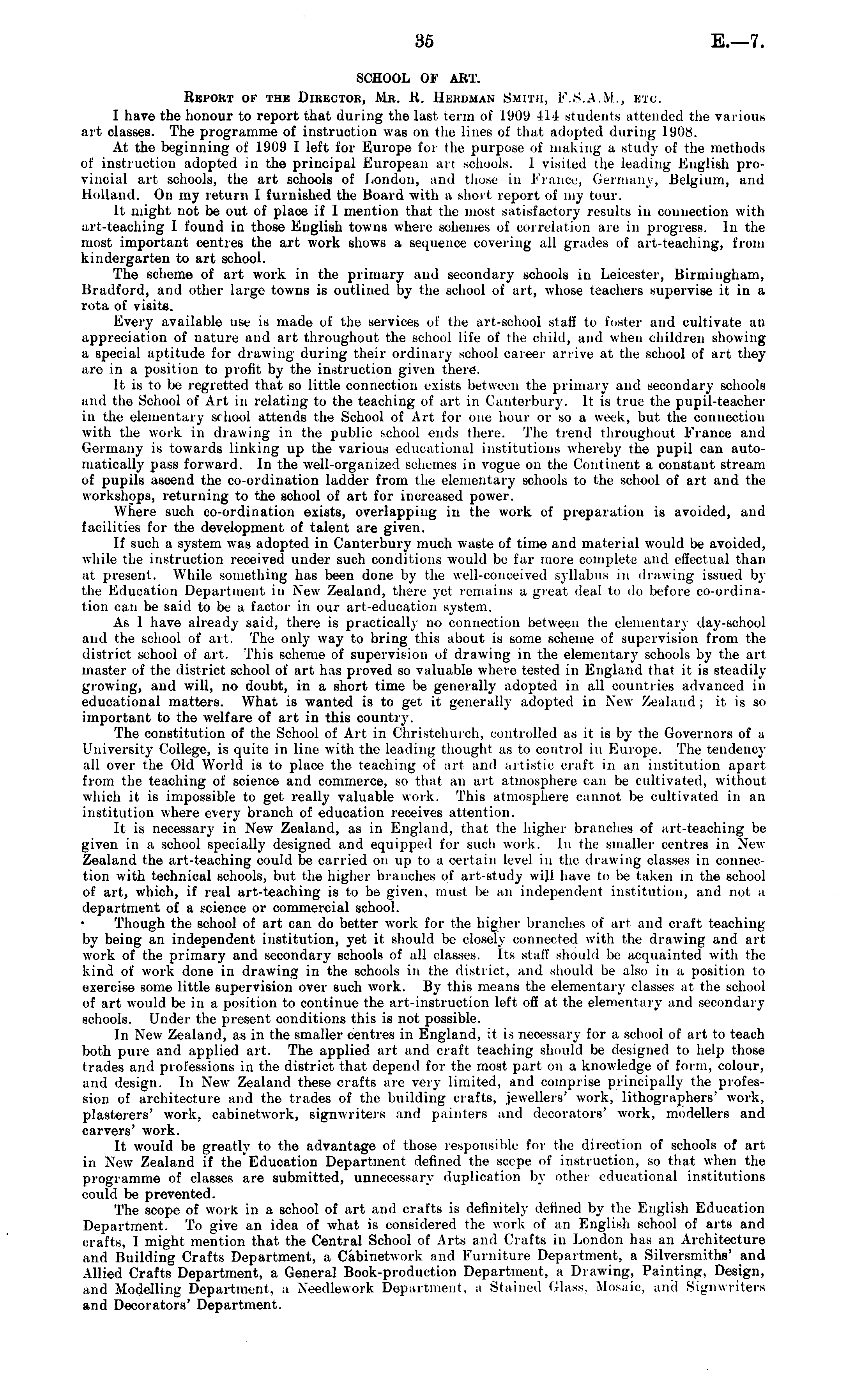 SCHOOL OF ART. Report or the Director, Mr. R. Herdman Smith, F.S.A.M., etc. I have the honour to report that during the last term of 1909 411 students attended the various art classes. The programme of instruction was on the lines of that adopted during 1908. At the beginning of 1909 I left for Europe for the purpose of making a study of the methods of instruction adopted in the principal European art schools. I visited the leading English provincial art schools, the art schools of London, and those in France, Germany, Belgium, and Holland. On my return I furnished the Board with a short report of my tour. It might not be out of place if I mention that the most satisfactory results in connection with art-teaching I found in those English towns where schemes of correlation are in progress. In the most important centres the art work shows a sequence covering all grades of ait-teaching, from kindergarten to art school. The scheme of art work in the primary and secondary schools in Leicester, Birmingham, Bradford, and other large towns is outlined by the school of art, whose teachers supervise it in a rota of visits. Every available use is made of the services of the art-school staff to foster and cultivate an appreciation of nature and art throughout the school life of the child, and when children showing a special aptitude for drawing during their ordinary school career arrive at the school of art they are in a position to profit by the instruction given there. It is to be regretted that so little connection exists between the primary aud secondary schools and the School of Art in relating to the teaching of art in Canterbury. It is true the pupil-teacher in the elementary school attends the School of Art for one hour or so a week, but the connection with the work in drawing in the public school ends there. The trend throughout France and Germany is towards linking up the various educational institutions whereby the pupil can automatically pass forward. In the well-organized schemes in vogue on the Continent a constant stream of pupils ascend the co-ordination ladder from the elementary schools to the school of art and the workshops, returning to the school of art for increased power. Where such co-ordination exists, overlapping in the work of preparation is avoided, and facilities for the development of talent are given. If such a system was adopted in Canterbury much waste of time and material would be avoided, while the instruction received under such conditions would be far more complete and effectual than at present. While something has been done by the well-conceived syllabus in drawing issued by the Education Department in New Zealand, there yet remains a great deal to do before co-ordina-tion can be said to be a factor in our art-education system. As I have already said, there is practically no connection between the elementary day-school and the school of art. The only way to bring this about is some scheme of supervision from the district school of art. This scheme of supervision of drawing in the elementary schools by the art master of the district school of art has proved so valuable where tested in England that it is steadily growing, and will, no doubt, in a short time lie generally adopted in all countries advanced in educational matters. What is wanted is to get it generally adopted in New Zealand; it is so important to the welfare of art in this country. The constitution of the School of Art in Christchurch, controlled as it is by the Governors of a University College, is quite in line with the leading thought as to control in Europe. The tendency all over the Old World is to place the teaching of art and artistic craft in an institution apart from the teaching of science and commerce, so that an art atmosphere can be cultivated, without which it is impossible to get really- valuable work. This atmosphere cannot be cultivated in an institution where every branch of education receives attention. It is necessary in New Zealand, as in England, that the higher branches of art-teaching be given in a school specially designed and equipped for such work. In the smaller centres in NewZealand the art-teaching could be carried on up to a certain level in the drawing classes in connection with technical schools, but the higher branches of art-study will have to be taken in the school of art, which, if real art-teaching is to be given, must be an independent institution, and not a department of a science or commercial school. Though the school of art can do better work for the higher branches of art and craft teaching by being an independent institution, yet it should be closely connected with the drawing and art work of the primary and secondary schools of all classes. Its staff should be acquainted with the kind of work done in drawing in the schools in the district, and should be also in a position to exercise some little supervision over such work. By this means the elementary classes at the school of art would be in a position to continue the art-instruction left off at the elementary and secondaryschools. Under the present conditions this is not possible. In New Zealand, as in the smaller centres in England, it is necessary for a school of art to teach both pure and applied art. The applied art and craft teaching should be designed to help those trades and professions in the district that depend for the most part on a knowledge of form, colour, and design. In New Zealand these crafts are very limited, and comprise principally the profession of architecture and the trades of the building crafts, jewellers' work, lithographers' work, plasterers' work, cabinetwork, signwriters and painters and decorators' work, modellers and carvers' work. It would be greatly to the advantage of those responsible for the direction of schools of art in New Zealand if the Education Department defined the scope of instruction, so that when the programme of classes are submitted, unnecessary duplicatio