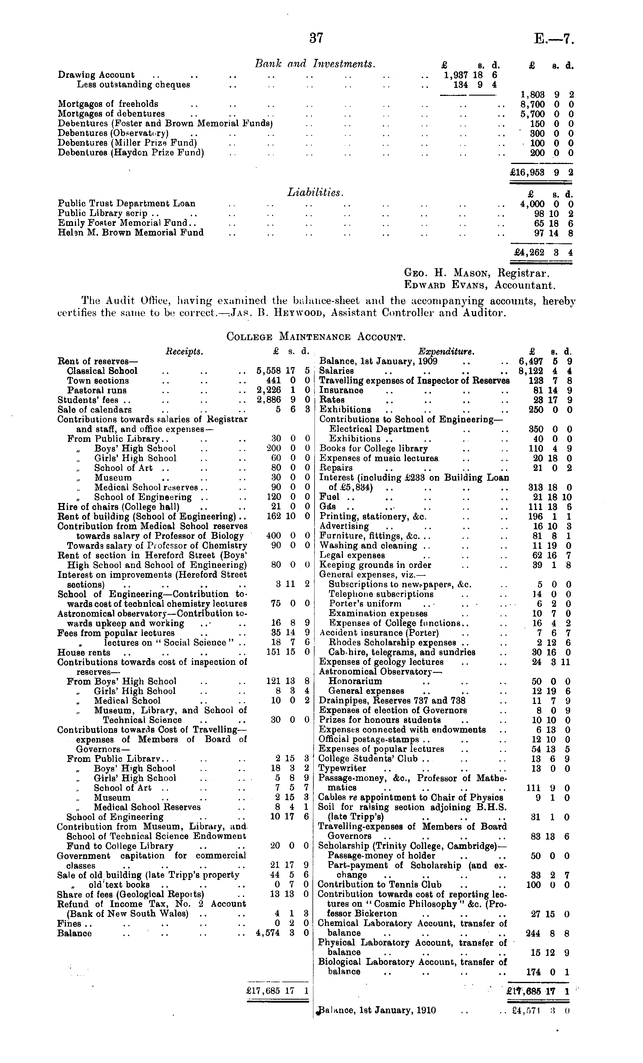 Bank and Investments. £ s. d. £ s. d. Drawing Account .. .. .. .. .. .. 1,937 18 6 Less outstanding cheques .. .. .. 134 9 4 1,803 9 2 Mortgages of freeholds .. .. .. .. .. .. .. 8,700 0 0 Mortgages of debentures .. .. .. .. .. .. .. 5,700 0 0 Debentures (Foster and Brown Memorial Funds) .. . . .. .. 150 0 0 Debentures (Observatory) .. .. .. .. .. .. 300 0 0 Debentures (Miller Prize Fund) .. .. .. .. .. 100 0 0 Debentures (Haydon Prize Fund) .. .. .. .. 200 0 0 £16,953 9 2 Liabilities. £ s . d. Public Trust Department Loan .. .. .. .. .. .. .. .. 4,000 0 0 Public Library scrip .. .. .. .. .. .. .. .. .. .. 98 10 2 Emily Foster Memorial Fund.. .. .. .. 65 18 6 Hebn M. Brown Memorial Fund .. .. .. .. .. .. .. 97 14 8 £4,262 3 4 Geo. H. Mason, Registrar. Edward Evans, Accountant. The Audit Office, having examined the balance-sheet and the accompanying accounts, hereby certifies the same to be correct. —:Jas. B. Hetwood, Assistant Controller and Auditor. College Maintenance Account. Receipts. £ s. d. Expenditure. £ s. d. Rent of reserves— Balance, Ist January, 1909 .. .. 6,497 5 9 Classical School .. .. .. 5,558 17 5 Salaries .. .. .. .. 8,122 4 4 Town seotions .. .. .. 441 0 0 | Travelling expenses of Inspector of Reserves 123 7 8 Pastoral runs .. .. .. 2,226 1 0 Insurance .. .. .. .. 81 14 9 Students'fees .. .. .. .. 2,886 9 0 Rates .. .. .. .. 23 17 9 Sale of calendars .. .. .. 5 6 3 Exhibitions .. .. .. .. 250 0 0 Contributions towards salaries of Registrar Contributions to School of Engineering— and staff, and offico expenses— Electrical Department .. .. 350 0 0 From Public Library.. .. .. 30 0 0 Exhibitions .. .. .. .. 40 0 0 „ Boys' High School .. .. 200 0 0 Books for College library .. .. 110 4 9 Girls' High School .. .. 60 0 0 Expenses of music lectures .. .. 20 18 0 School of Art .. .. .. 80 0 0 Repairs .. .. .. .. 21 0 2 Museum .. .. .. 30 0 0 Interest (including £233 on Building Loan „ Medical School reserves.. .. 90 0 0 of £5,834) .. .. .. .. 313 18 0 , School of Engineering .. .. 120 0 0 Fuel .. .. .. .. 21 18 10 Hire of chairs (College hall) .. .. 21 0 0 Gas .. ... .. 11l 13 6 Rent of building (School of Engineering) .. 162 10 0 Printing, stationery, &c. .. .. 196 1 1 Contribution from Medical School reserves Advertising .. .. .. .. 16 10 3 towards salary of Professor of Biology 400 0 0 Furniture, fittings, &c. .. .. .. 81 8 1 Towards salary of Piofcssor of Chemistry 90 0 0 i Washing and cleaning .. .. .. 11 19 0 Rent of section in Hereford Street (Boys' Legal expenses .. .. .. 62 16 7 High School and School of Engineering) 80 0 0 Keeping grounds in order .. .. 39 1 8 Interest on improvements (Hereford Street General expenses, viz.— seotions) .. .. .. .. 3 11 2 Subscriptions to new.-papers, &c. .. 5 0 0 School of Engineering—Contribution to- Telephone subscriptions .. .. 14 0 0 wards cost of technical chemistry lectures 75 0 0 Porter's uniform ... ..■ .... 620 Astronomical observatory—Contribution to- Examination expenses .. .. 10 7 0 wards upkeep and working ..■ .. 16 8 9 Expenses of College functions.. .. 16 4 2 Fees from popular lectures .. .. 35 14 9 Accident insurance (Porter) .. .. 7 6 7 „ lectures on " Social Science " .. 18 7 6 Rhodes Scholarship expenses .. .. 2 12 6 House rents .. .. .. .. 151 15 0 Cab-hire, telegrams, and sundries .. 30 16 0 Contributions towards cost of inspection of Expenses of geology lectures .. .. 24 311 reserves— Astronomical Observatory— From Boys' High School .. .. 121 13 8 Honorarium .. .. 50 0 0 Girls' High School .. .. 8 3 4 General expenses .. .. .. 12 19 6 Medical School .. .. 10 0 2 Drainpipes, Reserves 737 and 738 .. 11 7 9 Museum, Library, and School of Expenses of election of Governors .. 8 0 9 Technical Science .. .. 30 0 0 Prizes for honours students .. .. 10 10 0 Contributions towards Cost of Travelling— Expenses connected with endowments .. 613 0 expenses of Members of Board of Official postage-stamps .. .. .. 12 10 0 Governors — Expenses of popular lectures .. .. 54 13 5 From Public Library .. 2 15 3 College Students' Club .. .. .. 13 6 9 „ Boys' High School .. .. 18 3 2 Typewriter .. .. .. .. 13 0 0 Girls' High School .. .. 5 8 9 Passage-money, &c, Professor of MatheSchool of Art .. .. .. 7 5 7 matics .. .. .. .. 11l 9 0 Museum .. .. .. 215 3 Cables re appointment to Chair of Physios 9 10 Medical School Reserves .. 8 4 1 Soil for raising section adjoining B.H.S. School of Engineering .. .. 10 17 6 (late Tripp's) .. .. .. 31 1 0 Contribution from Museum, Library, and Travelling-expenses of Members of Board School of Technical Science Endowment Governors .. .. .. .. 83 13 6 Fund to College Library .. .. 20 0 0 Scholarship (Trinity College, Cambridge)— Government capitation for commercial Passage-money of holder .. .. 50 0 0 classes .. .. .. .. 21 17 9 Part-payment of Scholarship (and exSale of old building (late Tripp's property 44 5 6 change .. .. .. .. 33 2 7 old'text books .. .. .. 0 7 0 Contribution to Tennis Club .. .. 100 0 0 Share of fees (Geological Repoits) .. 13 13 0 Contribution towards cost of reporting leeRefund of Income Tax, No. 2 Account tures on " Cosmic Philosophy " &c. (Pro(Bank of New South Wales) .. .. 4 13 fessor Bickerton .. .. .. 27 15 0 Fines .. .. .. .. .. 020 Chemical Laboratory Account, transfer of Balanoe .. .. .. .. 4,574 3 0 balance .. .. .. .. 244 8 8 Physical Laboratory Account, transfer of balance .. .. .. .. 15 12 9 Biological Laboratory Account, transfer of balance .. .. .. .. 174 0 1 £17,685 17 1 £17,685 17 1 J3alance, Ist January, 1910 .. .. £4,571 8 0