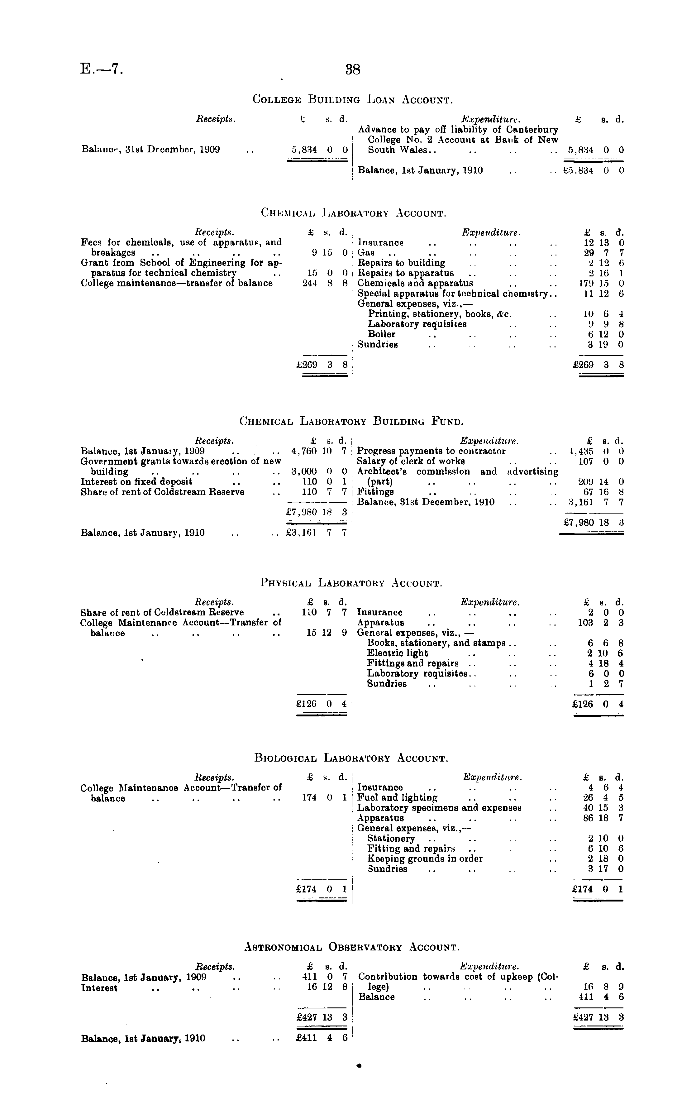 Receipts. £ s. d. Expenditure. t s. d. Advance to pay off liability of Canterbury College No. 2 Account at Bank of New Balance, 31st December, 1909 .. 5,834 0 0 South Wales.. .. .. 5,834 0 0 Balance, Ist January, 1910 .. £6,884 0 0 Chemical Laboratory Account. Receipts. £ s. d. Expenditure. £ s. d. Fees for ohemicals, use of apparatus, and lnsuranoe .. .. .. .. 12 13 0 breakages .. .. ' .. .. 915 0 Gas .. .. .. 29 7 7 Grant from School of Engineering for ap- Repairs to building 2 12 6 paratus for technical chemistry .. 15 0 0 Repairs to apparatus .. 2 16 1 College maintenance—transfer of balance 244 8 8 Chemicals and apparatus .. .. 179 15 0 Special apparatus for teohnical chemistry.. 11 12 6 General expenses, viz.,— Printing, stationery, books, <fee. .. 10 6 4 Laboratory requisites 9 9 8 Boiler .. .. 6 12 0 Sundries .. .. 3 19 0 £269 3 8 £269 3 8 Chemical Laboratory Building Fund. Receipts. £ s. d. Expenditure. £ a. d. Balance, Ist Januaiy, 1909 4,7611 111 7 Progress payments to contractor .. 1,435 0 0 Government grants towards erection of new Salary of clerk of works .. .. 107 0 0 building .. .. .. .. 3,000 (I 0 Architect's commission and advertising Interest on fixed deposit .. .. 110 0 1 (part) .. .. .. .. 209 14 0 Share of rent of Coldstream Reserve .. 110 7 7 Fittings .. .. 67 16 8 Balance, 31st December, 1910 .. 3,161 7 7 £7,980 18 3 -! £7,980 18 8 Balance, Ist January, 1910 .. £3,161 7 7 Physical Laboratory Account. Receipts. £ s. d. Expenditure. £ s. d. Share of rent of Coldstream Reserve .. 110 7 7 Insurance .. .. .. 2 0 0 College Maintenance Account—Transfer of Apparatus .. .. .. .. 103 2 3 balance .. .. .. .. 15 12 9 General expenses, viz., — Books, stationery, and stamps .. .. 6 6 8 Electric light .. .. 2 10 6 Fittings and repairs .. .. .. 418 4 Laboratory requisites.. .. 6 0 0 Sundries .. .. 12 7 £126 0 4 £126 0 4 Biological Laboratory Account. Receipts. £ s. d. Expenditure. £ s. d. College Maintenance Acoount—Transfer of Insurance .. .. .. .. 4 6 4 balance .. .. .. .. 174 0 1 Fuel and lighting .. .. .. 26 4 5 Laboratory specimens and expenses 40 15 3 Apparatus .. .. .. .. 86 18 7 General expenses, viz., — Stationery .. .. .. 210 0 Fitting and repairs .. .. 610 6 Keeping grounds in order .. 2 18 0 Sundries .. .. .. 3 17 0 £174 0 1 £174 0 1 Astronomical Observatory Account. Receipts. £ a. d. Expenditure. £ a. d. Balance, Ist January, 1909 .. .. 411 0 7 Contribution towards cost of upkeep (ColInterest .. .. .. •■ 16 12 8 lege) .. .. .. 16 8 9 Balance .. .. .. .. 4114 6 £427 13 3 £427 13 3 Balance, Ist January, 1910 .. £411 4 6