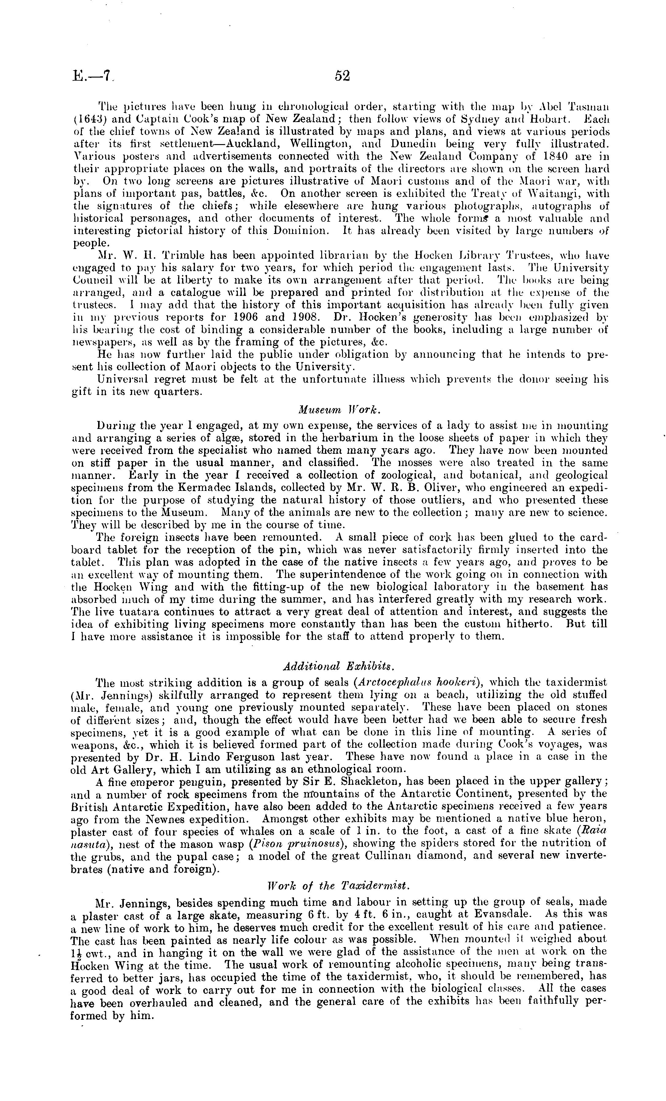 The pictures have been hung in chronological order, starting with the map by Abel Tasmau (1643) and Captain Cook's map of New Zealand; then follow views of Sydney and Hobart. Each of the chief towns of New Zealand is illustrated by maps and plans, and views at various periods after its first settlement —Auckland, Wellington, and Dunedin being wry fully illustrated. Various posters and advertisements connected with the New Zealand Company of 1840 are in their appropriate places on the walls, and portraits of the directors ere shown on the' screen hard by. On two long screens are pictures illustrative of Maori customs and of the Maori war. with plans of important pas, battles, eVc. On another screen is exhibited the Treaty of Waitangi, with the signatures of the chiefs; while elesewhere are hung various photographs, autographs of historical personages, and other documents of interest. The whole form* a most valuable' and interesting pictorial history of this Dominion. It has already been visited by large numbers of people. Mr. W. 11. Trimble has been appointed librarian by the Hocken Library Trustees, who have engaged to pay his salary for two years, for which period the engagement lasts. The University Council will be at liberty to make' its own arrangement after that period. The books are beingarranged, and a catalogue xvill be prepared and printed for distribution at the expense of the' trustees. I may add that the history of this important acquisition has already been fully given in my previous reports for 1906 and 1908. Dr. Hocken's generosity lias been emphasized b\ his bearing the cost of binding a considerable number of the books, including a large number of newspapers, as well as by the framing of the pictures, &c. He has now further laid the public tinder obligation by announcing that he intends to present his collection of Maori objects to the University. Universal regret must be felt at the unfortunate illness which prevents the donor seeing his gift in its new quarters. Museum Work. During the year 1 engaged, at my own expense, the services of a lad) to assist me in mounting and arranging a series of algse, stored in the herbarium in the loose' sheets of paper in which they were receix'ed from the specialist who named them many years ago. They have now been mounted on stiff paper in the usual manner, and classified. The mosses were also treated in the same manner. Early in the year I received a collection of zoological, and botanical, and geological specimens from the Kermadec Islands, collected by Mr. W. It. B. Oliver, who engineered an expedition for the purpose of studying the natural history of those outliers, and who presented these' specimens to the Museum. Many of the animals are new to the collection; many are new to science. They xvill lie described by me in the course of time. The' foreign insects have been remounted. A small piece of cork lias been glued to the cardboard tablet for the reception of the pin, xvhich xvas never satisfactorily firmly inserted into the tablet. This plan was adopted in the case of the native insects a few years ago, and proves to be an excellent way of mounting them. The superintendence of the work going on in connection with the Hocken Wing and with the fitting-up of the nexv biological laboratory in the basement has absorbed much of my time during the summer, and has interfered greatly with my research xvork. The live tuatara continues to attract a very great deal of attention and interest, and suggests the idea of exhibiting living specimens more constantly than has been the custom hitherto. But till J have more assistance it is impossible for the staff to attend properly to them. Additional Exhibits. The most striking addition is a group of seals (Arctocephalus hookeri), which the taxidermist (Mr. Jennings) skilfully arranged to represent them lying on a beach, utilizing the old stuffed male-, female', and young one previously mounted separately. These have been placed on stones of different sizes; and, though the effect would have been better had we been able to secure fresh specimens, yet it is a good example of xvhat can be done in this line of mounting. A series of weapons, &c, which it is believed formed part of the collection made during Cook's voyages, was presented by Dr. H. Lindo Ferguson last year. These have now found a place in a case in the old Art Gallery, which I am utilizing as an ethnological room. A fine emperor penguin, presented by Sir E. Shackletou, has been placed in the upper gallery; and a number of rock specimens from the mountains of the Antarctic Continent, presented by the British Antarctic Expedition, have also been added to the Antarctic specimens received a fexv years ago from the Newnes expedition. Amongst other exhibits may be mentioned a native blue heron, plaster cast of four species of whales on a scale of 1 in. to the foot, a cast of a fine skate (Raia nasuta), nest of the mason wasp (Pison pruinosus), showing the spiders stored for the nutrition of the grubs, and the pupal case; a model of the great Cullinan diamond, and several new invertebrates (native and foreign). Work of the Taxidermist. Mr. Jennings, besides spending much time and labour in setting up the group of seals, made a plaster cast of a large skate, measuring 6 ft. by 4 ft. 6 in., caught at Evansdale. As this xvas a new line of work to him, he deserves much credit for the excellent result of his care and patience. The cast has been painted as nearly life colour as xvas possible. AA T hen mounted it weighed about li cwt., and in hanging it on the wall xve were glad of the assistance of the men at work on the Hocken AVing at the time. The usual work of remounting alcoholic specimens, many being transferred to better jars, has occupied the time of the taxidermist, who, it should be remembered, has ;i good deal of work to carry out for me in connection with the biological classes. All the cases have been overhauled and cleaned, and th