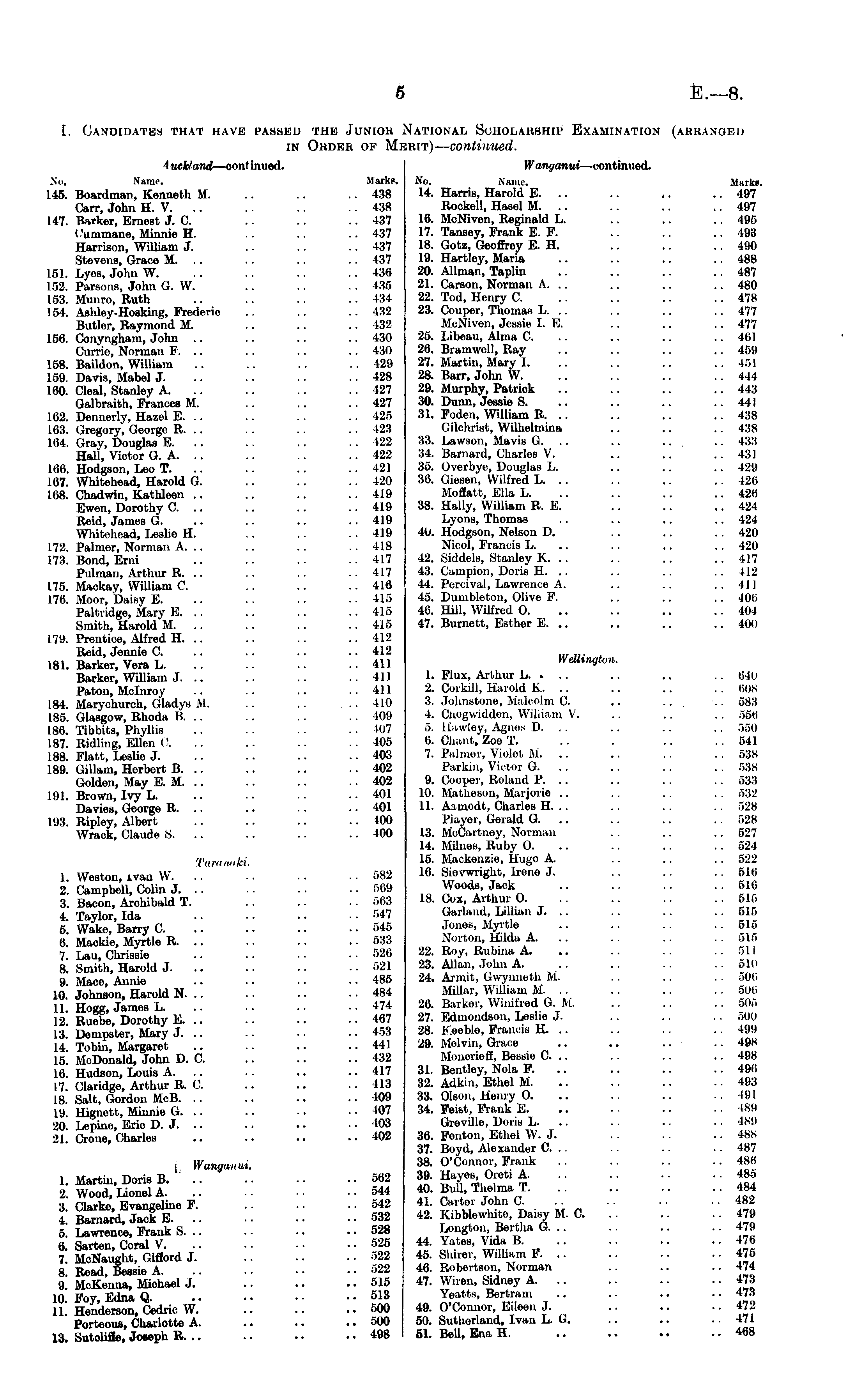 1. Candidates that have passed the Junior National Scholarship Examination (arranged in Ohder of Merit)— continued. 4 uekland —oont inued. Wanganui —continued. So, Name. M.-irk*. Nu. Name. Marto 145. Boardman, Kenneth M. .. .. .. 438 14- Harris, Harold E. .. .. .. .. 497 Carr, John H. V. .. .. .. .. 438 Kockcll, Hasel M. .. .. .. .. 497 147. Barker, Ernest J. C. .. .. ..437 16- McNiven, Reginald L. .. .. .. 495 I'umraane, Minnie H. .. .. ..437 17. Tansey, Frank E. F. .. .. ..493 Harrison, William J. .. .. .. 437 18. Gotz, Geoffrey E. H. .. . . .. 490 Stevens, Grace M. .. .. .. .. 437 19- Hartley, Maria .. .. .. .. 488 181. Lyes, John W. .. .. .. .. 436 20. Allman, Taplin .. .. .. .. 487 I 52. Parsons, John G. W. .. .. .. 135 21. Carson, Norman A. .. .. .. ..480 163. Munro, Ruth .. .. .. ..434 22. Tod, Henry C. .. .. .. ..478 154. Ashley-Hosking, Frederic .. .. ..432 23. Couper, Thomas L. .. .. .. ..477 Butler, Raymond M. .. .. .. 432 McNiven, Jessie I. E. .. .. .. 477 156. Conynghara, John .. .. .. ..430 25. Libeau, Alma C. .. .. .. ..461 Currie, Norman F. .. .. .. .. 430 26. Bramwell, Ray .. .. .. .. 459 158. Baildon, William .. .. .. .. 129 27. Martin, Mary I. .. .. .. ..451 159. Davis, Mabel J. .. .. .. .. 428 28. Barr, John W. .. . . .. .. 444 160. Cleal, Stanley A. .. .. .. 427 29. Murphy, Patrick .. .. .. .. 443 Galbraith, Frances M. .. .. .. 427 30. Dunn, Jessie S. .. .. .. .. 44] 162. Dennerly, Hazel E. .. .. . . .. 426 31. Foden, William R. .. .. .. .. 438 L 63. Gregory, George R. .. .. .. .. 423 Gilchrist, Wilhelinina .. .. . . 438 11)4. Gray, Douglas E. .. .. .. .. 422 33. Lawson, Mavis G. .. .. .. .. 433 Hall, Victor G. A. .. .. .. .. 422 34. Barnard, Charles V. .. .. . . 431 166. Hodgson, Leo T. .. .. .. ..421 35. Overbye, Douglas L. .. .. .. 129 n>7. Whitehead, Harold G. .. .. ..420 36. Giesen, Wilfred L. .. .. .. .. 426 168. Chadwin, Kathleen .. .. .. .. 419 Moflatt, Ella L. .. .. .. .. 426 Ewen, Dorothy C. .. .. .. .. 419 38. Hally, William R. E. .. .. .. 424 Reid, James G. .. .. .. .. 419 Lyons, Thomas .. .. .. .. 424 Whitehead, Leslie H. .. .. .. 419 40. Hodgson, Nelson D. .. .. . . 420 172. Palmer, Norman A. .. .. .. .. 418 Nicol, Francis L. .. .. .. .. 420 173. Bond, Erni .. .. .. ..417 42. Siddels, Stanley K. .. .. .. ..417 Pulman, Arthur R. .. .. .. ..417 43. Campion, Doris H. .. .. .. ..412 175. Mackay, William C. .. .. .. 416 44. Percival, Lawrence A. .. .. ..411 176. Moor, Daisy E. .. .. .. .. 415 45. Dumbleton, Olive F. .. .. .. 40l> Paltridge, Mary E. .. .. .. .. 415 46. Hill, Wilfred 0. .. .. .. .. 404 Smith, Harold M. .. .. .. .. 415 47. Burnett, Esther E. .. .. .. .. 400 179. Prentice, Alfred H. .. .. .. .. 412 Reid, Jennie C. .. .. .. .. 412 . 181. Barker, Vera L 411 WeUuujl,;,. Barker, William J. .. .. .. ..411 1. Flux, Arthur L. . .. .. .. .. 640 Paton, Mclnroy .. .. .. ..411 2. Oorkill, Harold K. .. .. .. .. 808 184. Marychurch, Gladys M. .. .. .. 410 3. Johnstone, Malcolm 0. .. .. .. 583 185. Glasgow, Rhoda R .. .. .. .409 4. Gnegwidden, William V. .. .. .. 55»i 186. Tibbits, Phyllis .. .. .. ..407 6. Hawley, Agnes D. .. .. .. .. 560 187. Ridling, Ellen ('. .. .. .. ..405 6. Chant, Zoe T. .. . .. ..541 188. Flatt, Leslie J. .. .. .. .. 403 7. Palmer, Violot iM. .. .. . . . . 538 189. Gillam, Herbert B. .. .. .. .. 402 Parkin, Victor G. .. .. .. . . 688 Golden, May E. M. .. .. . . .. 402 9. Cooper, Roland P. .. .. . . . . 533 191. Brown, Ivy L. .. .. .. • ■ 401 10. Matheson, Marjorie .. .. .. . . r>32 Davies, George R. .. .. .. ..101 U. Aamodt, Charles H. .. .. .. . 528 193. Ripley, Albert .. .. .. .. »00 Player, Gerald G. .. .. .. .528 Wrack, Claude S. .. .. . . .. 400 13. McCartney, Norman . . .. .. 527 14. Milues, Ruby O. .. . . .. . . 624 Turn mi hi 15. Mackenzie, Hugo A, .. .. .. 522 1. Weston, ivan W. .. .' 582 Iβ. Siovwriglit, Irene J. 516 2. Campbell, Colin J 569 Woods Jack 5 6 3. Bacon, Archibald T. 663 18. Cox Arthur O. 616 4 Taylor, Ida .. .. • •• • '"'47 Garland, Lillian J. .. .. .. .. 515 5. Wake, Barry C 546 Jones, Myrtle 515 6. Maekie, Myrtle R 533 Norton, Hilda A 515 7 Lav, Chrissie 526 22. Roy, Rubma A .. ..511 8. Smith, Harold J 52] 23. Allan, John A. 610 9 Mace, Annie .. .. .. .. 485 24. Armit, Gwyiuieth M. .. .. 606 10. Johnson, Harold N 484 Millar, William At 606 11 Hoeg James L. .. ... .. .. 474 26. Barker, Winifred G. At. .. .. . . 505 12 Ruebe, Dorothy E 467 27. Edmondson, Leslie J. .. .. ..600 13' Dempster, Mary J 453 28. K.eoble, Francis H 499 14. Tobin, Margaret 441 29. Melvin, Grace 498 15. AlcDonald, John D. C 432 Monorieff. Bessie C 498 16. Hudson, Louis A 417 31. Bentley, Nola F 496 17 Claridge, Arthur R. C. .. .. .. 413 32. Adkin, lUhel M. .. .. .. .. 493 L 8 Salt, Gordon Mcß. .. .. .. ..409 33. Olson, Henry O. .. .. .. ..491 19 Hignett, Minnie G. .. .. •■ ■ • 107 34. Feist, Frank E. .. .. .. .. 48» 20 Lepiiie, Eric D. J. .. .. •• • • 403 Greville, Doris L. .. .. .. .. 489 M Crone Charles .. .. .. .. 402 36. Fenton, Ethel W. J. .. .. .. 488 37. Boyd, Alexander C. .. . ... .. '187 I WanganuL 38. O'Connor, Frank 486 1 Martin Doris B . 562 39. Hayes, Oreti A. .. .. .. .. 480 kwETiES* :: :: •■- «* XW'Vr? & •i Clarke Evanceline F. .. .. .. 542 41. Carter John C. .. .. .. . . 482 ißaZ^TJack E 532 42. Kibblewhite Daisy M. C 479 5. Lawrence, Frank S 528 Bertha G 479 6 Sarten Coral V 525 44. Yates, Vida B 471> 522 45. Shhev. William F. .. ..475 8 Read, Bessie A 522 46. Robertson, Norman 474 9 McKenna, Michael J. 515 47. When, Sidney A .. 473 10 Foy Edna Q. .. .. ■ • .. 513 Yeattx, Bertram .. .. .. • • 473 ll! Henderson, Oedric W 500 49. O'Connor, Eileen J. 472 Porteous, Charlotte A. .. .. ..500 50. Sutherland, Ivan L. b. .. .. ..471 13. Sutolifie, Joseph R 498 61. BeU, Ena H. 468
