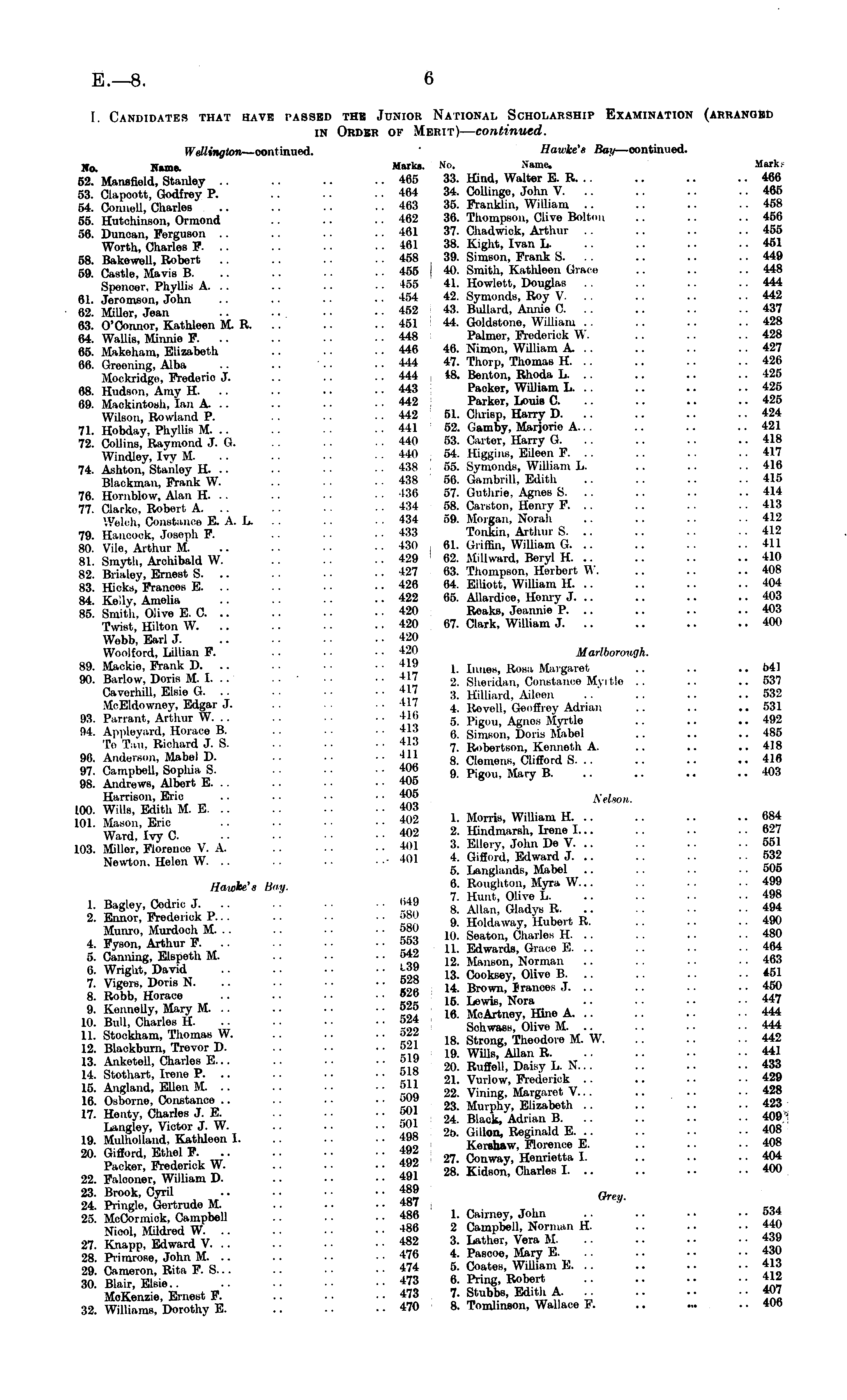 I. Candidates that have passed the Junior National Scholarship Examination (arranged in Order of Merit) — continued. Wellington— continued. " Hawke's Bay— continued. No. Nam*. Maike. No. Xame. Mark.--52. Mansfield, Stanley 465 33. Hind, Walter E. R 466 53. Clapcott, Godfrey P. .. .. .. 464 34. Colhnge, John V. .. .. .. .. 465 54. Counell, Charles .. .. .. .. 463 35. Franklin, William .. .. .. . . 458 55. Hutchinson, Orraond 462 36. Thompson, Glive Bolton 456 56. Duncan, Ferguson .. .. .. .. 461 37. Chadwiok, Arthur .. .. .. .. 455 Worth, Charles F. .. .. .. .. 461 38. Kight, Ivan L 451 58. Bakewell, Robert .. .. .. .. 458 39. Simeon, Frank S. . . .. .. .. 449 59 Castle Mavis B. .. .. • • ■ • 455 40. Smith, Kathleen Grace .. .. .. 448 Spencer, Phyllis A. .. .. .. .. +55 41. Hewlett, Douglas .. .. .. .. 444 81. Jeromson, John .. 454 42. Symonds, Roy V 442 62. Millor, Jean .. .. • • .. 452 43. Bullard, Annie C. . . .. .. .. 437 63. O'Connor, Kathleen M. R. .. .. .. 451 44. Goldstone, William .. .. .. .. 428 64. Wallis, Minnie F. .. .. .. .. 448 Palmor, Fredorick W. .. .. .. 428 65. Makohain, Elizabeth 446 46. Nimon, William A. .. 427 66. Greening, Alba .. .. ■ • .. 444 47. Thorp, Thomas H 426 Mookridge, Frederic J 444 48. Benton, Rhoda L 425 68. Hudson, Amy H 443 Packer, William L 425 69. Mackintosh, lan A. .. .. • • .. 442 Parker, Louie C. .. .. .. .. 425 Wilson, Rowland P. .. ■ • .. 442 51. Ohrisp, Harry D 424 71. Hobday, Phyllis M. .. .. ■■ ..441 52. Gamby, Marjono A.. .. .. ..421 72. Collins, Raymond J. G. .. .. ■ • 440 53. Garter, Harry G. . . .. .. .. 418 Windley, Ivy M. .. • • 440 54. Higgins, Eileen F. .. .. . . .. 417 74. Ashton, Stanley H. .. .. • • .. 438 55. Symonds, William L. .. .. . . 416 Blackman, Frank W. . . .. .. 438 56. Gambrill, Edith .. .. .. .. 415 76. Hornblow, Alan H. .. .. • • ■ ■ 136 57. Guthrie, Agnes S. .. .. •• .. 414 77. Clarko, Robert A. .. .. . • .. 434 58. Cartston, Henry F. .. .. .. .. 413 Wulrli, Constance E. A. L. .. ■■ ..434 59. Morgan, Norah .. .. .. ..412 79. Hancock, Joseph F. .. .. .. 433 Tonkin, Arthur S. .. .. .. .. 412 80 Vile Arthur M. .. .. •• .430 61. Griffin, William G. .. .. .. ..411 81. Smyth, Archibald W. 429 ' 62. Millward, Beryl H 410 82. Brialoy, Ernest S. .. .. ■ • .. 427 63. Thompson, Herbert \\. .. .. .. 408 83. Hicks,' Frances E 426 64. Elliott, William H 404 84 Kelly, Amelia .. .. .. .. 422 65. Allardice, Homy J. .. .. .. .. 403 85. Smith, Oiive E. C. .. .. • • .. 420 Reaks, Jeannie P. .. .. .. .. 403 Twist, Hilton W. 420 67. Clark, William J 400 Webb, Earl J. .. .. • • .. 420 Woolford, Lillian F. .. . ■ • ■ 420 Marlborongh. 89. Mackie, Frank D. .. .. • • • • *Jβ L IluieK; Kotiil Margaret .. • • .. b4l 90. Barlow, Doris M. I. .. •• • • "til 2. Sheridan, Constance Myrtle .. .. .. 537 Caverhill, Elsie G. .. .. •• • • «.7 3. Hilliard, Aileen .. .. .. ..532 McEldowney, Edgar J. .. •• 417 4. Rovell, Geoffrey Adrian .. .. ..531 93. Parrant, Arthur W. .. .. .. •• Mβ 5. Pigou, Agnos Myrtle .. .. ..492 94. Appleyard, Horace B. .. .. • • *f-» 6- Simson, Doris Mabel .. .. .. 485 To Tau, Richard J. S. 413 7. Robertson, Kenneth A 418 96. Anderson, Mabel D. 11 8 . Clemens, Clifford S 416 97. Campbell, Sophia S. 40b 9. Km,,,, Mary B 403 98. Andrews, Albert E. .. .. ■ •.. 406 6 Harrison, Erie .. .. .. • • 405 Ndaon. 100. Wills, Edith M. E. .. .. •• ..403 ... _.„. v fis , 101. Mason, Eric 402 Li Moms, William H 684 Wild Ivy C • • 402 2. Hmdmarsh, Irene 1... .. .. .. b^7 103. Mi'llor', Florence V. A.' 401 3. Ellery John Dβ V 551 Newton. Helen W -401 4. G.ff.rd Edward J 532 5. Langlands, Mabel .. .. .. .. 005 Hawke's Hoy. 6. Roughton, Myra W 499 . _ . „, . T KdO 7. Hunt, Olive L. .. .. • • .. 498 1. Bagley, Cednc J Mβ 8 . Allan, Gladys R 494 2 - E-mor, Frederick P.. 680 9. H oldaway, Hubert R 490 unr °' »^ doC fe m 10 Beaton, Charles H 480 4. Fyson, Arthur F. .. -• U. Edwards, Grace E 464 J Canning, Elspeth M. 042 Mauson No rman 463 6. Wng.it, David olive B 451 7- Vigers, Doris N 528 Brown, I ranees J 450 8. Robb Horace 626 15 Nora 447 .?' ET?^ , i Z 524 16. McArtney, Hine A 444 10. Bull Charles H. .. 524 Sohwaw, (Hive M 444 11. Stockham, Thomas W 022 Theodore M. W 442 12. Blackburn, Trevor D 521 f 3 Ankotell, Charles E 5 9 R 433 4 - Stothart, I»ne P. 5 8 ow> 429 15. Angland, Ellen M 511 2 2. Vining, Margaret V 428 16. Osborne Comtance 009 B y , Elizabeth 423 17. Honty, Charles J X .. .. o0 24. Black, Adrian B 409 n g7' lICII IC l° r ,n i 4QB 26. Gillon, Reginald E 408 19. Mulholland KatlUeon 1 498 Kerghkw, Florence E 408 20- « lfi « rd - Bth? 1 ?• " fl 27. Conway, Henrietta 1 404 Packer, Frederick W 492 2 i Kmo l' GhSkTlm X 400 22. Falconer, William 1). .. • • • • *<> l 23. Brook, Cyril 489 24. Pringle, Gertrude M. .. •• • • 487 * 25. McCormick, Campbell 486 1. Cairney, John 534 Niool, Mildred W 486 2 Campbell Norman H 440 27. Knapp, Edward V 482 3. Lather, Vera M. 439 28. Primrose, John M 476 4. Pascoe Mary E 430 29. Cameron, Rita F. S 474 5. Coates, WiU.am & 4 3 30. Blair, Elsie 473 6. Pring, Robert 412 MoKenzie, Ernest F 473 7. Stubbs, Edith A. „ 407 32. Williams. Dorothy E 470 8. Tomlineon, Wallace F 406