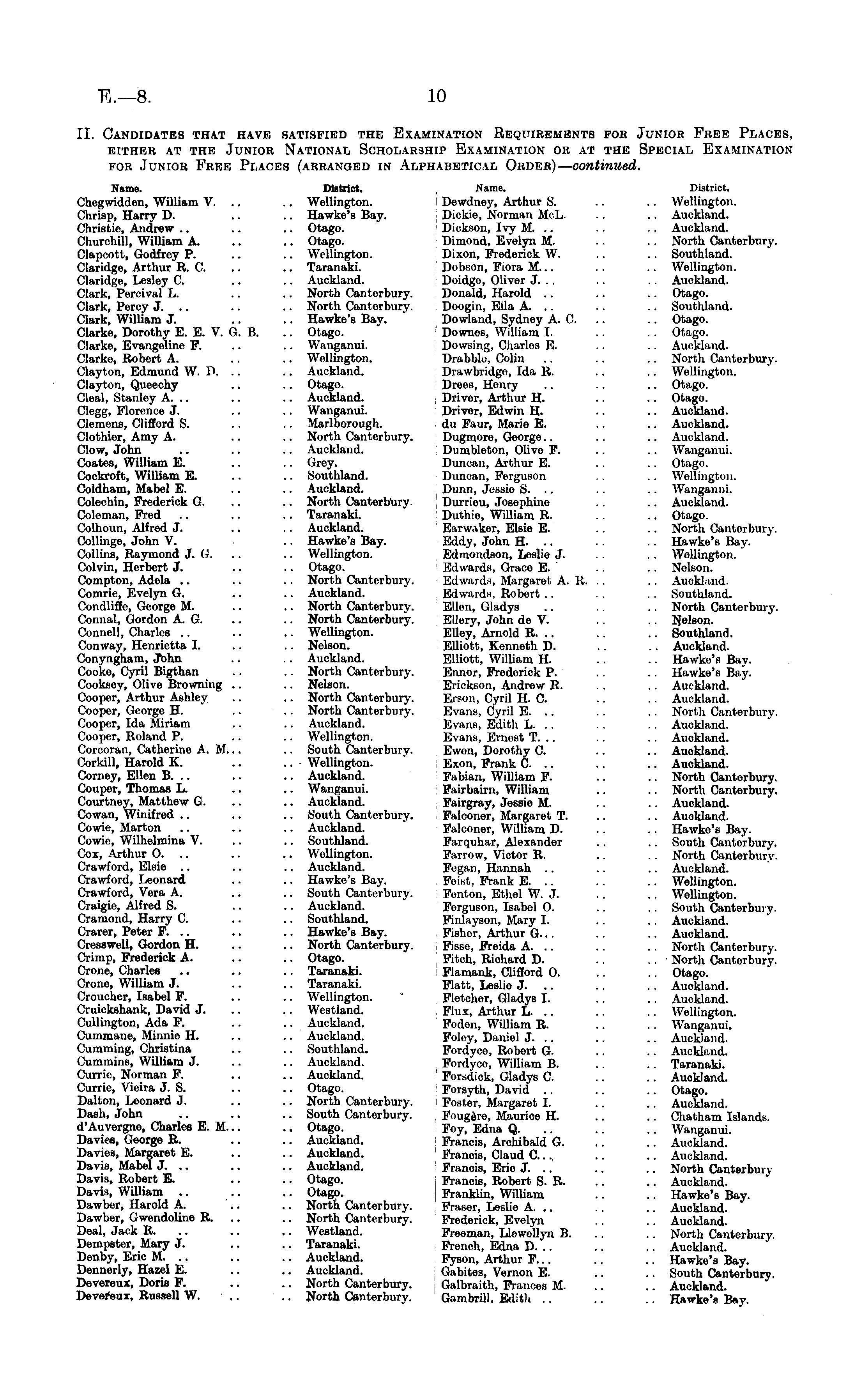 11. Candidates that have satisfied the Examination Requirements for Junior Free Places, EITHER AT THK JUNIOR NATIONAL SCHOLARSHIP EXAMINATION OK AT THE SPECIAL EXAMINATION for Junior Free Places (arranged in Alphabetical Order) — continued. Name. District. , Name. District. Chegwidden, William V. .. .. Wellington. Dewdney, Arthur S. .. .. Wellington. Chrisp, Harry D. .. .. Hawke's Bay. Dickie, Norman McL. .. .. Auckland. Christie, Andrew .. .. .. Otago. Dickson, Ivy M. .. .. . . Auckland. Churchill, William A. .. .. Otago. Dimond, Evelyn M. .. .. North Cantorbmy. Clapcott, Godfrey P. .. .. Wellington. Dixon, Frederick W. .. .. Southland. Claridge, Arthur R. C. .. .. Taranaki. Dobson, Flora M... .. .. Wellington. Claridge, Lesley C. .. .. Auckland. Doidgo, Olivor J. .. .. . . Auckland. Clark, Percival L. .. .. North Canterbury. Donald, Harold .. .. .. Otago. Clark, Percy J. .. .. .. North Canterbury. , Doogin, Ella A. .. .. . . Southland. Clark, William J. .. .. Hawke's Bay. Dowland, Sydney A. C. .. .. Otago. Clarke, Dorothy E. E. V. G. B. .. Otago. Downes, William I. .. . . Otago. Clarke, Evangeline F. .. .. Wanganui. Dowsing, Charles E. .. .. Auckland. Clarke, Robert A. .. .. Wellington. Drabble, Colin .. .. .. North Canterbury. Clayton, Edmund W. D. .. .. Auckland. Drawbridgo, Ida R. .. .. Wellington. Clayton, Queechy .. .. Otago. Drees, Honry . . .. .. Otago. Cleal, Stanley A. .. .. .. Auckland. Driver, Arthur I{. .. .. Otago. Clegg, Florence J. .. .. Wanganui. Driver, Edwin H. .. .. Auckland. Clemens, Clifford S. .. .. Marlborough. dv Faur, Marie E. .. .. Auckland. Clothier, Amy A. .. .. North Canterbury. Dugmore, Goorgo.. .. .. Auckland. Clow, John .. .. .. Auckland. Dumbleton, Olivo F. .. .. Wanganui. Coates, William E. .. .. Grey. Duncan, Arthur E. .. .. Otago. Cockroft, William E. .. .. Southland. Duncan, Ferguson . . . . Wellington. Coldham, Mabel E. .. .. Auckland. Dunn, Jessio S. .. .. .. Wanganui. Colechin, Frederick G. .. .. North Canterbury Durrieu, Josephine . . .. Auckland. Coleman, Fred .. .. .. Taranaki. Duthio, William R. .. .. Otago. Colhoun, Alfred J. .. .. Auckland. E&rwaker, Elsie E. .. .. North Canterbury. Collinge, John V. . .. Hawke's Bay. Eddy, John H. .. . . .. Hawko's Bay. Collins, Raymond J. Q. .. .. Wellington. Edmondson, Leslio J. .. . . Wellington. Colvin, Herbert J. .. .. Otago. Edwards, Grace E. .. .. Nelson. Compton, Adela .. .. .. North Canterbury. Edwards, Margaret A. R. .. .. Auckland. Comrie, Evelyn G. .. .. Auckland. Edwards, Robert .. .. . . Southland. Condliffe, George M. .. .. North Canterbury. Ellon, Gladys .. . . . . North Canterbury. Connal, Gordon A. G. .. .. North Canterbury. Ellery, John de V. .. .. Nelson. Connell, Charles .. .. .. Wellington. Elloy, Arnold R. .. .. . . Southland. Conway, Henrietta I. .. .. Nelson. Elliott, Kenneth D. .. . . Auckland. Conyngham, John .. .. Auckland. Elliott, William H. .. .. Hawko's Bay. Cooke, Cyril Bigthan .. .. North Canterbury. Ennor, Frederick P. . . .. Hawke's Bay. Cooksey, Olive Browning .. .. Nelson. Erickson, Androw R. .. .. Auckland. Cooper, Arthur Ashley .. .. North Canterbury. Erson, Cyril H. C. .. . . Auckland. Cooper, George H. .. .. North Canterbury. Evans, Cyril E. .. . . .. North Canterbury. Cooper, Ida Miriam .. .. Auckland. Evans, Edith L. .. .. .. Auckland. Cooper, Roland P. .. .. Wellington. Evans, Ernest T. .. . . .. Auckland. Corcoran, Catherine A. M... . . South Canterbury. Ewen, Dorothy C. .. .. Auckland. Corkill, Harold K. .. .. Wellington. Exon, Frank C. .. .. .. Auckland. Corney, Ellen B. .. .. .. Auckland. Fabian, William F. .. .. North Canterbury. Couper, Thomas L. .. .. Wanganui. Pairbairn, William .. .. North Canterbury. Courtney, Matthew G. .. .. Auckland. Fairgray, Jessie M. .. .. Auckland. Cowan, Winifred .. .. .. South Canterbury. Falconer, Margaret T. .. .. Auckland. Cowie, Marton .. .. .. Auckland. Falconer, William D. .. .. Hawke's Bay. Cowie, Wilhelmina V. .. .. Southland. Farquhar, Alexander .. .. South Canterbury. Cox, Arthur 0. .. .. .. Wellington. Farrow, Victor R. .. . . North Canterbury. Crawford, Elsie .. .. .. Auckland. Pugan, Hannah .. .. .. Auckland. Crawford, Leonard .. .. Hawke's Bay. Feist, Frank E. .. .. .. Wellington. Crawford, Vera A. .. .. South Canterbury. Fenton, Ethel W. J. .. Wellington. Craigie, Alfred S. .. .. Auckland. Ferguson, Isabol 0. .. .. South Canterbury. Cramond, Harry C. .. .. Southland. Finlayson, Mary I. .. .. Auckland. Crarer, Peter F. .. .. .. Hawke's Bay. Fisher, Arthur G... .. .. Auckland. Cresswell, Gordon H. .. .. North Canterbury. Fisso, Freida A. .. .. .. North Canterbury. Crimp, Frederick A. .. .. Otago. Pitch, Richard D. . . .. ■ North Canterbury. Crone, Charles .. .. .. Taranaki. Flamank, Clifford 0. . . .. Otago. Crone, William J. .. .. Taranaki. Flatt, Leslie J. .. .. .. Auckland. Croucher, Isabel F. .. .. Wellington. Fletcher, Gladys I. .. .. Auckland. Cruickshank, David J. .. .. Westland. Flux, Arthur L. .. .. .. Wellington. Cullington, Ada F. .. .. Auckland. Foden, William R. .. .. Wanganui. Cummane, Minnie H. .. .. Auckland. Foley, Daniel J. .. .. .. Auckland. Cumming, Christina .. .. Southland. Fordyce, Robert G. .. .. Auckland. Cummins, William J. .. .. Auckland. Fordyce, William B. .. .. Taranaki. Currie, Norman F. .. .. Auckland. ' Forsdick, Gladys C. .. .. Auckland. Curric, Vieira J. S. .. .. Otago. Forsyth, David .. .. .. Otago. Dalton, Leonard J. .. .. North Canterbury. Foster, Margarot I. .. .. Auckland. Dash, John .. .. .. South Canterbury. , Fougere, Maurice H. .. .. Chatham Islands. d'Auvergne, Charles E. M... .. Otago. Foy, Edna Q. .. .. .. Wanganui. Davies, George R. .. .. Auckland. Francis, Archibald G. .. .. Auckland. Davies, Margaret E. .. .. Auckland. Francis, Claud C... .. .. Auckland. Davis, Mabel J. .. .. .. Auckland. Francis, Eric J. .. .. .. North Canterbury Davis, Robert E. .. .. Otago. Francis, Robert S. R. .. .. Auckland. Davis, William .. .. .. Otago. Franklin, William .. .. Hawke's B