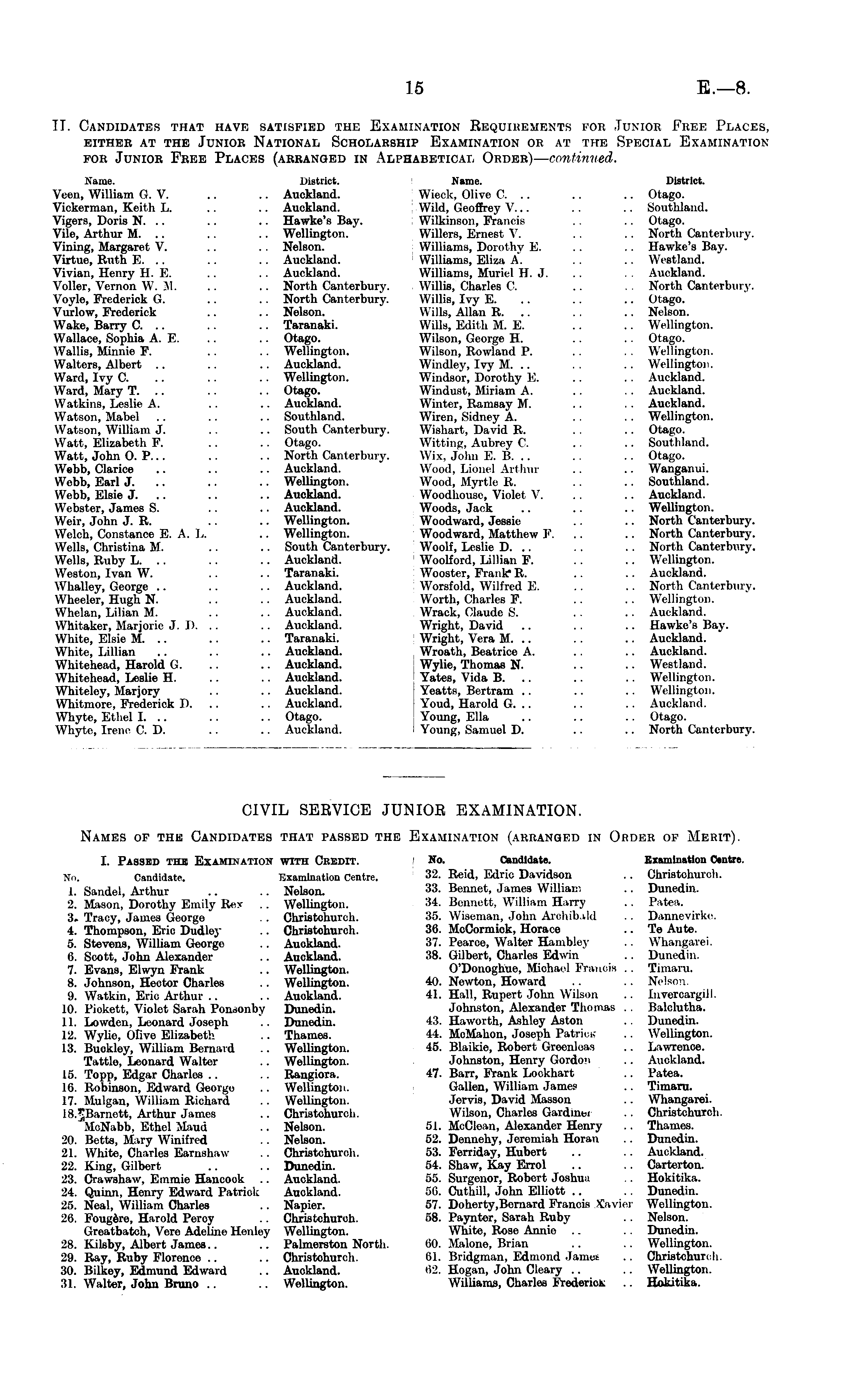 IT. Candidates that have satisfied the Examination Requirements foe Junior Free Places, EITHER AT THE JUNIOR NATIONAL SCHOLARSHIP EXAMINATION OR AT THE SPECIAL EXAMINATION for Junior Free Places (arranged in Alphabetical Order) — continued. Name. Jiistrict. Name. District. Veen, William G. V. .. .. Auckland. Wieek, Olive C. .. .. .. Otago. Vickerman, Keith L. .. .. Auckland. Wild, Geoffrey V... . . .. Southland. Vigers, Doris N. .. .. .. Hawke's Bay. Wilkinson, Francis .. .. Otago. Vile, Arthur M. .. .. .. Wellington. Willers, Ernest V. .. .. North Canterbury. Vining, Margaret V. .. . . Nelson. Williams, Dorothy E. .. .. Hawke's Bay. Virtue, Ruth B. .. .. . . Auckland. Williams, Eliza A. .. .. Westland. Vivian, Henry H. E. .. .. Auckland. Williams, Muriel H. J. .. .. Auckland. Voller, Vernon W. -M. .. .. North Canterbury. Willis, Charles 0. .. . . North Canterbury. Voyle, Frederick G. .. .. North Canterbury. Willis, Ivy E. .. .. .. Otago. Vurlow, Frederick .. .. Nelson. Wills, Allan R. .. .. .. Nelson. Wake, Barry C. .. .. .. Taranaki. Wills, Edith M. E. .. .. Wellington. Wallace, Sophia A. E. .. .. Otago. Wilson, George H. ..' . . Otago. Wallis, Minnie F. .. . . Wellington. Wilson, Rowland P. .. .. Wellington. Walters, Albert .. .. .. Auckland. Windley, Ivy M. .. .. .. Wellington. Ward, Ivy C. .. .. .. Wellington. Windsor, Dorothy E. .. . . Auckland. Ward, Mary T. .. .. .. Otago. Windust, Miriam A. .. .. Auckland. Watkins, Leslie A. .. .. Auckland. Winter, Ramsay M. .. . . Auckland. Watson, Mabel .. .. .. Southland. Wiren, Sidney A. .. . . Wellington. Watson, William J. .. .. South Canterbury. Wishart, David R. .. .. Otago. Watt, Elizabeth F. .. .. Otago. Witting, Aubrey C. .. .. Southland. Watt, John 0. P... .. .. North Canterbury. Wix, John E. B. .. .. .. Otago. Webb, Clarice .. .. .. Auckland. Wood, Lionel Arthur .. .. Wanganui. Webb, Earl J. .. .. Wellington. Wood, Myrtle R. .. .. Southland. Webb, Elsie J. .. .. Auckland. Woodhousc, Violet V. .. .. Auckland. Webster, James S. .. .. Auckland. Woods, Jack .. .. .. Wellington. Weir, John J. R. .. .. Wellington. Woodward, Jessie .. .. North Canterbury. Welch, Constance E. A. L. .. Wellington. Woodward, Matthew F. .. .. North Canterbury. Wells, Christina M. .. .. South Canterbury. Woolf, Leslie D. .. .. . . North Canterbury. Wells, Ruby L. .. .. .. Auckland. Woolford, Lillian F. . . .. Wellington. Weston, Ivan W. .. .. Taranaki. Wooster, Frank* R. .. .. Auckland. Whalley, George .. .. .. Auckland. Worsfold, Wilfred E. .. .. North Canterbury. Wheeler, Hugh N. .. .. Auckland. Worth, Charles F. .. .. Wellington. Whelan, Lilian M. .. .. Auckland. Wrack, Claude S. . . .. Auckland. Whitaker, Marjorie J. I). .. .. Auckland. Wright, David .. . . .. Hawke's Bay. White, Elsie M. .. .. .. Taranaki. Wright, Vera M. .. . . .. Auckland. White, Lillian .. .. .. Auckland. Wroath, Beatrice A. .. .. Auckland. Whitehead, Harold G. .. .. Auckland. Wylie, Thomas N. .. .. Westland. Whitehead, Leslie H. .. .. Auckland. Yates, Vida B. .. .. .. Wellington. Whiteley, Marjory .. .. Auckland. Yeatts, Bertram .. .. .. Wellington. Whitmore, Frederick D. .. .. Auckland. Youd, Harold G. .. .. .. Auckland. Whyte, Ethel I. .. .. .. Otago. Young, Ella .. .. .. Otago. Whyte, Irene CD. .. .. Auckland. Young, Samuel D. .. .. North Canterbury.
