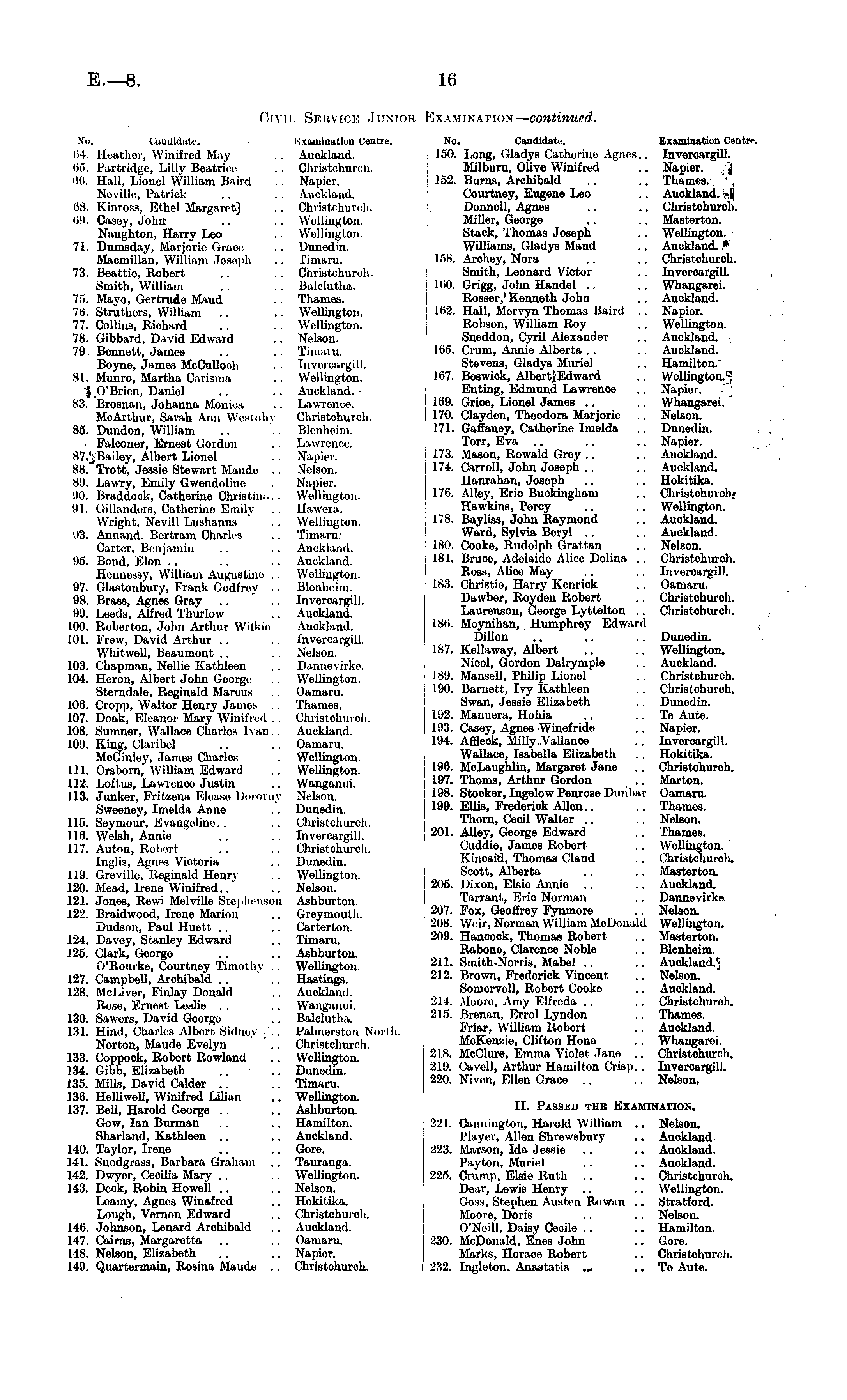 Civil Service Junior Examination— continued. So. Candidate. Kxamination Centre* , No. Candidate. Examination Centre, t>4. Heather, Winifred May .. Auckland. 160. Long, Gladys Catherine Agues.. Inveroargill. i>s. Partridge, Lilly Beatiiir .. Christchurcu. Milburn, Olive Winifred .. Napier. J liii. Hall, Lionel William Baird .. Napier. 152. Burns, Archibald .. .. Thames/.' , , Neville, l'atriok . . .. Auckland. Courtney, Eugene Leo .. Auckland, -i 88. Kinross, Ethel Margin-' .. Christchurc-h. Donnell, Agnes .. .. Christchurch. 69. Casey, John .. .. Wellington. Miller, George .. .. Masterton. Naughton, Harry Leo . . Wellington. Staok, Thomas Joseph .. Wellington. 71. Dumsday, Marjorie Grace .. Dunedin. Williams, Gladys Maud .. Auckland.,* Macmillan, William Joseph .. Timaru. l r » s - Arohey, Nora .. .. Christohuroh. 73. Beattio, Robert .. .. Christchuruh. Smith, Leonard Victor .. Inveroargill. Smith, William .. .. Balclutha. 160. Grigg, John Handel .. .. Whangarei. 75. Mayo, Gertrude Maud .. Thames. Rosser,' Kenneth John .. Auckland. 76. Strutters, William .. .. Wellington. il>2. Hall, Morvyn Thomas Band .. Napier. 77. Collins, Richard .. .. Wellington. Robson, William Roy .. Wellington. 78. Gibbard, David Edward .. Nelson. Sneddon, Cyril Alexander .. Auckland. - 79. Bennett, James .. .. Tima.ru. 165. Crum, Annie Alberta .. .. Auckland. Boyne, James McCullocli . . Invercargill. Stevens, Gladys Muriel .. Hamilton.", 81. Munro, Martha Oarisma .. Wellington. 167. Beswiok, AlbertjEdward .. Wellington. ' Daniel .. .. Auckland. Enting, Edmund Lawrence .. Napier. S3. Brosnan, Johanna Moniwi .. Lawrenoe. 169. Grioe, Lionel James .. .. Whangarei.* MoArthur, Sarah Ann WVsiobv Christchurch. 170. Clayden, Theodora Marjorie .. Nelson. 85. Dundon, William .. . Blenheim. 171. Gaffaney, Catherine Imelda .. Dunedin. Falconer, Ernest Gordon .. Lawrenoe. Torr, Eva .. .. .. Napier. 87,' Bailey, Albert Lionel .. Napier. 173. Mason, Rowald Grey .. .. Auckland. 88. Trott, Jessie Stewart Maude . . Nelson. 174. Carroll, John Joseph .. .. Auckland. 89. Lawry, Emily Gwendoline . Napier. Hanrahan, Joseph .. .. Hokitika. 90. Braddock, Catherine Christina.. Wellington. 176. Alley, Erio Buckingham .. Christchurch; 91. Gillanders, Catherine Emily . . Hawera. Hawkins, Percy .. .. Wellington. Wright, Nevill Lushanus .. Wellington. 178. Bayliss, John Raymond .. Auckland. 93. Annand, Bertram Charles . . Timaru: Ward, Sylvia Beryl .. .. Auckland. Carter, Benjamin .. .. Auckland. 18 °- Cooke, Rudolph Grattan .. Nelson. 95. Bond, Elon .. .. .. Auckland. 181. Bruce, Adelaide Alice Dolina .. Christchurch. Hennessy, William Augustine . . Wellington. Ross. Aiio ° Ma y • • • • Inveroargill. 97. Glastonbury, Frank Godfrey . . Blenheim. 183 - Christie, Harry Kenriok .. Oamaru. 98. Brass, Agnes Gray .. . . InvercargilJ. Dawber, Royden Robert .. Christchuroh. 99. Leods, Alfred Thurlow .. Auckland. Laurenson, George Lyttelton .. Christohurch. 100. Roberton, John Arthur Wilkie Auckland. 18, - Moynihan, Humphrey Edward 101. Frew, David Arthur .. .. Invercargill. Dillon •• • ■ • • Dunedin. Whitwell, Beaumont .. .. Nelson. 187 - Kellaway, Albert .. .. Wellington. 103. Chapman, Nellie Kathleen .. Dannevirko. Nicol, Gordon Dalrymple .. Auckland. 104. Heron, Albert John George .. Wellington. 189 - Mansell, Philip Lionel .. Christchurch. Sterndale, Reginald Marcus Oamaru. 19 0- Barnett, Ivy Kathleen .. Christchurch. 106. Cropp, Walter Henry James . . Thames. Swan, Jessie Elizabeth .. Dunedin. 107. Doak, Eleanor Mary Winifred .. Christchurch. 192 - Manuera, Hohia .. .. Tβ Aute. 108. Sumner, Wallace Charles Ivan.. Auckland. 193. Casey, Agnes Winefnde .. Napier. 109. King, Claribel .. .. Oamaru. 194. Affleck, Hilly.Vallanoe .. Invercargill. McGinley, James Charles . Wellington. Wallace, Isabella Elizabeth .. Hokitika. 111. Orsborn, William Edward .. Wellington. 196. MoLaughlin, Margaret Jane .. Christohuroh. 112. Loftus, Lawrence Justin .. Wangamii. 19 7- Thorns, Arthur Gordon .. Marton. 113. Junker, Fritzena Elease Dniomv Nelson. 198. Stacker, Ingelow Penrose DunUir Oamaru. Sweeney, Imelda Anne . Dunedin. 199. Ellis, Frederick Allon.. .. Thames. 115. Seymour, Evangeline.. .. Christchurch. Thorn, Cecil Walter .. .. Nelson. 116. Welsh, Annie . InvercargilJ. 201. Alley, George Edward . . Thames. 117. Auton, Robort .. .. Christchurch. Cuddie, James Robert . . Wellington. India ignes Victoria Dunedin. Kincaid, Thomas Claud . . Christchuroh. 119. Grevillo, Reginald Henry .. Wellington. „ Soott > Alberta .. .. Masterton. 120. ilead, Irene Winifred. . Nelson. 205. Dixon, Elsie Annie .. .. Auckland. 121. Jones, Rowi Melville Stephenson Ashburton. Tarrant, Erio Norman . . Dannevirke 122. Braidwood, Irene Marion .. Greymouth. 207 - Fox > Geoffrey Fynmore . . Nelson. Dudson, Paul Huett Cartorton. 208. Weir, Norman William McDonald Wellington. 124. Davey, Stanley Edward . . Timaru. 209 - Hanoook, Thomas Robert .. Masterton. 125 Clark, George Ashburton Rabone, Clarence Noble .. Blenheim. O'Rourke, Courtney Timot liv .. Wellington. 211. Smith-Norris, Mabel .. .. Auckland.^ 127. Campbell, Archibald .. .. Hastings. 212 - Brown, Frederick Vincent .. Nelson. 128. MoLiver, Finlay Donald .. Auokland. . Somervoll, Robort Cooke .. Auckland. Rose, Ernest Leslie .. .. Wanganui. 2U - iloure > Am y Elfreda .. . . Christchuroh. 130. Sawers, David George .. Balclutha. 215 - Brenan, Errol Lyndon . . Thames. 131. Hind, Charles Albert Sidney .. Palmerston North. Friar, William Robort .. Auckland. Norton, Maude Evelyn . . Christchurch. MoKenzie, Clifton Hone . . Whangaroi. 133 Coppook, Robert Rowland Wellington 2la MoClure, Emma Violet Jane .. Chnstohurch. 134. Gibb, Elizabeth Dunedin 219. Caveil, Arthur Hamilton Crisp.. Invercargill. 135. Mills, David Calder .. .. Timaru. 22 °- Niven > Ellen Grace •• • • Nelson. 136. Helliwell, Winifred Lilian .. Wellington. 137. Bell, Harold George . . .. Ashburton. n - Passed the Examination. Gow, lan Burma