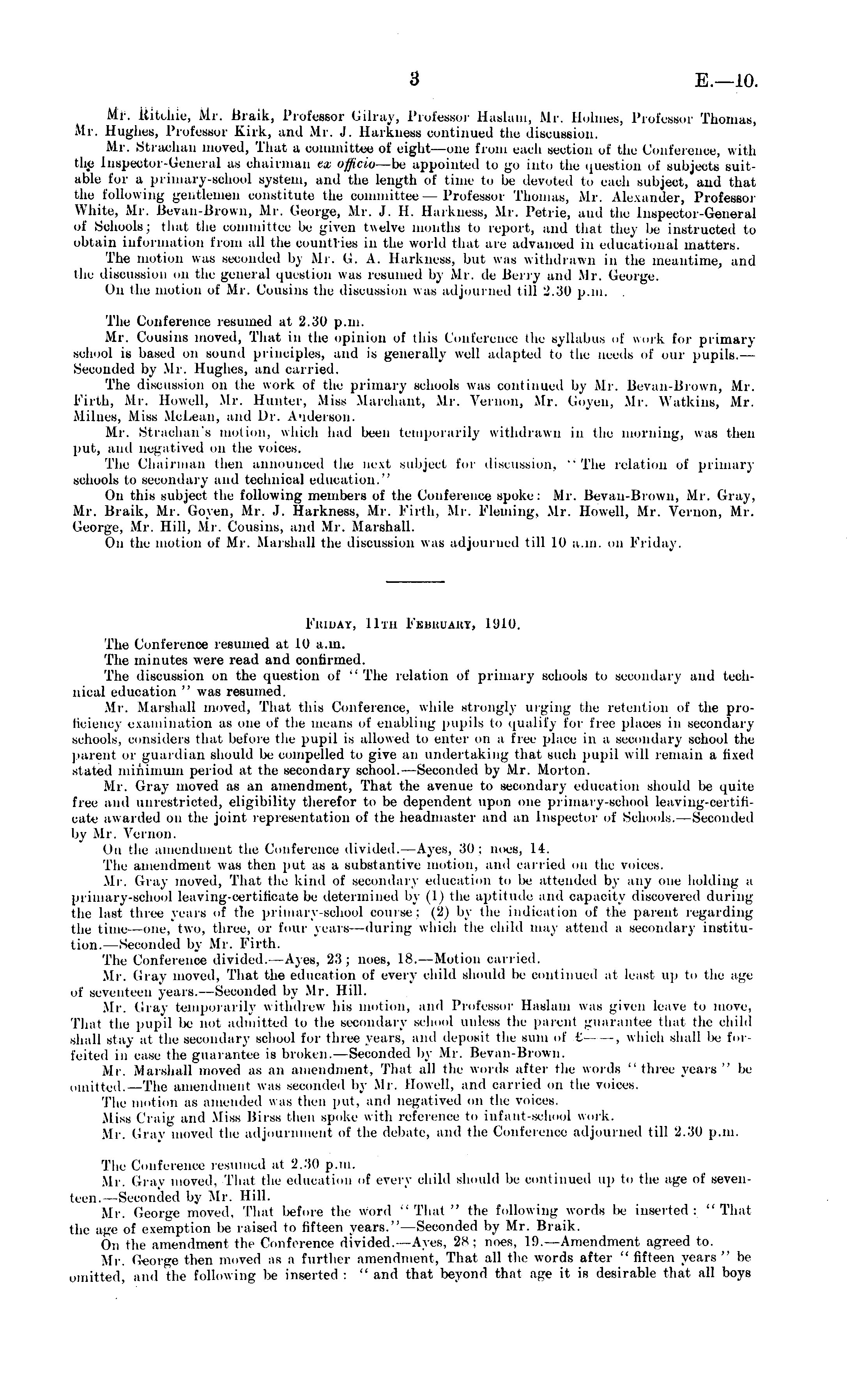 Mr. kitohie, Air. Uraik, Professor Gilray, Professor Haslam, Mr. Holmes, Professor Thomas, Mr. Hughes, Professor Kirk, and Mr. J. Harkness continued the discussion. Mr. Strachau moved, That a ooinmittee of eight—one from each section of the Conference, with the Inspector-General as chairman ex officio —be appointed to go into the question of subjects suitable for a primary-school system, and the length of time to be devoted to each subject, and that the following gentlemen constitute the committee —Professor Thomas, Air. Alexander, Professor White, Mr. Bevan-Brown, Mr. George, Mr. J. 11. Harkness, Mr. Petric, and the Inspector-General of Schools; that the committee be given twelve months to report, and that they be instructed to obtain information from all the countries in the world that are advanced in educational matters. The motion was seconded by Mr. (i. A. Harkness, but was withdrawn in the meantime, and the discussion on the general question was resumed by Air. de Berry and Mr. George. On the motion of Air. Cousins the discussion was adjourned till '2.'SO p.m. The Conference resumed at 2.00 p.m. Mr. Cousins moved, That in the opinion of this Conference the syllabus of work for primary school is based on sound principles, and is generally well adapted to the needs of our pupils.— Seconded by Mr. Hughes, and carried. The discussion on the work of the primary schools was continued by Mr. Bevan-Brown, Mr. Firth, Mr. Howell, Mr. Hunter, Aliss Marchant, Mr. Vernon, Mr. Goyen, Mr. Watkins, Mr. Milnes, Miss McLean, and Dr. Anderson. All-. Strachan's motion, which had been temporarily withdrawn in the morning, was then put, and negatived on the voices. The Chairman then announced the next subject for discussion, "The relation of primary schools to secondary and technical education." On this subject the following members of the Conference spoke: Air. Bevan-Brown, All , . Gray, Mr. Braik, Air. Goyen, Mr. J. Harkness, Mr. Firth, Mr. Fleming, Mr. Howell, Mr. Vernon, Mr. George, Air. Hill, Air. Cousins, and Mr. Marshall. On the motion of Air. Marshall the discussion was adjourned till 10 a.m. on Friday. FIiIDAY, 11th FIiBKUAItY, I'JlO. The Conference resumed at JO a.m. The minutes were read and confirmed. The discussion on the question of "The relation of primary schools to secondary and technical education " was resumed. Mr. Marshall moved, That this Conference, while strongly urging the retention of the proficiency examination as one of the means of enabling pupils to qualify for free places in secondare schools, considers that before the pupil is allowed to enter on a free place in a secondary school the parent or guardian should be compelled to give an undertaking that such pupil will remain a fixed slated minimum period at the secondary school. —Seconded by Air. Morton. Mr. Gray moved as an amendment, That the avenue to secondary education should be quite free and unrestricted, eligibility therefor to be dependent upon one primary-school leavitig-certifi-cate awarded on the joint representation of the headmaster and an Inspector of Schools. — Seconded by Mr. Vernon. On the amendment the Conference divided.—Ayes, •">((; noes, 14. The amendment was then put as a substantive motion, and oarried on the voices. Mr. Gray moved, That the kind of secondary education to be attended by any one holding a primary-school leaving-certiticate be determined by (I ) the aptitude and capacity discovered during the last three years of the primary-school course; (2) by the indication of the parent regarding the time—one, two, three, or lour years (luring which the child may attend a secondary institution.— Seconded by Mr. Firth. The Conference divided. Ayes. 2-' i ; noes, 18. —Motion carried. Mr. Gray moved, That the education of every child should be continued at least up to the age of seventeen years. —Seconded by Mr. Hill. All , . Gray temporarily withdrew his motion, and Professor Ilaslam was given leave to move. That the pupil Ije not admitted to the secondary be] 1 unless the parent guarantee that the child shall stay at the secondary school for three years, and deposit the sum of £ —, which shall be forfeited in" ease the guarantee is broken. —Seconded by Mr. Hevan-Krown. Mr. Marshall moved as an amendment. That all the wurds after the weirds "three years" be omitted.—The amendment was seconded by Mr. Howell, and carried on the voices. The motion as amended was then put. and negatived on the voices. Mis.s Craig and Miss Birse then spoke with reference to infant-school work. Mi-. Gray moved the adjournment of the debate, and the Conference adjourned till 2..'i(J p.m. The Conference resumed at 2.30 p.m. Mr. <!rav moved. Thai the education of every child should be continued up to the age of seveilteen. Seconded by Mr. Hill. Mr. George moved. That before the word "That" the following words Ik; inserted: "That the age of exemption be raised lo fifteen years."—Seconded by Mr. Braik. ():i the amendment the Conference divided.--Ayes, 28; noes, 19.—Amendment agreed to. Mr. CvorLre then moved as a further amendment. That all the words after "fifteen years" be omitted, and the following be inserted : " and that beyond that age it in desirable that all boys
