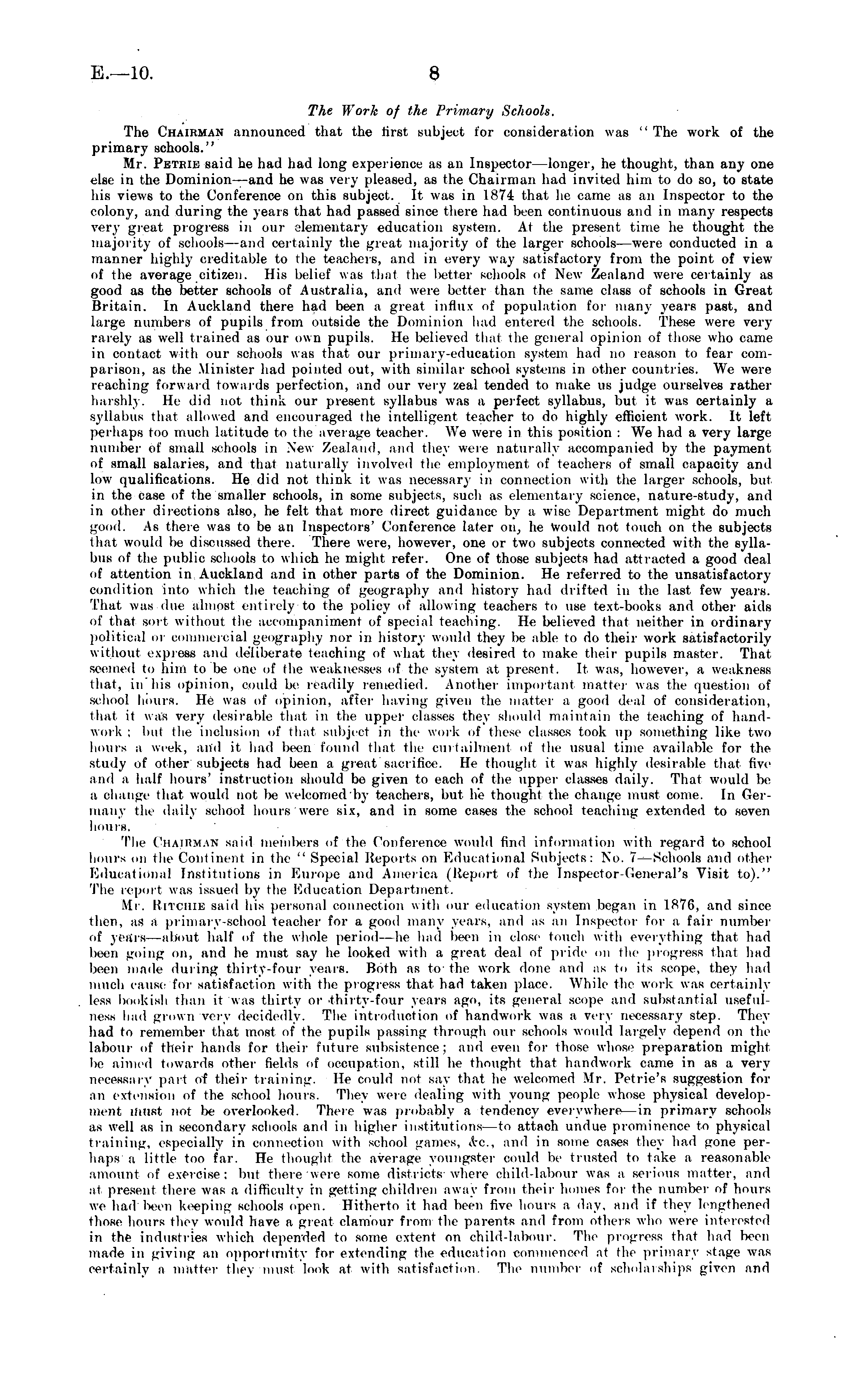 The Work of the Primary Schools. The Chairman announced that the first subject for consideration was " The work of the primary schools." Mr. Petrie said he had had long experience as an Inspector—longer, he thought, than any one else in the Dominion —and he was vei y pleased, as the Chairman had invited him to do so, to state his views to the Conference on this subject. It was in 1874 that he oame as an Inspector to the colony, and during the years that had passed since there had been continuous and in many respects very great progress in our elementary education system. At the present time he thought the majority of schools—and certainly the great majority of the larger schools—were conducted in a manner highly creditable to the teachers, and in every way satisfactory from the point of view of the average citizen. His belief was thai the better schools of New Zealand were certainly as good as the better schools of Australia, anil were better than the same class of schools in Great Britain. In Auckland there had been a great influx of population for many years past, and large numbers of pupils from outside the Dominion had entered the schools. These were very rarely as well trained as our own pupils. Iff believed thai the general opinion of those who came in contact with our schools was (hat our primary-education system had no reason to fear comparison, as iho Miiiisier had pointed out, with similar school systems in other countries. We were leaching forward towards perfection, and our xvi\ zeal tended to make us judge ourselves rather harshly. He did not think our present syllabus was a perfect syllabus, but it was certainly a syllabus that allowed and encouraged the intelligent teacher to do highly efficient work. It left perhaps too much latitude to the average teacher. \Ye were in this position :We had a very large number of small schools in New Zealand, anil they were naturally accompanied by the payment of small salaries, and that naturally involved the employment of teachers of small capacity and low qualifications. He did not think it was necessary in connection witli the larger schools, but in the case of the smaller schools, in some subjects, such as elementary science, nature-study, and in other directions also, he felt that more direct guidance by a wise Department might do much good. As there was to be an Inspectors' Conference later on, he would not touch on the subjects ih.it would be discussed there. There were, however, one or two subjects connected with the syllabus of tin , public schools to which lie might refer. One of those subjects had attracted a good deal of attention in Auckland and in other parts of the Dominion. He referred to the unsatisfactory condition into which the teaching df geography and history had drifted in the last few years. That was due almost entirely to the policy of allowing teachers to use text-books and other aids of that sort without tin' accompaniment of special teaching. He believed that neither in ordinary political or commercial geography nor in history would they be aisle to do their work satisfactorily without express and deliberate teaching of what they desired to make their pupils master. That seemed to him to be one of the weaknesses of the system at present. It was, however, a weakness that, in his opinion, could be readily remedied. Another important matter was the question of school hours. He was of opinion, after having given the matter a good deal of consideration, ilia! it was very desirable that in the upper classes thov should maintain the teaching of handwork : but the inclusion of that subject in the work of these classes took up something like two hours a week, and it had been found that the cm (ailment of (h< , usual lime available for tho study of other subjects had been a great sacrifice. He thought it was highly desirable that live and a half hours' instruction should be given to each of ihe upper classes daily. That would lie a ohatlge that would not lie welcomed by teachers, but he thought tlio change must come. In Germany the daily school hours were six, and in some cases the school teaching extended to seven hours. The CHAIRMAN said members of the Conference would find information with regard to school hours on the Continent in the " Special Reports on Educational Subjects: No. 7 Schools and other Educational Institutions in Europe and America (Report of the Inspector-General's Visit to)." The report was issued by the Education Department. Mr. RITCHIE said his personal connection with our education system began in 1876, and since then, as a priniar\ -school teacher for a good many years, and as an Inspector for a fair number of years about half of Ihe whole period he had been in close touch with everything that had been going on, and lie must say h< , looked with a great deal of pride on the progress that had been made dm ing thirty-four years. Both as to the work done and as to its scope, they had much cause for satisfaction with the progress that had taken place. While the work was certainly less bookish than it was thirty or thirty-four years ago, its general scope anil substantial usefulness had grown very decidedly. The introduction of handwork was a very necessary step. They had to remember that most of the pupils passing through our schools would largely depend on the labour of their hands for their future subsistence; and even for those whose preparation might be aimed towards other Holds of occupation, still he thought that handwork came in as a very necessary part of their training. He could not say that ho welcomed Ml , . I'etrie's suggestion for an extension of the school hours. They wore dealing with young people whoso physical development must not be overlooked. There was probably a tendency everywhere in primary schools as well as in secondary schools ami in higher institutions — to attach undue prominence to physical training, especially in connection with school games, &c.; and in some 