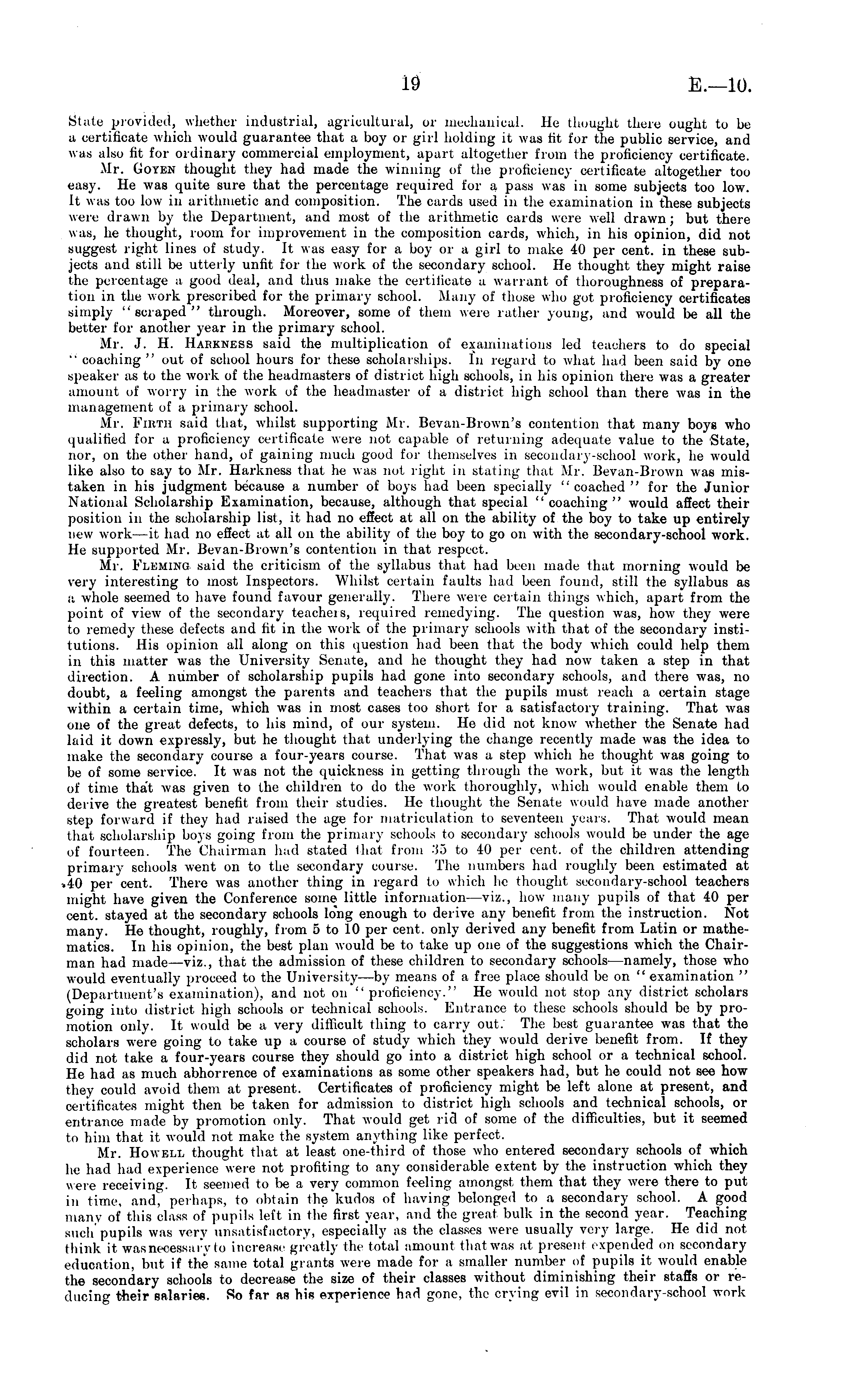 State provided, whether industrial, agricultural, or mechanical. He thought there ought to be a certificate which xvould guarantee that a boy or girl holding it was fit for the public service, and was also fit for ordinary commercial employment, apart altogether from the proficiency certificate. Mr. Goyen thought they had made the winning of the proficiency certificate altogether too easy. He was quite sure that the percentage required for a pass was in some subjects too low. It was too low in arithmetic and composition. The cards used in the examination in these subjects were drawn by the Department, and most of the arithmetic cards were xvell drawn; but there was, he thought, room for improvement in the composition cards, which, in his opinion, did not suggest right lines of study. It was easy for a boy or a girl to make 40 per cent, in these subjects and still be utterly unfit for the work of the secondary school. He thought they might raise the percentage a good deal, and thus make the certificate a warrant of thoroughness of preparation in the work prescribed for the primary school. Many of those who got proficiency certificates simply "scraped" through. Moreover, some of them xvere rather young, and would be all the better for another year in the primary school. Mr. J. H. Harkness said the multiplication of examinations led teachers to do special " coaching" out of school hours for these scholarships. In regard to what had been said by one speaker as to the work of the headmasters of district high schools, in his opinion there was a greater amount of worry in ihe xvork of the headmaster of a district high school than there xvas in the management of a primary school. Mr. Firth said that, whilst supporting Mr. Bevan-Brown's contention that many boys who qualified for a proficiency certificate were not capable of returning adequate value to the State, nor, on the other hand, of gaining much good for themselves in secondary-school xvork, he xvould like also to say to Mr. Harkness that he was not right in stating that Mr. Bevan-Brown xvas mistaken in his judgment because a number of boys had been specially "coached" for the Junior National Scholarship Examination, because, although that special "coaching" would affect their position in the scholarship list, it had no effect at all on the ability of the boy to take up entirely new xvork—it had no effect at all on the ability of the boy to go on with the secondary-school xvork. He supported Mr. Bevan-Brown's contention in that respect. Mr. Fleming said the criticism of the syllabus that had been made that morning would be very interesting to most Inspectors. Whilst certain faults had been found, still the syllabus as a xvhole seemed to have found favour generally. There xvere certain things xvhich, apart from the point of view of the secondary teacheis, required remedying. The question was, how they were to remedy these defects and fit in the work of the primary schools xvith that of the secondary institutions. His opinion all along on this question had been that the body xvhich could help them in this matter was the University Senate, and he thought they had now taken a step in that direction. A number of scholarship pupils had gone into secondary schools, and there xvas, no doubt, a feeling amongst the parents and teachers that the pupils must reach a certain stage within a certain time, which xvas in most cases too short for a satisfactory training. That xvas one of the great defects, to his mind, of our system. He did not know whether the Senate had laid it down expressly, but he thought that underlying the change recently made xvas the idea to make the secondary course a four-years course. That xvas a step xvhich he thought was going to be of some service. It xvas not the quickness in getting through the xvork, but it xvas the length of time that xvas given to the children to do the xvork thoroughly, which would enable them to derive the greatest benefit from their studies. He thought the Senate would have made another step forward if they had raised the age for matriculation to seventeen years. That xvould mean that scholarship boys going from the primary schools to secondary schools xvould be under the age of fourteen. The Chairman had stated that from 35 to 40 per cent, of the children attending primary schools went on to the secondary course. The numbers had roughly been estimated at .40 per cent. There xvas another thing in regard to which he thought secondary-school teachers might have given the Conference some little information—viz., how many pupils of that 40 per cent, stayed at the secondary schools long enough to derive any benefit from the instruction. Not many. He thought, roughly, from sto 10 per cent, only derived any benefit from Latin or mathematics. In his opinion, the best plan xvould be to take up one of the suggestions which the Chairman had made —viz., that the admission of these children to secondary schools —namely, those who would eventually proceed to the University —by means of a free place should be on " examination " (Department's examination), and not on " proficiency." He xvould not stop any district scholars going into district high schools or technical schools. Entrance to these schools should be by promotion only. It would be a very difficult thing to carry out." The best guarantee was that the scholars xvere going to take up a course of study xvhich they xvould derive benefit from. If they did not take a four-years course they should go into a district high school or a technical school. He had as much abhorrence of examinations as some other speakers had, but he could not see how they could avoid them at present. Certificates of proficiency might be left alone at present, and certificates might then be taken for admission to district high schools and technical schools, or entrance made by promotion only. That would get rid of some of the difficulties, but it seemed to him that it xvould no