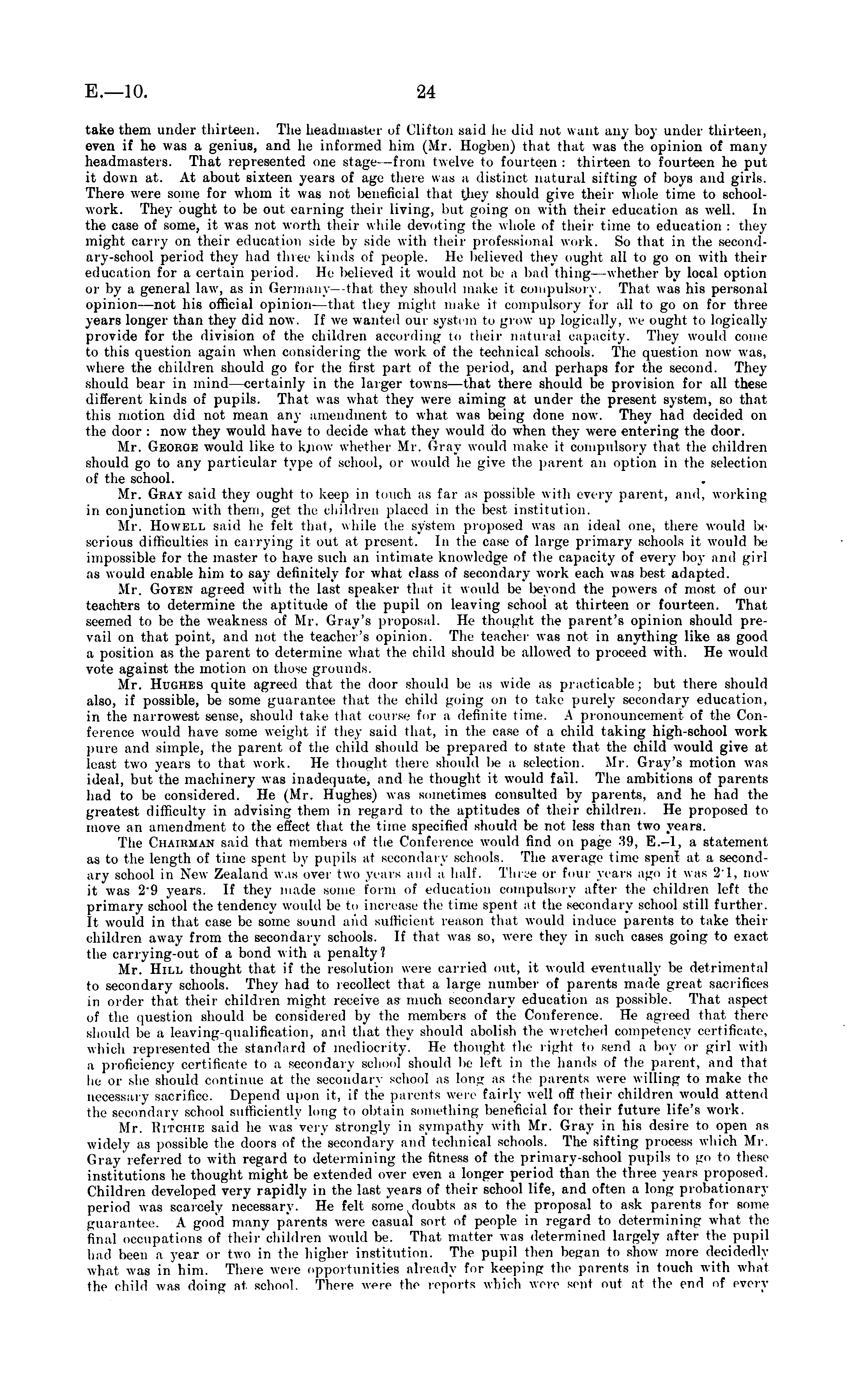 take them under thirteen. The headmaster of Clifton said lie did not want any boy under thirteen, even if he was a genius, and he informed him (Mr. Hogben) that that was the opinion of many headmasters. That represented one stage —from twelve to fourteen : thirteen to fourteen he put it down at. At about sixteen years of age there was a distinct natural sifting of boys and girls. There were some for whom it was not beneficial that they should give their whole time to schoolwork. They ought to be out earning their living, but going on with their education as well. In the case of some, it was not worth their while devoting the whole of their time to education : they might can , } , on their education side by side with their professional work. So that in the second-ary-school period they had three kinds of people. He believed they might all to go on with their education for a certain period. He believed it would not lie a bad thing- -whether by local option or by a general law, as in Germany that they should make it compulsory. That was his personal opinion—not his official opinion—thai they might make it compulsory for all to go on for three years longer than they did now. If we wanted our systi in to grow up logically, we ought to logically provide for the division of the children according to their natural capaoity. They would come to this question again when considering the work of the technical schools. The question now was, where the children should go for the first part of the period, and perhaps for the second. They should bear in mind—certainly in the larger towns —that there should be provision for all these different kinds of pupils. That was what they were aiming at under the present system, so that this motion did not mean any amendment to what was being done now. They had decided on the door : now they would have to decide what they would do when they were entering the door. Mr. George would like to know whether Mr. Gray would make it compulsory that the children should go to any particular type of school, or would In , give the parent an option in the selection of the school. Mr. Gray said they ought to keep in touch as far as possible with every parent, and, working in conjunction with them, get the children placed in the best institution. Mr. Howell said he felt that, while the system proposed was an ideal one, there would Iμ , serious difficulties in carrying it out at present. In the case of large primary schools it would l>e impossible for the master to have such an intimate knowledge of the capacity of every boy and girl as would enable him to say definitely for what class of secondary work each was best adapted. Mr. Goten agreed with the last speaker that it would lie beyond the powers of most of our teachers to determine the aptitude of the pupil on leaving school at thirteen or fourteen. That seemed to be the weakness of Mr. Gray's proposal. He thought the parent's opinion should prevail on that point, and not the teacher's opinion. The teach* r was not in anything like as good a position as the parent to determine what the child should be allowed to proceed with. He would vote against the motion on those grounds. Mr. Hughes quite agreed that the door should lie as wide as practicable; but there should also, if possible, be some guarantee that the child going on to take purely secondary education, in the narrowest sense, should take that course for a definite time. A pronouncement of the Conference would have some weight it' they said that, in the ease of a child taking high-school work pure and simple, the parent of the child should be prepared to state that the child would give at least two years to that work. He thought there should be a selection. Mr. Gray's motion was i ileal, but the machinery was inadequate, and he thought it would fall. The ambitions of parents had to be considered. He (Mr. Hughes) was sometimes consulted by parents, and he had the greatest difficulty in advising them in regard to the aptitudes of their children. He proposed to move an amendment to the effect that the time specified should be not less than two years. The Chairman said that members of the Conference would find on page •'!!), E.-l, a statement as to the length of time spent by pupils at secondary school's. The average time spent at a secondary school in New Zealand was over two years and a half. Three or four years ago it was 21, now it was 2"9 years. If they made some form of education compulsory after the children left the primary school the tendency would be to increase the time spent at the secondary school still further. It would in that case be some sound and sufficient reason that would induce parents to take their children away from the secondary schools. If that was so, were they in such cases going to exact the carrying-out of a bond with a penalty? Mr. Hill thought that it' the resolution were carried out, it would eventually be detrimental to secondary schools. They had to recollect that a large number of parents made great sacrifices in order that their children might receive as much secondary education as possible. That aspect of the question should be considered by the members of the Conference. He agreed that there should be a leaving-qualification, and that they should abolish the wretched competency certificate, which represented the standard of mediocrity. He thought the right to send a boy or girl with a proficiency certificate to a secondary school should be left in the hands of the parent, and that he or she should continue at the secondary school as long as the parents were willing to make the necessary sacrifice. Depend upon it, if the parents were fairly well off their children would attend the secondary school sufficiently long to obtain something beneficial for their future life's work. Mr. Ritchie said he was very strongly in sympathy with Mr. Gray in his desire to open as widely as possible the doors of the secondary and technical schoo