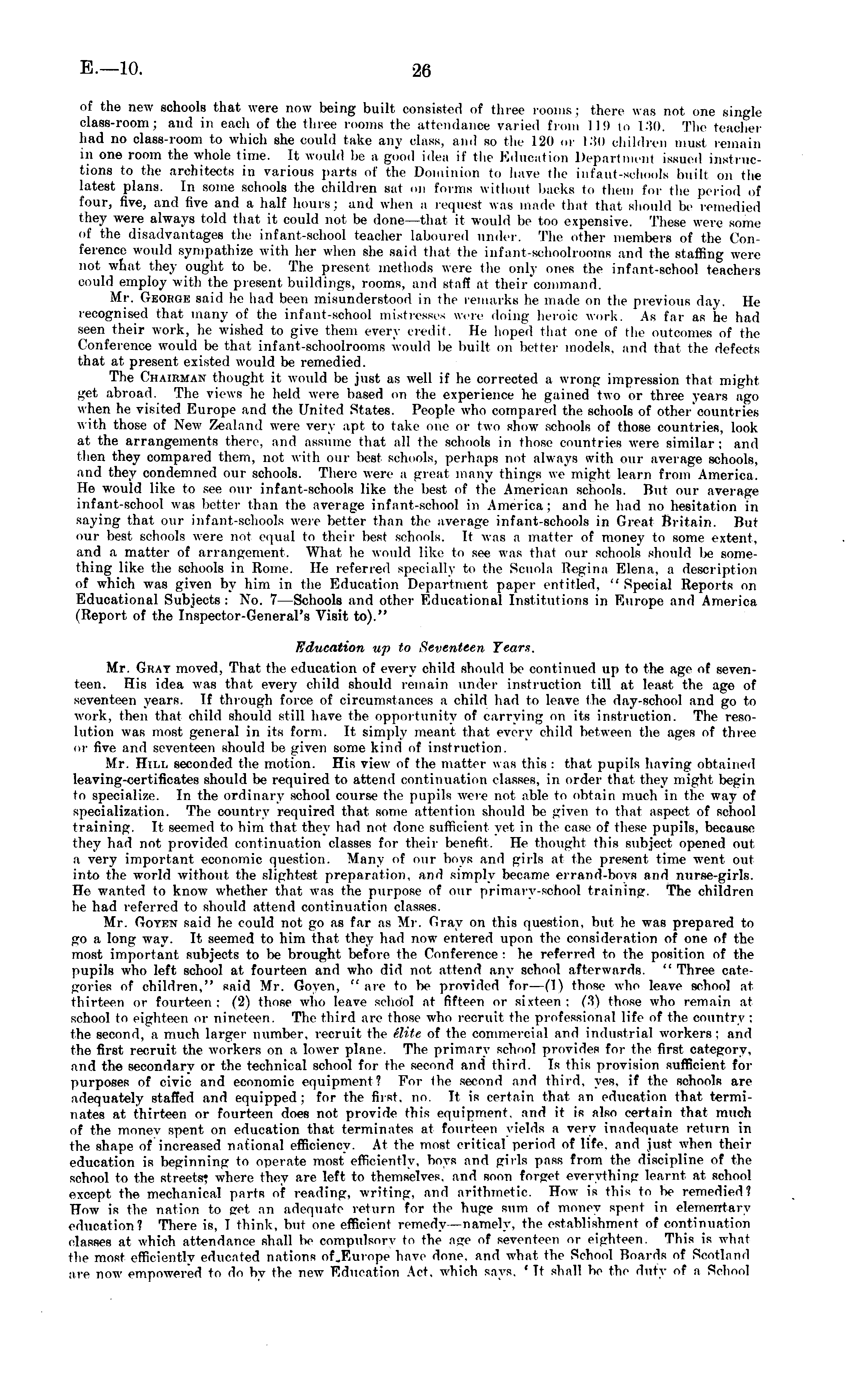 of the new schools that were now being built consisted of three rooms; there was not one single class-room; and in each of the three rooms the attendance varied from I I!) to 130. The teacher had no class-room to which she could take any class, and so the 120 or 130 ohildren must remain in one room the whole time. It would be a good idea if the Education Department issued instructions to the architects in various parts of the Dominion to have the infant-sel Is built on the latest plans. In some schools the children sal on Forms without backs to them for the period of four, five, and five and a half hours: and when a request was made that that should be remedied they were always told that it could not be done —that it would be too expensive. These were some of the disadvantages the infant-school teacher laboured under. The other members of the Con ference would sympathise with her when she said that the infant-schoolrooms and the staffing were not what they ought to be. The present methods were the only ones the infant-school teachers could employ with the present buildings, rooms, and staff at their command. Mr. George said he had been misunderstood in the remarks he made on the previous day. He recognised that many of the infant-school mistresses were doing heroic work. As far- as he had seen their work, lie wished to give them every credit, lie hoped that one of the outcomes of the Conference would be that infant-schoolrooms would lie built on better models, and that the defects that at present existed would be remedied. The Chairman thought it would be just as well if he corrected a wrong impression that might get abroad. The views he held wore based on the experience lie gained two or three years ago when he visited Europe and the United States. People who compared the schools of other countries with those of New Zealand were very apt to take one or two show schools of those countries, look at the arrangements there, and assume that all the schools in those countries were similar: and then they compared them, not with our lust schools, perhaps not always with our average schools, and they condemned our schools. There were a great many things we might learn from America. He would like to see our infant-schools like the best of the American schools. But our average infant-school was better than the average infant-school in America; and he had no hesitation in saying that our infant-schools were better than the average infant-schools in Great Britain. But our best schools were not equal to their best schools. Tt was a matter of money to some extent, and a matter of arrangement. What he would like to soe was that our schools should l>e something like the schools in Rome. He referred specially to the Scuola IJegina Kleiia. a description of which was given by him in the Education Department paper entitled, " Special Reports on Educational Subjects : No. 7—Schools and other Educational Institutions in Europe and America (Report of the Inspector-General's Visit to)." Education up to Seventeen Years. Mr. Ghat moved, That the education of every child should bo continued up to the ago of seventeen. His idea was that every child should remain under instruction till at least the age of seventeen years. If through force of circumstances a child had to leave Ihe day-school and go to work, then that child should still have the opportunity of carrying on its instruction. The resolution was most general in its form. It simply meant that every child between the ages of three or five and seventeen should be given some kind of instruction. Mr. HiLii seconded the motion. His view of the matter was this : that pupils having obtained leaving-certificates should be required to attend continuation classes, in order that they might begin to specialize. In the ordinary school course the pupils were not able to obtain much in the way of specialization. The country required that some attention should be given to that aspect of school training. It seemed to him that they had not done sufficient yet in the case of these pupils, because they had not provided continuation classes for their benefit. He thought this subject opened out a very important economic question. Many of our boys and girls at the present time went out into the world without the slightest preparation, and simply became errand-boys and nurse-girls. He wanted to know whether that was the purpose of our primary-school training. The children he had referred to should attend continuation classes. Mr. Goten said he could not go as far as Mr. Gray on this question, but ho was prepared to go a long way. Tt seemed to him that they had now entered upon the consideration of one of tho most important subjects to be brought before tho Conference: he referred to the position of the pupils who left school at fourteen and who did not attend any school afterwards. " Three categories of children," said Mr. Goyen, "are to J>e provided for C\) those who leave school at thirteen or fourteen: (2) those who leave school at fifteen or sixteen: (3) those who remain at school to eighteen or nineteen. Tho third are those who recruit the professional life of the country : the second, a much larger number, recruit tho elite of the commercial and industrial workers; and the first recruit the workers on a lower plane. The primary school provides for the first category, and the secondary or the technical school for the second and third. Ts this provision sufficient for purposes of civic and economic equipment? For (lie second and third, yes. if tho schools are adequately staffed and equipped : for the first, no. Tt is certain that an education that terminates at thirteen or fourteen does not provide this equipment, and it is also certain that much of the money spent on education that terminates at fourteen yields a very inadequate return in the shape of increased national efficiency. At the most critical period of life, and just when their education is beginning to operate 