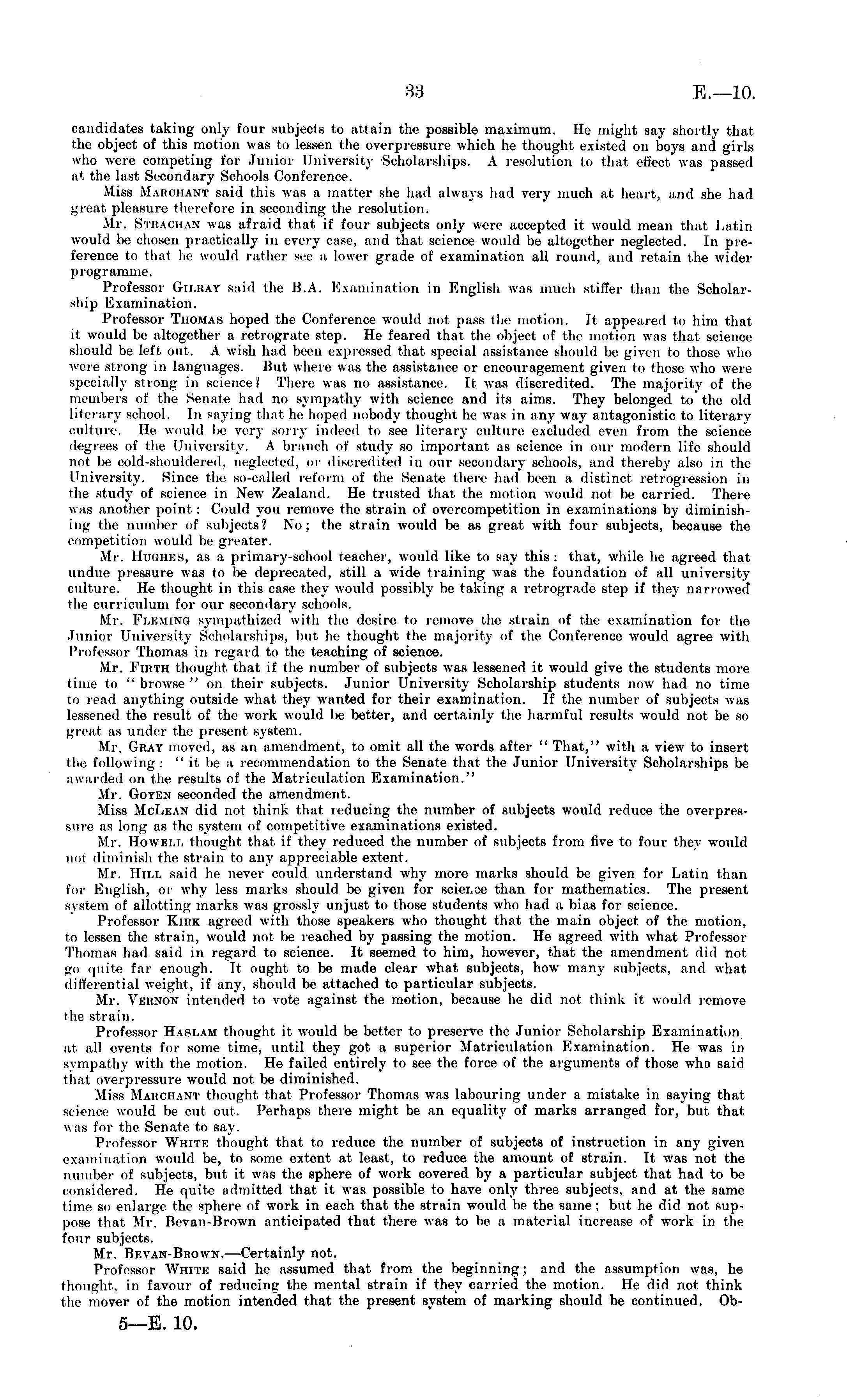 candidates taking only four subjects to attain the possible maximum. He might say shortly that the object of this motion was to lessen the overpressure which he thought existed on boys and girls who were competing for Junior University Scholarships. A resolution to that effect was passed at the last Secondary Schools Conference. Miss Makchant said this was a matter she had always had very much at heart, and she had great pleasure therefore in seconding the resolution. Mr. Straohan was afraid that if four subjects only were accepted it would mean that Jiatin would be chosen practically in every case, and that science would be altogether neglected. In preference to that he would rather see a lower grade of examination all round, and retain the wider programme. Professor Gileat said the J3.A. Examination in English was much stiffer than the Scholarship Examination. Professor Thomas hoped the Conference would not pass the motion. It appeared to him that it would be altogether a retrograte step. He feared that the object of the motion was that science should be left out. A wish had been expressed that special assistance should be given to those who were strong in languages. But where was the assistance or encouragement given to those who were specially strong in science? There was no assistance. It was discredited. The majority of the members of the Senate had no sympathy with science and its aims. They belonged to the old literary school. In saying that he hoped nobody thought he was in any way antagonistic to literary culture. He would l>e very sorry indeed to see literary culture excluded even from the science degrees of the University. A branch of study so important as science in our modern life should not be cold-shouldered, neglected, or discredited in our secondary schools, and thereby also in the University. Since the so-called reform of the Senate there had been a distinct retrogression in the study of science in New Zealand. He trusted thai the motion would not be carried. There was another point : Could you remove I h< , strain of overeompetition in examinations by diminishing the number of subjects? No; the strain would be as great with four subjects, because the competition would be greater. Mr. Hughes, as a primary-school teacher, would like to say this : that, while he agreed that undue pressure was to be deprecated, still a wide training was the foundation of all university culture. He thought in this case they would possibly be taking a retrograde step if they narrowed the curriculum for our secondary schools. Mr. Fleming sympathized with the desire to remove the strain of the examination for the Junior University Scholarships, but he thought the majority of the Conference would agree with Professor Thomas in regard to the teaching of science. Mr. Fihth thought that if the number of subjects was lessened it would give the students more time to "browse" on their subjects. Junior University Scholarship students now had no time to read anything outside what they wanted for their examination. If the number of subjects was lessened the result of the work would lie better, and certainly the harmful results would not be so greal as under the present system. Mr. Gray moved, as an amendment, to omit all the words after " That," with a view to insert the following : "it be a recommendation to the Senate that the Junior University Scholarships be awarded on the results of the Matriculation Examination." Mr. Goten seconded the amendment. Miss McLean did not think that reducing the number of subjects would reduce the overpressure as long as the system of competitive examinations existed. Mr. Howell thought that if they reduced the number of subjects from five to four they would not diminish the strain to any appreciable extent. Mr. Hill said he never could understand why more marks should be given for Latin than fur English) or why less marks should be given for sciei.ce than for mathematics. The present sysiein of allotting marks was grossly unjust to those students who had a bias for science. Professor Kikk agreed with those speakers who thought that the main object of the motion, to lessen the strain, would not be reached by passing the motion. He agreed with what Professor Thomas had said in regard to science. It seemed to him, however, that the amendment did not go quite far enough. It ought to be made clear what subjects, how many subjects, and what differential weight, if any, should be attached to particular subjects. Mr. Vehnon intended to vote against the motion, because lie did not think it would remove the strain. Professor Haslam thought it would be better to preserve the Junior Scholarship Examination at all events for some time, until they got a superior Matrictilation Examination. He was in sympathy with the motion. He failed entirely to see the force of the arguments of those who sairi that overpressure would not be diminished. Miss Marchant thought that Professor Thomas was labouring under a mistake in saying that science would be cut out. Perhaps there might be an equality of marks arranged for, but that was for the Senate to say. Professor White thought that to reduce the number of subjects of instruction in any given examination would be, to some extent at least, to reduce the amount of strain. It was not the number of subjects, but it was the sphere of work covered by a particular subject that had to be considered. He quite admitted that it was possible to have only three subjects, and at the same time so enlarge the sphere of work in each that the strain would be the same; but he did not suppose that Mr. Bevan-Brown anticipated that there was to be a material increase of work in the four subjects. Mr. Bevan-Brown. —Certainly not. Professor White said he assumed that from the beginning; and the assumption w r as, he thought, in favour of reducing the mental strain if they carried the motion. He did not think the mover of the motion intended that the present system 