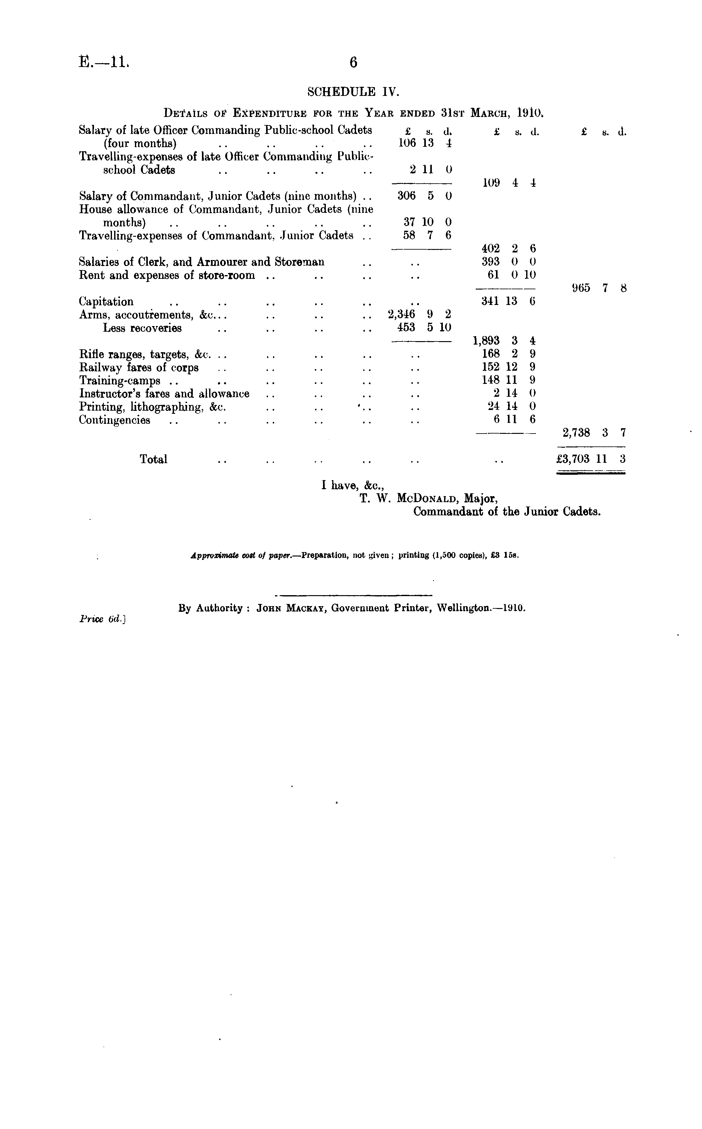 SCHEDULE IV. DkTAILK 01 KiXPENDITURE FOR THE YEAR ENDED 31ST MARCH, 1910. Salary of late Officer Commanding Public-school Cadets £ s . d. £ b. d. £ c. d. (four months) .. . . .. .. 106 13 4 Travelling-expenses of late Officer Commanding Publicmcliool Cadets .. .. .. .. 2 11 0 101) 4 4 Salary of Commandant, Junior Cadets (nine months) .. 306 5 0 House allowance of Commandant, Junior Cadets (nine months) .. .. .. .. .. 37 10 0 Travelling-expenses of Commandant. Junior Cadets .. 58 7 6 402 2 6 Salaries of Clerk, and Armourer and Storeman .. .. 393 0 () Rent and expenses of store-room .. .. .. .. 61 0 l<) 965 7 8 Capitation .. .. .. .. .. .. 341 13 6 Arms, accoutrements, &c. .. .. .. .. 2,346 i> 2 Less recoveries .. .. .. .. 453 5 l<) 1,893 3 4 Rirle ranges, targets, tec. .. .. .. .. .. 168 2 9 Railway fares of corps .. .. .. .. .. 152 12 9 Training-camps .. .. .. .. .. .. L4B 11 9 Instructor's fares and allowance .. .. .. .. 214 0 Printing, lithographing, &c. .. .. '.. .. 24 14 0 Contingencies .. .. .. .. .. .. 6116 2,738 3 7 Total .. .. . . .. .. .. £3,703 11 3 1 have, &c, T. W. M( Donald, Major, Commandant of the Junior Cadets.