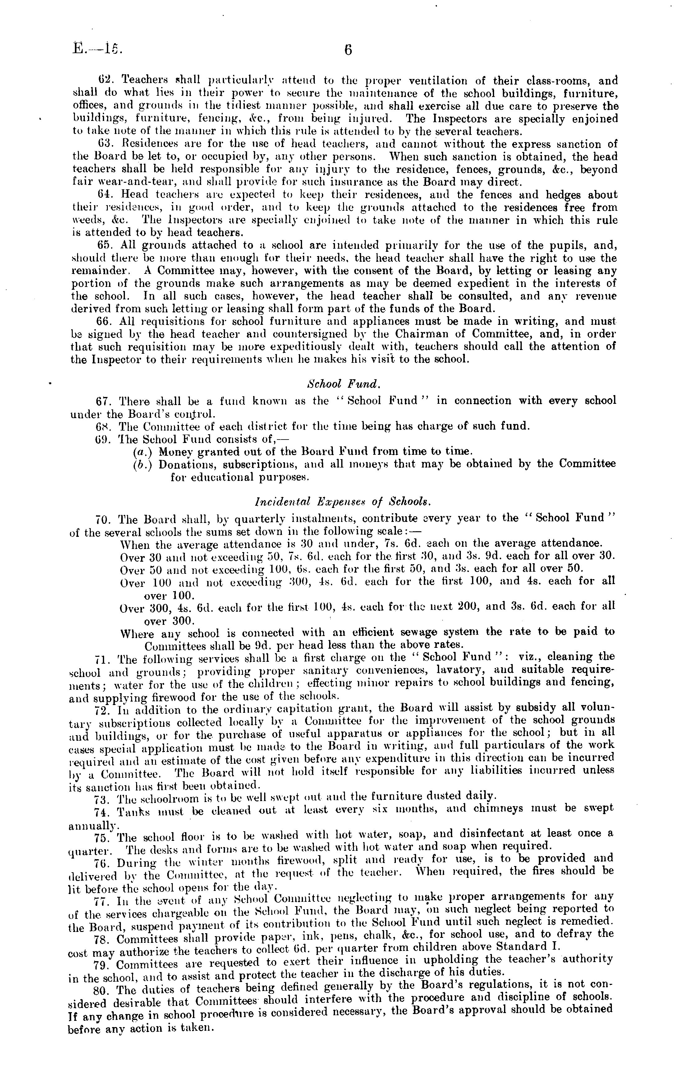 GJ. Teachers shall particularly attend to the proper ventilation of their class-rooms, and shall do what lies in their power to secure the maintenance of the school buildings, furniture, offices, and grounds in the tidiest manner possible, and shall exercise all due care to preserve the buildings, furniture, fencing, Ac, from being injured. The Inspectors are specially enjoined to take note of the manner in which this rule is attended to by the several teachers. 63. Residences are for the use of head teachers, and cannot without the express sanction of the Board bs let to, or occupied by, any other persons. When such sanction is obtained, the head teachers shall be held responsible for any injury to the residence, fences, grounds, &c, beyond fair wear-and-tear, and shall provide for such insurance as the Board may direct. (i 1. Head teachers are expected to keep their residences, and the fences and hedges about their residences, in good order, and to keep the grounds attached to the residences free from weeds, iVc. The Inspectors are specially enjoined to take note of the manner in which this rule is attended to by head teachers. 65. All grounds attached to a school are intended primarily for the use of the pupils, and, should there be more than enough for their needs, the head teacher shall have the right to use the remainder. A Committee may, however, with the consent of the Board, by letting or leasing any portion of the grounds make such arrangements as may be deemed expedient in the interests of the school. In all such cases, however, the head teacher shall be consulted, and any revenue derived from such letting or leasing shall form part of the funds of the Board. 66. All requisitions for school furniture and appliances must be made in writing, and must be signed by the head teacher and countersigned by the Chairman of Committee, and, in order that such requisition may be more expeditiously dealt with, teachers should call the attention of the Inspector to their requirements when he makes his visit to the school. School Fund. 67. There shall be a fund known as the " School Fund " in connection with every school under the Board's conjtrol. 68. The Committee of each district for the time being has charge of such fund. 69. 'I he School Fund consists of, — (a.) Money granted out of the Board Fund from time to time. (//.) Donations, subscriptions, and all moneys that may be obtained by the Committee for educational purposes. Incidental Expentet of Schools. 70. The Board shall, by quarterly instalments, contribute every year to the "School Fund" of the several schools the sums set down in the following scale: — When the average attendance is 30 and under, 7s. (id. eaoh on the average attendance. Over 30 and not exceeding 50, 7s. Gd. each for the first 30, and -'is. 9d. each for all over 30. Over 50 and not exceeding 100, Gs. each for the first 50, and -'is. each for all over 50. Over 100 and not exceeding 300, Is. Gd. each for the first 100, and 4s. each for all over 100. Over -'500, 4s. Gd. each for the hist I DO, Is. each for the next 200, and 3s. Gd. each for all over 300. Where any school is connected with an efficient sewage system the rate to be paid to Committees shall be 9d. per head less than the above rates. 71. The following services shall be a first charge on the "School Fund": viz., cleaning the school and grounds; providing propel- sanitary conveniences, lavatory, and suitable requirements; water for the use of the children : effecting minor repairs to school buildings and fencing, and supplying firewood for the use of the schools. 72. iii addition to tl rdinar) capitation grant, the Board will assist by subsidy all voluntary subscriptions collected locally by a Committee for the improvement of the school grounds and buildings, or for the purchase of useful apparatus or appliances for the school; but in all cases special application must lie made to the Hoard in writing, and full particulars of the work required and an estimate of the cost given before any expenditure in this direction can be incurred by a Committee. The Hoard will not hold itself responsible for any liabilities incurred unless its sanction has first been obtained. 73. The schoolroom is to be well swept out and the furniture dusted daily. 74. Tanks must be cleaned out at least every six months, and chimneys must be swept annually. , ~ . . . 7.")' The school floor is to be washed with hot water, soap, and disinfectant at least once a quarter The desks and forms are to be washed with hot water and soap when required. ' 76. During the winter months tirew 1, split and ready for use, is to be provided and delivered by the Committee, at the request of the teacher. When required, the fires should be lit before the school opens foi the day. _ 77 In the event of any School Committee neglecting to make proper arrangements for any o f the semoes chargeable on the School Fund, the Board may, on such neglect being reported to the Board suspend payment of its contribution to the School Fund until such neglect is remedied. y< Committees shall provide paper, ink, pens, chalk, <Src, for school use, and to defray the cost may author,/,- the teachers to collect (id. per quarter from children above Standard I. 79" Committees are requested to exert their influence in upholding the teachers authority in the school, and t<, assist and protect the teacher in the discharge of his duties 80 The duties of teachers being defined generally by the Boards regulations it is not considered desirable that Committees should interfere with the procedure and discipline of schools. If any change in school procedure is considered necessary, the Board s approval should be obtained before any action is taken.