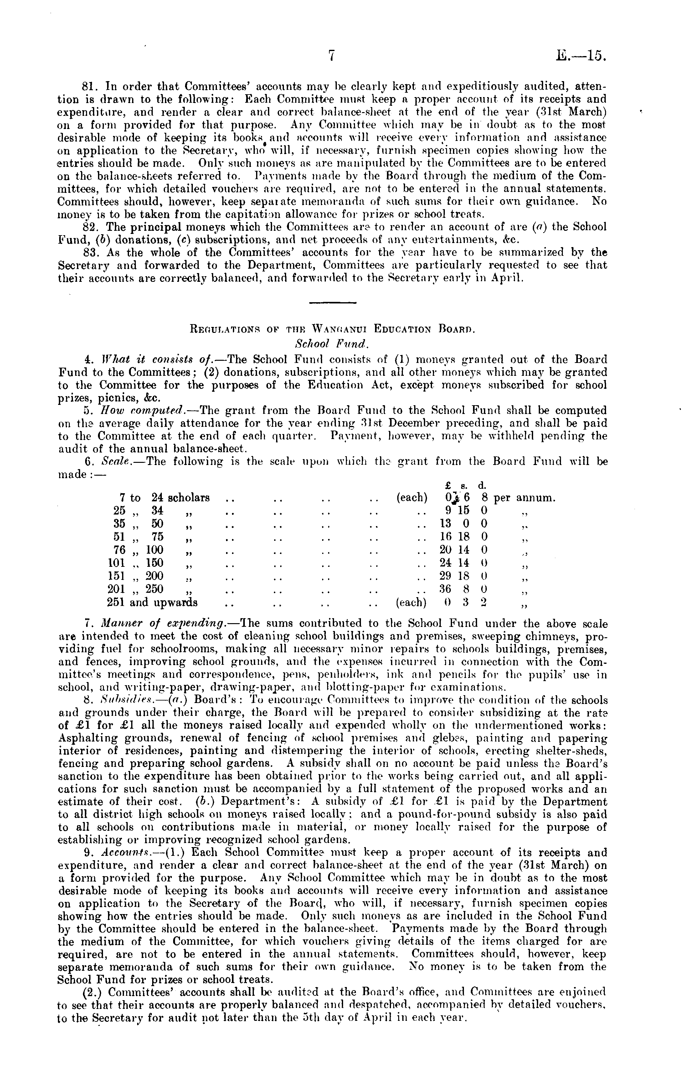 81. In order that Committees' accounts may be dearly kept and expeditiously audited, attention is drawn to the following: Each Committee must keep a proper account of its receipts and expenditure, and render a clear and oorrect balance-sheet a( the end of the year (31st March) on a form provided for that purpose. Any Committee which may be in doubt as to the most desirable mode of keeping its books and accounts will receive every information and assistance on application to the Secretary, who will, ii' necessary, furnish specimen copies showing how the entries should be made. Only such moneys as arc manipulated by the Committees are to be entered ud the balance-sheets referred to. Payments made by the Board through the medium of the Committees, for which detailed vouchers are required, are not to be entered in the annual statements. Committees should, however, keep separate memoranda of such sums for their own guidance. No money is to be taken from the capitation allowance for prizes or school treats. 82. The principal moneys which the Committees are to render an account of are (a) the School Fund, (b) donations, (c) subscriptions, and net proceeds of any entertainments, <kc. 83. As the whole of the Committees' accounts for the year have to be summarized by the Secretary and forwarded to the Department, Committees are particularly requested to see that their accounts are correctly balanced, and forwarded to the Secretary early in April. Regulations of the Wanganui Education Hoard. School Fund. 4. What it consists of. —The School Fund consists of (1) moneys granted out of the Board Fund to the Committees; (2) donations, subscriptions, and all other moneys which may be granted to the Committee for the purposes of the Education Act, except moneys subscribed for school prizes, picnics, &c. '). How computed. — The grant from the Hoard Fund to the School Fund shall l)e computed on tho average daily attendance for the year ending -'Slst December preceding, and shall lie paid to the Committee at the end of eacli quarter. Payment, however, may be withheld pending the audit of the annual balance-sheet. 6. Scale,. —The following is the scale upon which the grant from the Board Fund will be made :— £ s. d. 7to 24 scholars .. .. .. .. (each) Oj 6 8 per annum. 25 „ 34 .. .. .. .. .. 915 0 35 „ 50 13 0 0 51 ~75 16 18 0 76 „ 100 20 14 0 101 ~ 150 .. .. .. .. .. 24 14 0 151 „ 200 .. .. .. .. .. 29 IS 0 201 „ 250 „ .. .. .. .. .. .% 8 o 251 and upwards .. .. . . .. (each) I) .'? 2 ~ 7. Manner of expending. —The sums contributed to the School Fund under the above scale are intended to meet the cost of cleaning school buildings and premises, sweeping chimneys, providing fuel for schoolrooms, making all necessary minor repairs to schools buildings, premises, and fences, improving school grounds, and the expenses incurred in connection with the Committee's meetings and correspondence, pens, penholders, ink and pencils for the pupils' use in school, and writing-paper, drawing-paper, and blotting-paper for examinations. 8. Subsidies. —(«.) Board's : To encourage Committees to improve tin , condition of the schools and grounds under their charge, the Hoard will be prepared to consider subsidizing at the rat? of £1 for £1 all the moneys raised locally and expended wholly on the undermentioned works: Asphalting mounds, renewal of fencing of school premises ami glebes, painting and papering interior of residences, painting and distempering the interior of schools, erecting shelter-sheds, fencing and preparing school gardens. A subsidy shall on no account be paid unless the Board's sanction to the expenditure lias been obtained prior to the works being carried out, and all applications for such sanction must be accompanied by a full statement of the proposed works and an estimate of their cost, (b.) Department's: A subsidy of £1 for £1 is paid by the Department to all district high schools on moneys raised locally; and a pound-for-pound subsidy is also paid to all schools on contributions made in material, or money locally raised for the purpose of establishing or improving recognized school gardens. 9. Accounts. —(1.) Each School Committee must keep a proper account of its receipts and expenditure, and render a clear and correct balance-sheet at the end of the year (31st March) on a form provided for the purpose. Any School Committee which may be in doubt as to the most desirable mode of keeping its books and accounts will receive every information and assistance on application to the Secretary of the Hoard, who will, if necessary, furnish specimen copies showing how the entries should be made. Only such moneys as are included in the School Fund by the Committee should lx , entered in the balance-sheet. Payments made by the Board through the medium of the Committee, for which vouchers giving details of the items charged for are required, are not to be entered in the annual statements. Committees should, however, keep separate memoranda of such sums for their own guidance. No money is to be taken from the School Fund for prizes or school treats. (2.) Committees' accounts shall lie audited at the Board's office, ami Committees are enjoined to see that their accounts are properly balanced and despatched, accompanied by detailed vouchers, to the Secretary for audit not later than the ">th day of April in each year.