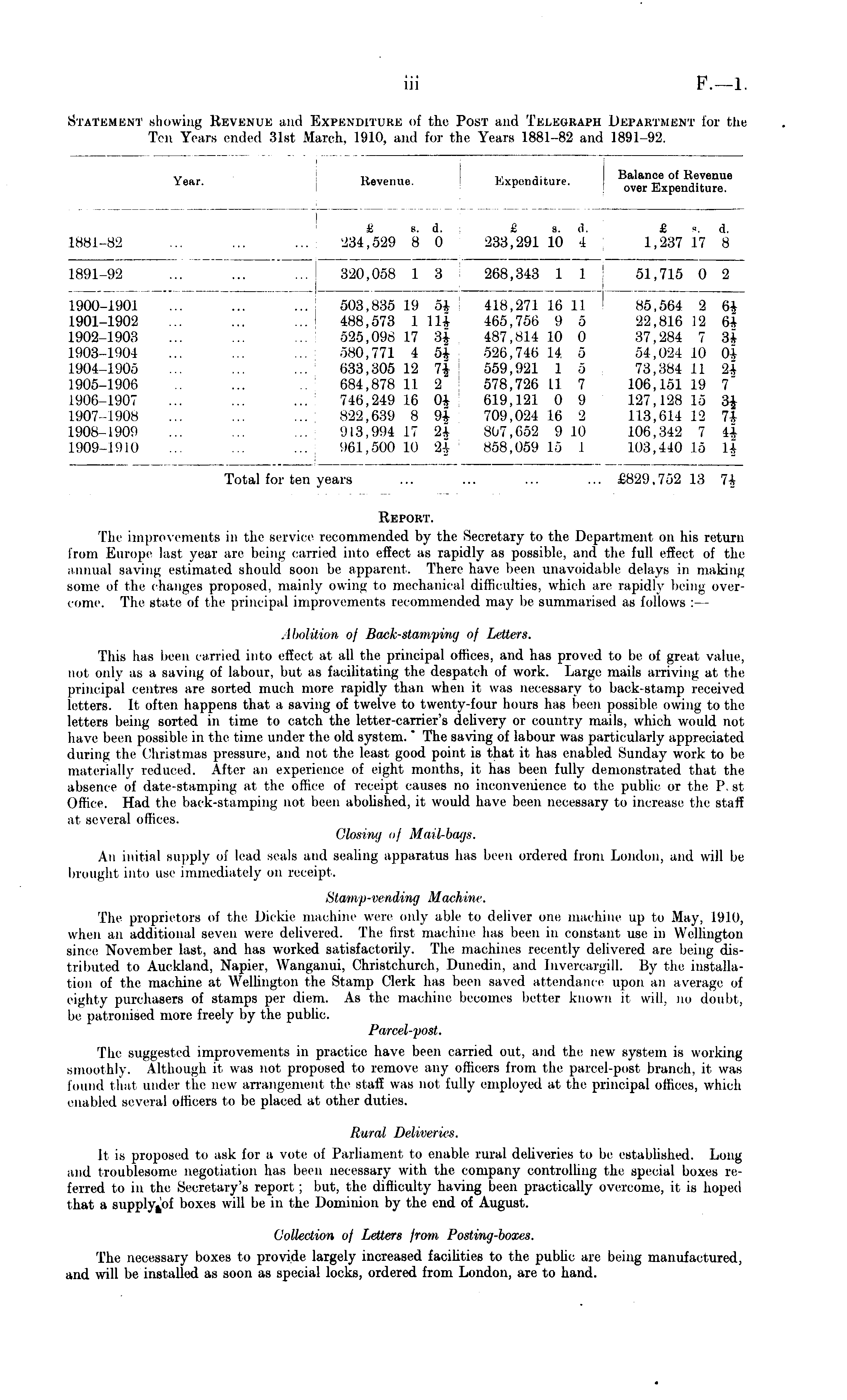 Statement showing Revenue and Expenditure of the Post and Telegraph Department for the Ten Years ended 31st March, 1910, and for the Years 1881-82 and 1891-92.
