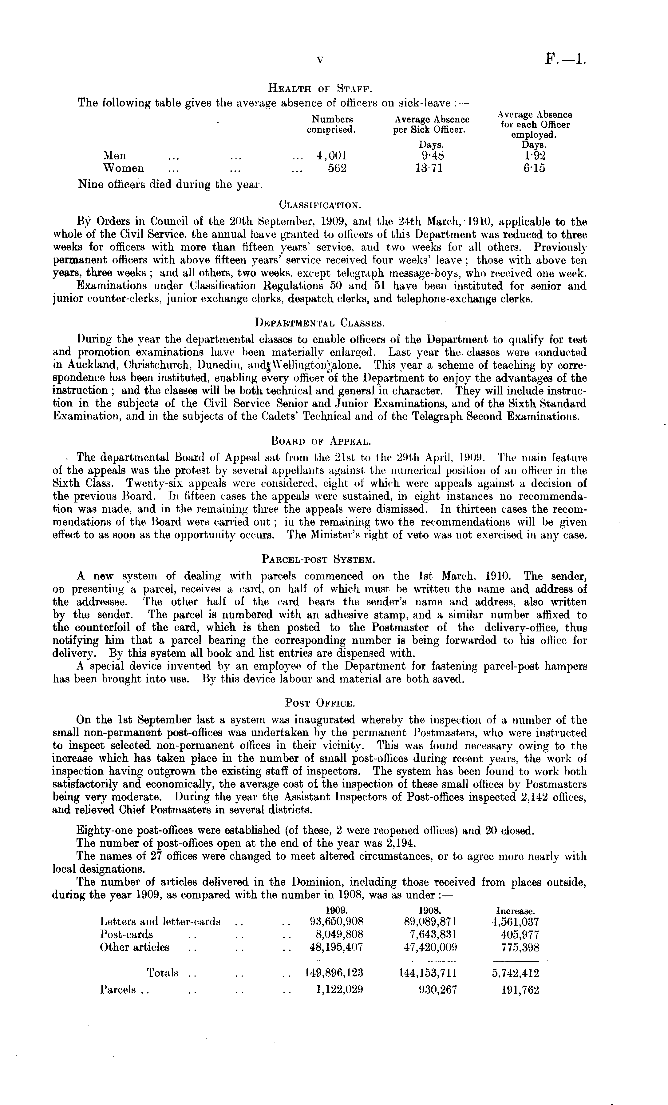 Health of Staff. The following table gives the average absence of officers on sick-leave : — Numbers Average Absence comprised. per Sick Officer. em lo ed Days. Days. Men ... ... ... 4,001 9-48 192 Women ... ... ... 562 13 71 6-15 Nine officers died during the year. Classification. By Orders in Council of the 20th September, 1909, and the 24th March, 1910, applicable to the whole of the Civil Service, the annual leave granted to officers of this Department was reduced to three weeks for officers with more than fifteen years' service, and two weeks for all others. Previously permanent officers with above fifteen years' service received four weeks' leave ; those with above ten years, three weeks ; and all others, two weeks, except telegraph message-boys, who received one week. Examinations under Classification Regulations 50 and 51 have been instituted for senior and junior counter-clerks, junior exchange clerks, despatch clerks, and telephone-exchange clerks. Departmental Classes. During the year the departmental classes to enable officers of the Department to qualify for test and promotion examinations have been materially enlarged. Last year the. classes were conducted in Auckland, Christchurch, Dunedin, This year a scheme of teaching by correspondence has been instituted, enabling every officer of the Department to enjoy the advantages of the instruction ; and the classes will be both technical and general in character. They will include instruc tion in the subjects of the Civil Service Senior and Junior Examinations, and of the Sixth Standard Examination, and in the subjects of the Cadets' Technical and of the Telegraph Second Examinations. Board op Appeal. The departmental Board of Appeal sat from the 21st to the 29th April. 1909. The main feature of the appeals was the protest by several appellants against the numerical position of an officer in the Sixth Class. Twenty-six appeals were considered, eight pj which were appeals against a decision of the previous Board. In fifteen cases the appeals were sustained, in eight instances no recommendation was made, and in the remaining three the appeals were dismissed. In thirteen cases the recommendations of the Hoard were carried oul : in the remaining two the recommendations will be given effect to as soon as the opportunity occurs. The Minister's right of veto was not exercised in any case. Parcel-post System. A new system of dealing with parcels commenced on the Ist March, 1910. The sender, on presenting a parcel, receives a card, on half of which must be written the name and address of the addressee. The other half of the card bears the sender's name and address, also written by the sender. The parcel is numbered with an adhesive stamp, and a similar number affixed to the counterfoil of the card, which is then posted to the Postmaster of the delivery-office, thus notifying him that a parcel bearing the corresponding number is being forwarded to his office for delivery. By this system all book and list entries are dispensed with. A special device invented by an employee of the Department for fastening parcel-post hampers has been brought into use. By this device labour and material are both saved. Post Office. On the Ist September last a system was inaugurated whereby the inspection of a number of the small non-permanent post-offices was undertaken by the permanent Postmasters, who were instructed to inspect selected non-permanent offices in their vicinity. This was found necessary owing to the increase which has taken place in the number of small post-offices during recent years, the work of inspection having outgrown the existing staff of inspectors. The system has been found to work both satisfactorily and economically, the average cost of the inspection of these small offices by Postmasters being very moderate. During the year the Assistant Inspectors of Post-offices inspected 2,142 offices, and relieved Chief Postmasters in several districts. Eighty-one post-offices were established (of these, 2 were reopened offices) and 20 closed. The number of post-offices open at the end of the year was 2,194. The names of 27 offices were changed to meet altered circumstances, or to agree more nearly with local designations. The number of articles delivered in the Dominion, including those received from places outside, during the year 1909, as compared with the number in 1908, was as under : — 1909. 1908. Increase. Letters and letter-cards .. .. 93,650,908 89,089,871 1.561.037 Post-cards .. .. .. 8,049,808 7,643,831 405,977 Other articles .. .. .. 48,195,407 47,420,009 775,398 Totals .. .. 149,896,123 144,153,711 5,742,412 Parcels.. .. .. 1,122,029 930,267 191,762