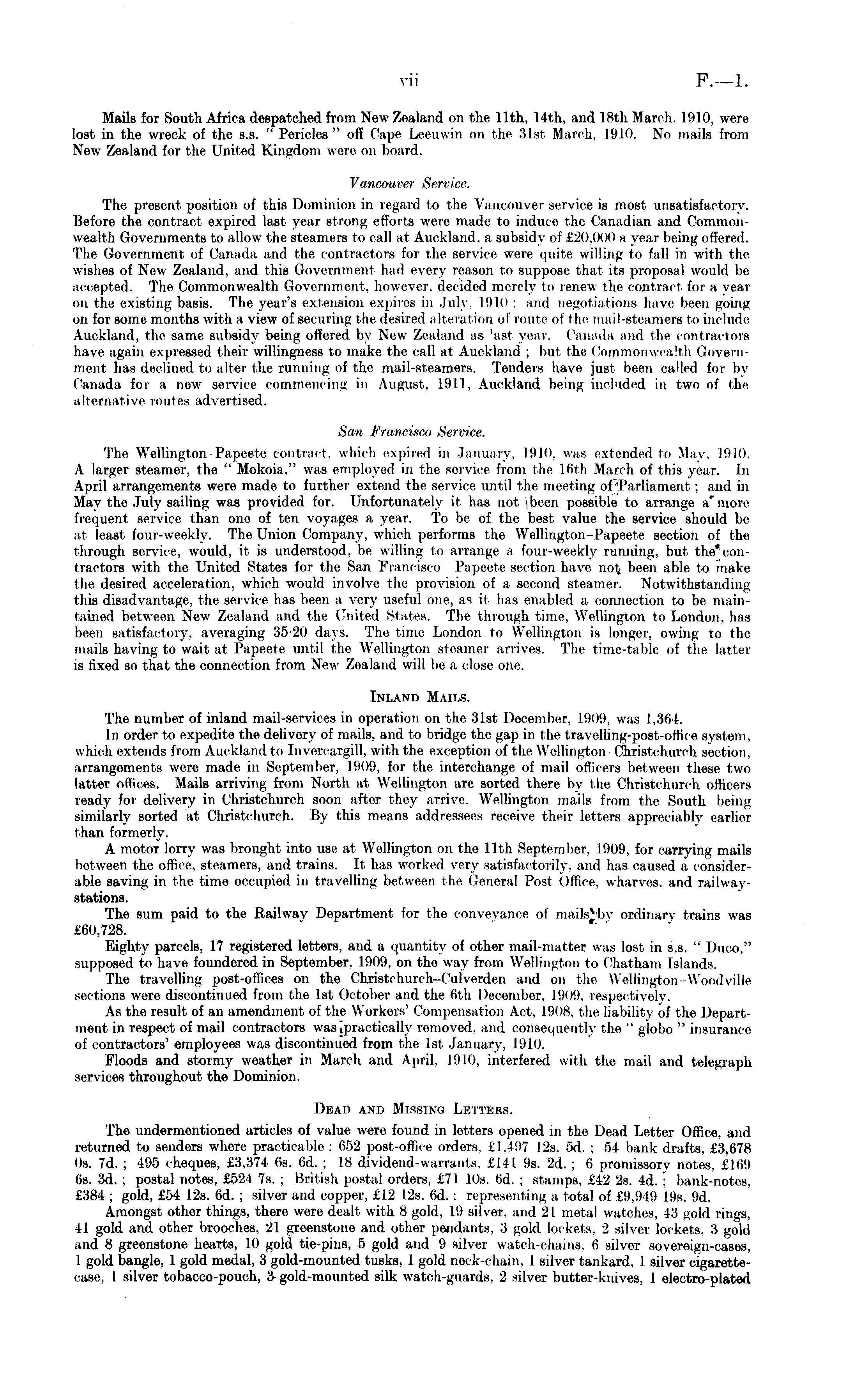 Mails for South Africa despatched from New Zealand on the 11th, 14th, and 18th March. 1910. were lost in the wreck of the s.s. "Pericles" off Cape. Leeuwin on the 31si March, 1910. No mails from New Zealand for the United Kingdom were on board. Vancouver Service. The present position of this Dominion in regard to the Vancouver service is most unsatisfactory. Before the contract expired last year strong efforts were made to induce the Canadian and Common wealth Governments to allow the steamers to call at Auckland, a subsidy of £20,000 a year being offered. The Government of Canada and the contractors for the service were quite willing to fall in with the wishes of New Zealand, and this Government had every reason to suppose that its proposal would be accepted. The Commonwealth Government, however, decided merely to renew the contract for a year on the existing basis. The year's extension expires in July. 1910 : and negotiations have been going on for some months with a view of securing the desired altera! ton of route of the mail-steamers to include Auckland, the same subsidy being offered by New Zealand as 'ast year. Canada and the contractors have again expressed their willingness to make the call at Auckland : but the Commonwealth Government has declined to alter the running of the mail-steamers. Tenders have just been called for by Canada for a new service commencing in August. 1911, Auckland being included in two of the alternative routes advertised. San Francisco Service. The Wellington Papeete contract, which expired in January, 1910, was extended to Maw 1910. A larger steamer, the " Mokoia." was employed in the service from the 16th March of this year. In April arrangements were made to further extend the service until the meeting of Parliament : and in May the July sailing was provided for. Unfortunately it has not jbeen possible to arrange a'more frequent service than one of ten voyages a year. To be of the best value the service should be at least four-weekly. The Union Company, which performs the Wellington Papeete section of the through service, would, it is understood, be willing to arrange a four-weekly running, but the'coiitractors with the United States for the San Francisco Papeete section have not; been able to make the desired acceleration, which would involve the provision of a second steamer. Notwithstanding this disadvantage, the service has been a very useful one, as it has enabled a connection to be maintained between New Zealand and the United States. The through time, Wellington to London, has been satisfactory, averaging 35-20 days. The time London to Wellington is longer, owing to the mails having to wait at Papeete until the Wellington steamer arrives. The timetable of the latter is fixed so that the connection from New Zealand will be a close one. Inland Mails. The number of inland mail-services in operation on the 31st December. 1909, was 1,364. In order to expedite the delivery of mails, and to bridge the gap in the travelling-post-office system, which extends from Auckland to [nvercargill, with the exception of the Wellington Christchurch section. arrangements were made in September. 1909. for the interchange of mail officers between these two latter offices. Mails arriving from North at Wellington are sorted there by the Christchurch officers ready for delivery in Christchurch soon after they arrive, Wellington mails from the South being similarly sorted at Christchurch. By this means addressees receive their letters appreciably earlier than formerly. A motor lorry was brought into use at Wellington on the 11th September. 1909, for carrying mails between the office, steamers, and trains. It has worked very satisfactorily, and has caused a considerable saving in the time occupied in travelling between the General Post Office, wharves, and railwaystations. The sum paid to the Raihvav Department for the conveyance of mails Miv ordinary trains was £60,728. Eighty parcels, 17 registered letters, and a quantity of other mail-matter was lost in s.s. " Duco," supposed to have foundered in September, 1909. on the way from Wellington to Chatham Islands. The travelling post-offices on the Christchurch-Culverden and on the Wellington Woodville sections were discontinued from the Ist October and the 6th December, 1909, respectively. As the result of an amendment of the Workers' Compensation Act. 1908, the liability of the Depart ment in respect of mail contractors was (practically removed, and consequently t be " globo " insurance of contractors' employees was discontinued from the Ist January, 1910. Floods and stormy weather in March and April. 1910. interfered with the mail and telegraph services throughout the Dominion. Dead and Missing Letters. The undermentioned articles of value were found in letters opened in the Dead Letter Office, and returned to senders where practicable : 652 post-office orders, £1.497 12s. sd. : 51 bank drafts. L3.(>78 os. 7d. ; 495 cheques, £3,374 6s. 6d. ; 18 dividend-warrants. £141 9s. 2d. : 6 promissory notes, £169 6s. 3d. ; postal notes, £524 7s. ; British postal orders, £71 10s. (id. : stamps. £42 2s. Id. : bank-notes. £384 ; gold, £54 12s. 6d. ; silver and copper, £12 12s. 6d. : representing a total of £9,949 19s. 9d. Amongst other things, there were dealt with 8 gold. 19 silver, and 21 metal watches. 43 gold rings, 41 gold and other brooches. 21 greenstone and other pendants, 3 gold lockets. 2 silver lockets. 3 gold and 8 greenstone hearts, 10 gold tie-pins, 5 gold and 9 silver watch-chains, (i silver sovereign-cases, 1 gold bangle, 1 gold medal, 3 gold-mounted tusks, 1 gold neck-chain, 1 silver tankard. 1 silver cigarettecase, 1 silver tobacco-pouch, 3 gold-mounted silk watch-guards. 2 silver butter-knives, 1 electro-plated