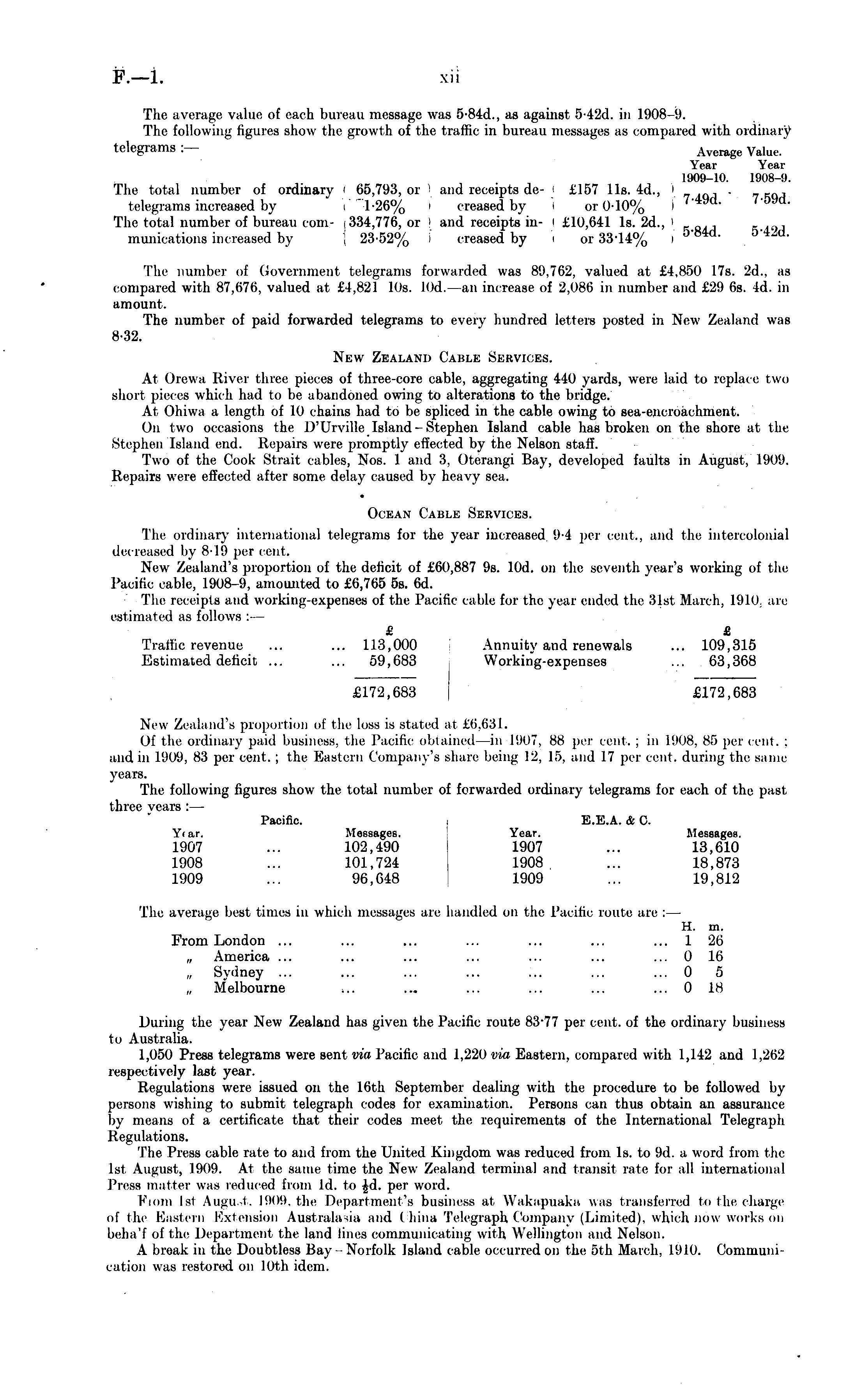 The average value of each bureau message was 5-84 d., as against 5-42 d. in 1908-9. The following figures show the growth of the traffic in bureau messages as compared with ordinary telegrams:— Average Value. Year Year 1909-10. 1908-9. The total number of ordinary ' 65,793, or I and receipts de- I £157 lis. 4d., i _. 01 - 7 k Q i telegrams increased by C "1-26% I creased by 1 or 0-10% I. 7 . d ' The total number of bureau com- i 334,776, or | and receipts in- j £10,641 Is. 2d., t _ , ejoi munieations increased by | 23-52% I creased by I or 33-14% I °' 84d ' . s ' 42d> The number of Government telegrams forwarded was 89.762, valued at £4,850 17s. 2d., as compared with 87,676, valued at £4,821 10s. lOd.—an increase of 2,086 in number and £29 6s. Id. in amount. The number of paid forwarded telegrams to every hundred letters posted in New Zealand was 8-32. Nkw Zealand Cable Services. At Orewa River three pieces of three-core cable, aggregating I 10 yards, wen- laid to replace two short pieces which had to be abandoned owing to alterations to the bridge. At Ohiwa a length of 10 chains had to be spliced in the cable owing to sea-encroachment. On two occasions the D'Urville Island -Stephen Island cable has broken on the shore at the Stephen Island end. Repairs were promptly effected by the Nelson staff. Two of the Cook Strait cables, Nos. 1 and 3. Oteraugi Bay, developed faults in August, 1909. Repairs were effected after some delay caused by heavy sea. Ocean Cable Services. The ordinary international telegrams for the year increased 9-4 per cent., and the intercolonial decreased by 8-19 per cent. New Zealand's proportion of the deficit of £60,887 9s. lOd. on the seventh year's working of the Pacific cable, 1908 9. amounted to £6,765 ss. 6d. The receipts and working-expenses of the Pacific cable for the year ended the -> Ist .March. 1910, are estimated as follows :— £ £ Traffic revenue ... ... 113,000 Annuity and renewals ... 109,315 Estimated deficit ... ... 59,683 Working-expenses ... 63,368 £172,683 £172,683 New Zealand's proportion of the loss is stated at £6.631. Of the ordinary paid business, the Pacific obtained in 1907. 88 per cent. ;in 1908. 85 per cent. : and in 1909, 83 per cent.; the Eastern Company's share being 12, 15, and 17 per cent, during the same years. The following figures show the total number of forwarded ordinary telegrams for each of the past three years :— Pacific. E.E.A. & C. Y<ar. Messages. Year. Messages. 1907 ... 102,490 1907 ... 13,610 1908 ... 101,724 1908 ... 18,873 1909 ... 96,048 1909 ... 19,812 The average best times in which messages are handled on the Pacific route are : — H. m. From London ... ... ... ... ... ... ... 1 26 „ America ... ... ... ... ... ... ... 0 16 „ Sydney ... ... ... ... ... ... ... 0 5 Melbourne ... ... ... ... ... ... 0 18 During the year New Zealand has given the Pacific route 83-77 per cent, of the ordinary business to Australia. 1,050 Press telegrams were sent via Pacific and 1,220 via Eastern, compared with 1,142 and 1.262 respectively last year. Regulations were issued on the 16th September dealing with the procedure to be followed by persons wishing to submit telegraph codes for examination. Persons can thus obtain an assurance by means of a certificate that their codes meet the requirements of the International Telegraph Regulations. The Press cable rate to and from the United Kingdom was reduced from Is. to 9d. a word from the Ist August, 1909. At the same time the New Zealand terminal and transit rate for all international Press matter was reduced from Id. to £d. per word. From Ist Align i. 1909, the Department's business at Wakapuaka was transferred to the charge of the Bastern Extension Australasia and China Telegraph Company (Limited), which now works on beha'f of the Department t he land lines communicating wit h Wellington and Nelson. A break in the Doubtless Hay Norfolk Island cable occurred on the sth March, 1910. Communication was restored on 10th idem.