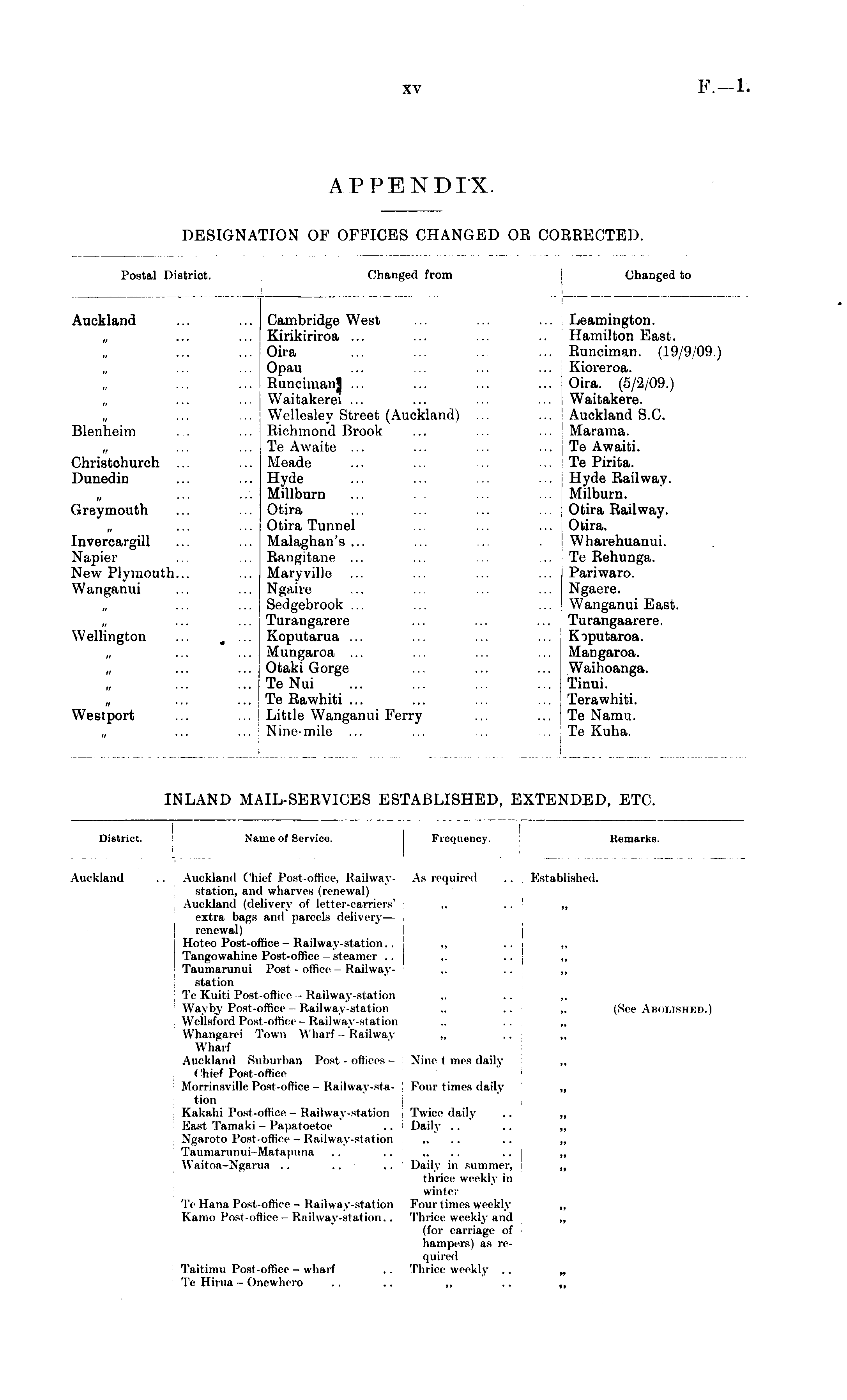 Postal District. Changed from Changed to Auckland „ ... „ ... a ... Blenheim Christehurch ... Dunedin Greymouth Invercargill Napier New Plymouth... Wanganui Cambridge West Kirikiriroa ... Oira Opau RuncimanJ ... Waitakerei ... Wellesley Street (Auckland) Richmond Brook Te Awaite ... Meade Hyde Millburn Otira Otira Tunnel Malaghan's ... Bangitann ... Maryville Ngaire Sedgebrook ... Turangarere Koputarua ... Mungaroa ... Otaki Gorge Te Nui Te Rawhiti ... Little Wanganui Ferry Nine-mile ... Leamington. Hamilton East. Runciman. (19/9/09.) Kioreroa. Oira. (5/2/09.) Waitakere. Auckland S.C. Marama. Te Awaiti. Te Pirita. Hyde Railway. Milburn. Otira Railway. Otira. Wharehuanui. Te Rehunga. Pariwaro. Ngaere. Wanganui East. Turangaarere. Kyputaroa. Mangaroa. Waihoanga. Tinui. Terawhiti. Te Namu. Te Kuha. Wellington ■ it a Westport