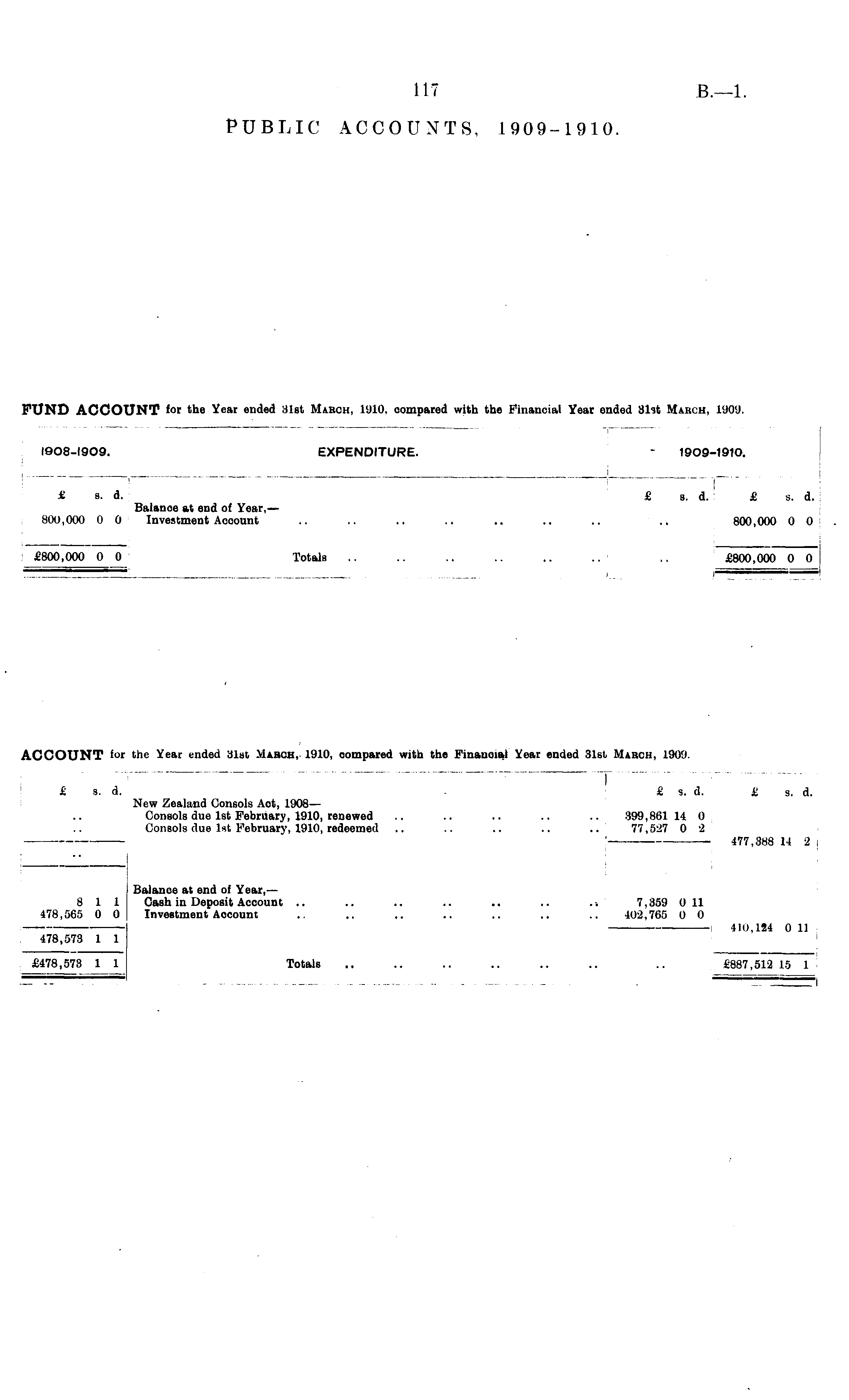 1908-1909. EXPENDITURE. - 19O9-1910. EXPENDITURE. : . l , _ £ s. d. £ s. d. £ s. d. Balanoe at end of Year, — 800,000 0 0 Investment Account .. .. .. .. .. .. .. .. 800,000 0 0 £800,000 0 0 Totals .. .. .. .. .. .. .. £800,000 0 0 £800,000 0 0 i ACCOUNT for the Year ended 31st March, 1910, compared with the Financial Year ended 31st March, 1909. I £ s. d. £ s. d. £ s. d. New Zealand Consols Aot, 1908 — Consols due 1st February, 1910, renewed .. .. .. .. .. 399,861 14 0 Consols due 1st February, 1910, redeemed .. .. .. .. .. 77,527 0 2 477,388 14 2 Balance at end of Year, — 8 11 Cash in Deposit Account .. .. .. .. .. .. .-. 7,359 0 11 478,565 0 0 Investment Account .. .. .. .. .. .. .. 402,765 0 0 410,124 0 11 478,573 1 1 £478,578 1 1 £478,578 1 1 Totals .. .. .. .. .. .. .. £887,512 15 1 £887,512 15 1 __.