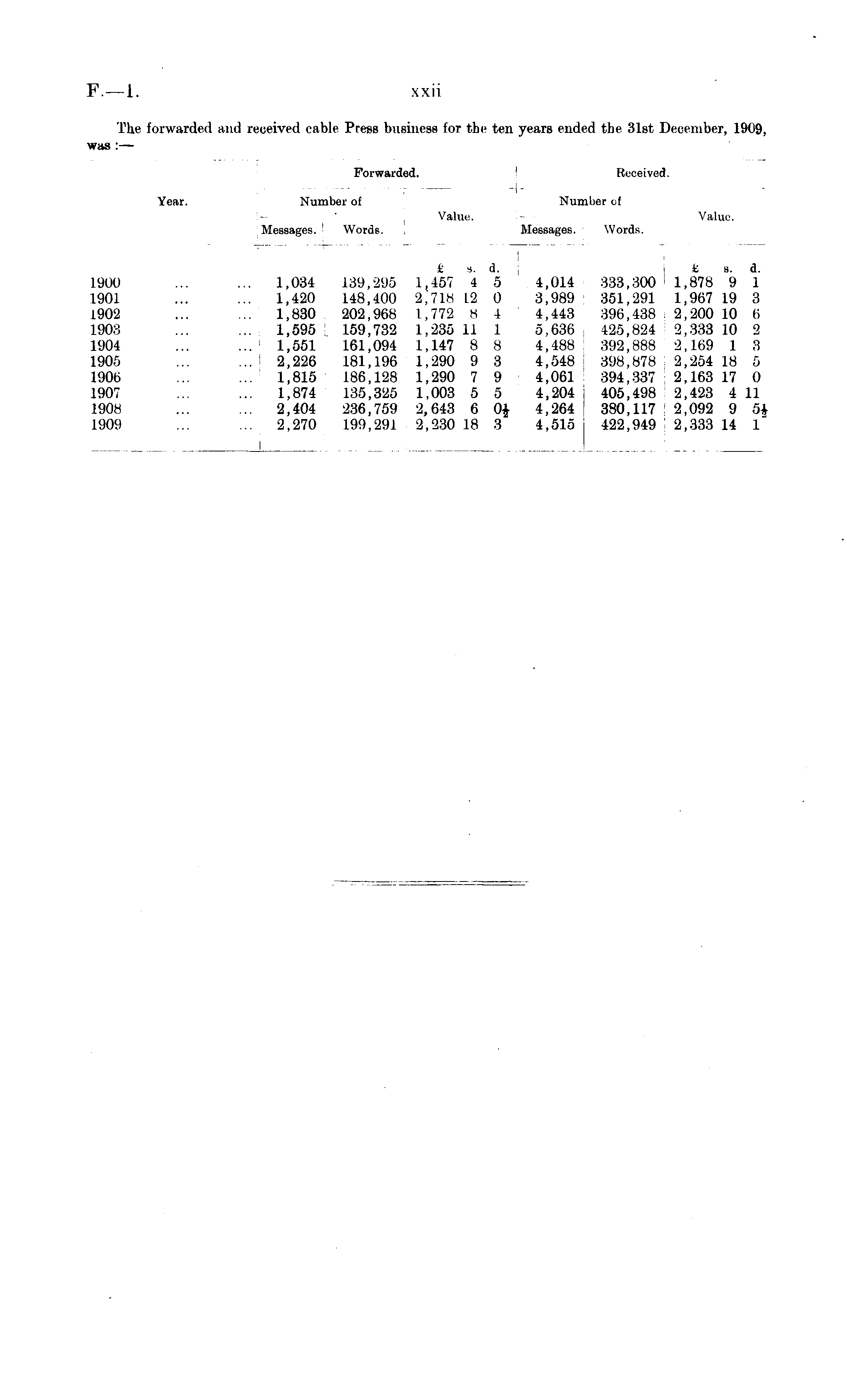 The forwarded and received cable Press business for the ten years ended the 31st December, 1909, was : —