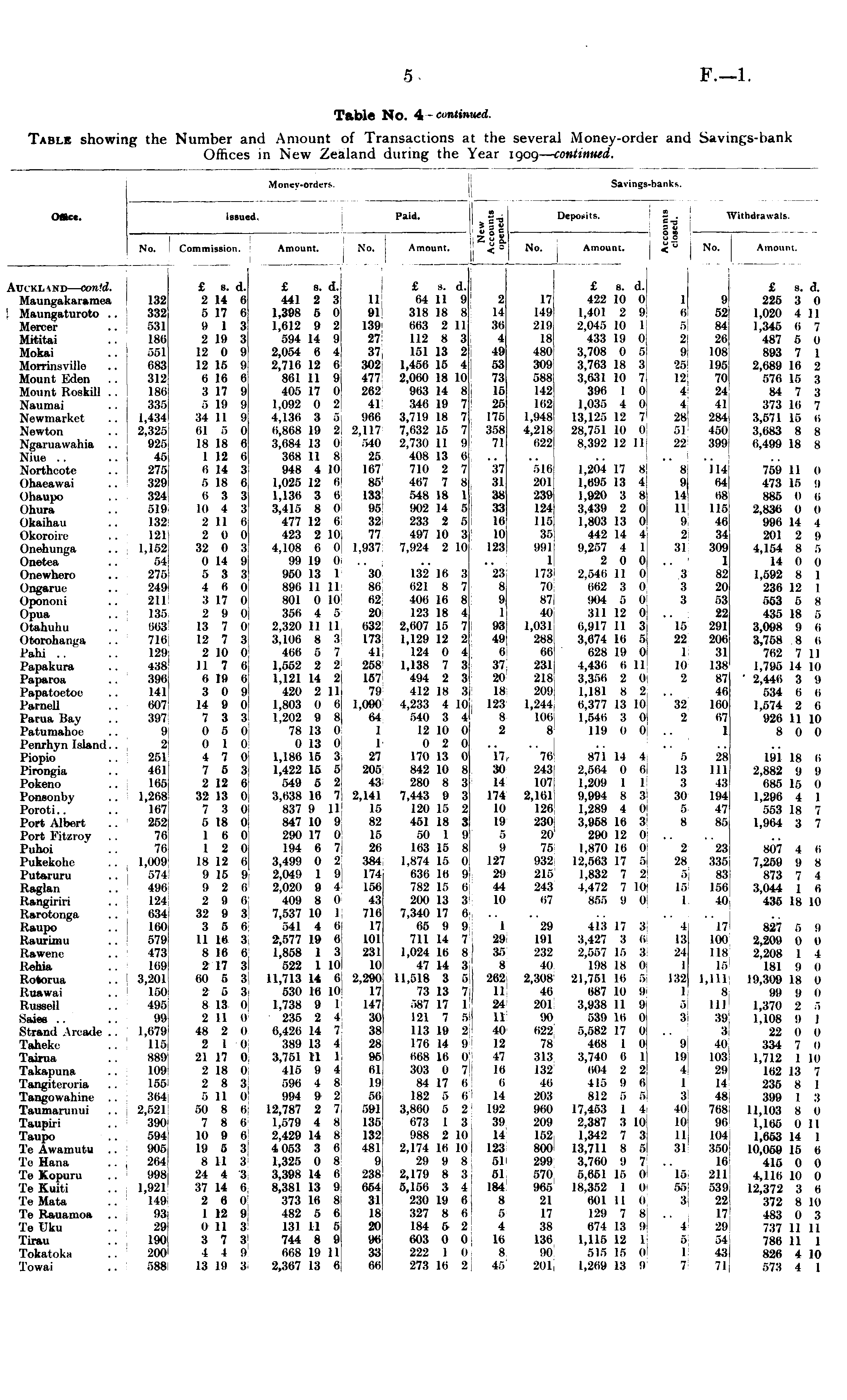 Table No. 4 - continued. Table showing the Number and Amount of Transactions at the several Money-order and Savings-bank Offices in New Zealand during the Year 1909 — continued.