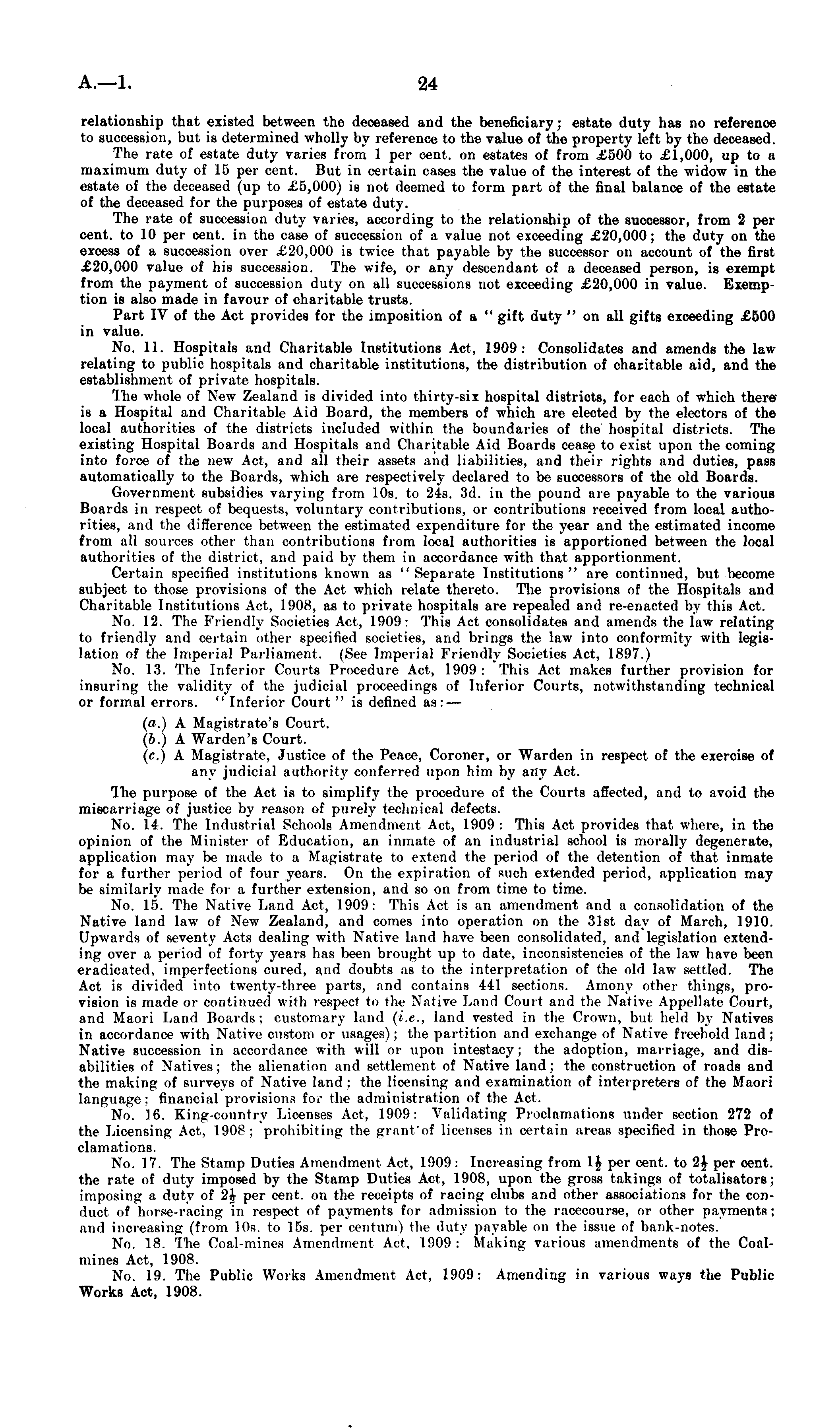relationship that existed between the deceased and the beneficiary; estate duty has no reference to succession, but is determined wholly by reference to the value of the property left by the deceased. The rate of estate duty varies from 1 per cent, on estates of from £500 to £1,000, up to a maximum duty of 15 per cent. But in certain cases the value of the interest of the widow in the estate of the deceased (up to £5,000) is not deemed to form part of the final balance of the estate of the deceased for the purposes of estate duty. The rate of succession duty varies, according to the relationship of the successor, from 2 per cent, to 10 per cent, in the case of succession of a value not exceeding £20,000; the duty on the excess of a succession over £20,000 is twice that payable by the successor on account of the first £20,000 value of his succession. The wife, or any descendant of a deceased person, is exempt from the payment of succession duty on all successions not exceeding £20,000 in value. Exemption is also made in favour of charitable trusts. Part IV of the Act provides for the imposition of a " gift duty " on all gifts exceeding £500 in value. No. 11. Hospitals and Charitable Institutions Act, 1909: Consolidates and amends the law relating to public hospitals and charitable institutions, the distribution of charitable aid, and the establishment of private hospitals. Ihe whole of New Zealand is divided into thirty-six hospital districts, for each of which there is a Hospital and Charitable Aid Board, the members of which are elected by the electors of the local authorities of the districts included within the boundaries of the hospital districts. The existing Hospital Boards and Hospitals and Charitable Aid Boards cease to exist upon the coming into force of the new Act, and all their assets and liabilities, and their rights and duties, pass automatically to the Boards, which are respectively declared to be successors of the old Boards. Government subsidies varying from 10s. to 245. 3d. in the pound are payable to the various Boards in respect of bequests, voluntary contributions, or contributions received from local authorities, and the difference between the estimated expenditure for the year and the estimated income from all sources other than contributions from local authorities is apportioned between the local authorities of the district, and paid by them in accordance with that apportionment. Certain specified institutions known as "Separate Institutions" are continued, but become subject to those provisions of the Act which relate thereto. The provisions of the Hospitals and Charitable Institutions Act, 1908, as to private hospitals are repealed and re-enacted by this Act. No. 12. The Friendly Societies Act, 1909: This Act consolidates and amends the law relating to friendly and certain other specified societies, and brings the law into conformity with legislation of the Imperial Parliament. (See Imperial Friendly Societies Act, 1897.) No. 13. The Inferior Courts Procedure Act, 1909 : This Act makes further provision for insuring the validity of the judicial proceedings of Inferior Courts, notwithstanding technical or formal errors. " Inferior Court "is defined as: — (a.) A Magistrate's Court. (6.) A Warden's Court. (c.) A Magistrate, Justice of the Peace, Coroner, or Warden in respect of the exercise of any judicial authority conferred upon him by any Act. Ihe purpose of the Act is to simplify the procedure of the Courts affected, and to avoid the miscarriage of justice by reason of purely technical defects. No. 14. The Industrial Schools Amendment Act, 1909 : This Act provides that where, in the opinion of the Minister of Education, an inmate of an industrial school is morally degenerate, application may be made to a Magistrate to extend the period of the detention of that inmate for a further period of four years. On the expiration of such extended period, application may be similarly made for a further extension, and so on from time to time. No. 15. The Native Land Act, 1909: This Act is an amendment and a consolidation of the Native land law of New Zealand, and comes into operation on the 31st day of March, 1910. Upwards of seventy Acts dealing with Native land have been consolidated, and legislation extending over a period of forty years has been brought up to date, inconsistencies of the law have been eradicated, imperfections cured, a.nd doubts as to the interpretation of the old law settled. The Act is divided into twenty-three parts, and contains 441 sections. Amony other things, provision is made or continued with respect to the Native Land Court and the Native Appellate Court, and Maori Land Boards ; customary land (i.e., land vested in the Crown, but held by Natives in accordance with Native custom or usages); the partition and exchange of Native freehold land ; Native succession in accordance with will or upon intestacy; the adoption, marriage, and disabilities of Natives ; the alienation and settlement of Native land; the construction of roads and the making of surveys of Native land ; the licensing and examination of interpreters of the Maori language; financial provisions for the administration of the Act. No. 16. King-country Licenses Act, 1909: Validating Proclamations under section 272 of the Licensing Act, 1908; prohibiting the grant'of licenses in certain areas specified in those Proclamations. No. 17. The Stamp Duties Amendment Act, 1909: Increasing from 1J per cent, to 2J per cent, the rate of duty imposed by the Stamp Duties Act, 1908, upon the gross takings of totalisators; imposing a duty of 2J per cent, on the receipts of racing clubs and other associations for the conduct of horse-racing in respect of payments for admission to the racecourse, or other payments ; and increasing (from 10s. to 15s. per centum) the duty payable on the issue of bank-notes. No. 18. The Coal-mines Amendment Act, 1909: Making various amendments of the Coalmines 