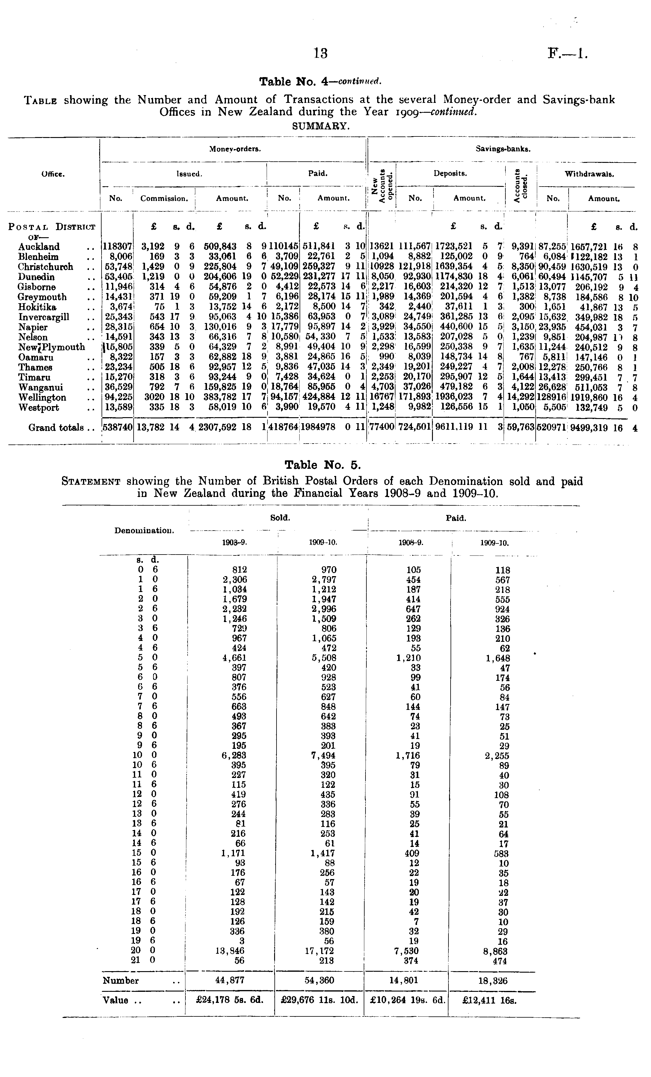 Table No. 4 —continued. Table showing the Number and Amount of Transactions at the several Money-order and Savings-bank Offices in New Zealand during the Year 1909 — continued. SUMMARY.