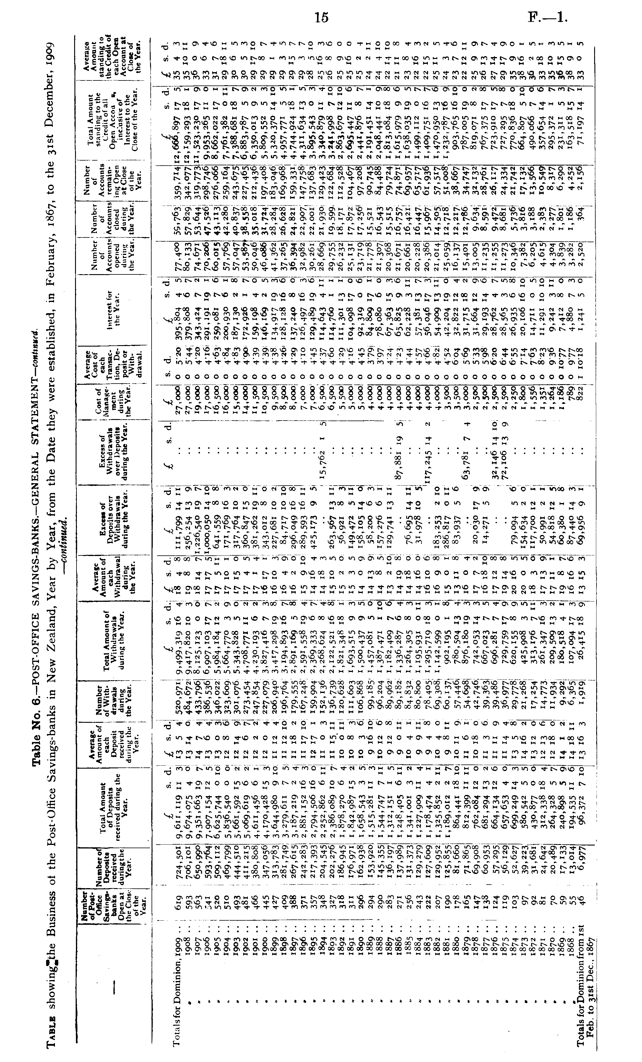 Table No. 6.— POST-OFFICE SAVINGS-BANKS.— GENERAL STATEMENT— continued. Table showing the Business of the Post-Office Savings-banks in New Zealand, Year by Year, from the Date they were established, in February, 1867, to the 31st December, 1909 — continued.