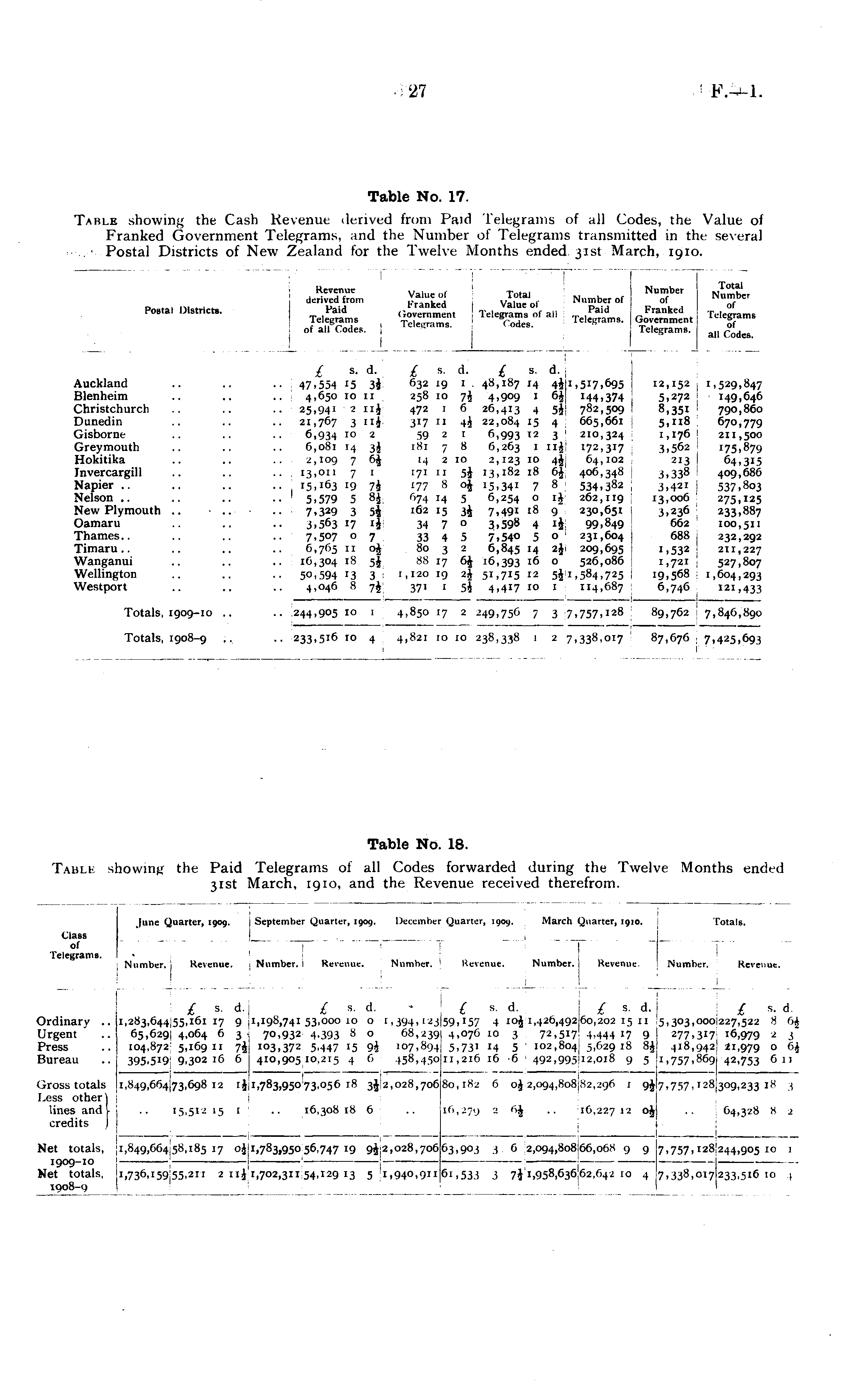 Table No. 17. Table showing the Cash Revenue derived from Paid Telegrams of all Codes, the Value of Franked Government Telegrams, and the Number of Telegrams transmitted in the several Postal Districts of New Zealand for the Twelve Months ended 31st March, 1910.
