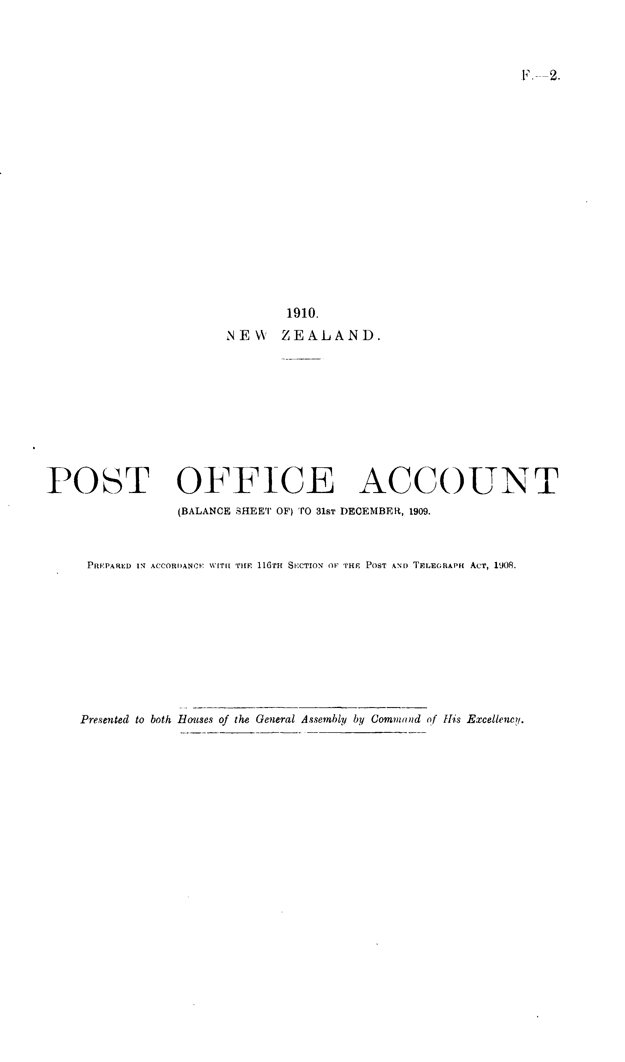POST OFFICE ACCOUNT (BALANCE SHEET OF) TO 31st DECEMBER, 1909. Prepared in accordance with the 116th Section of the Post and Telegraph Act, 1908.