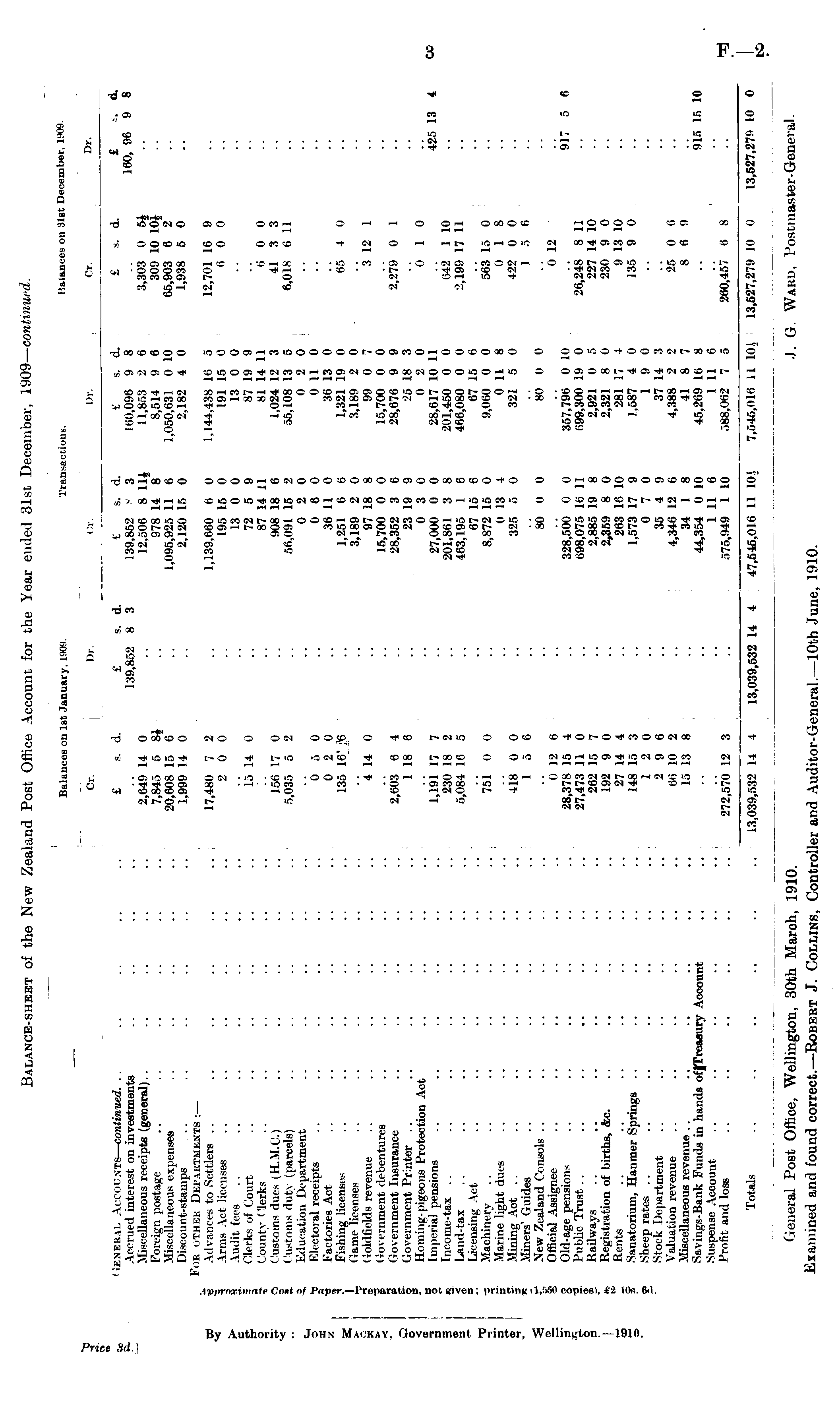 General Post Office, Wellington, 30th March, 1910. J. G. Ward, Postmaster-General. Examined and found correct.— Robert J. Collins, Controller and Auditor-General.— 10th June, 1910.